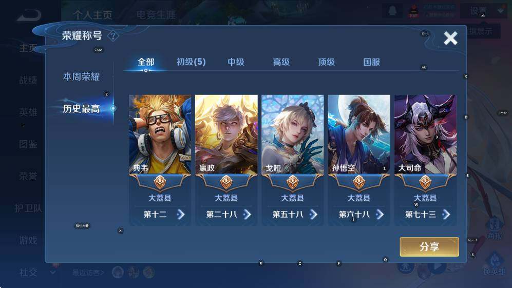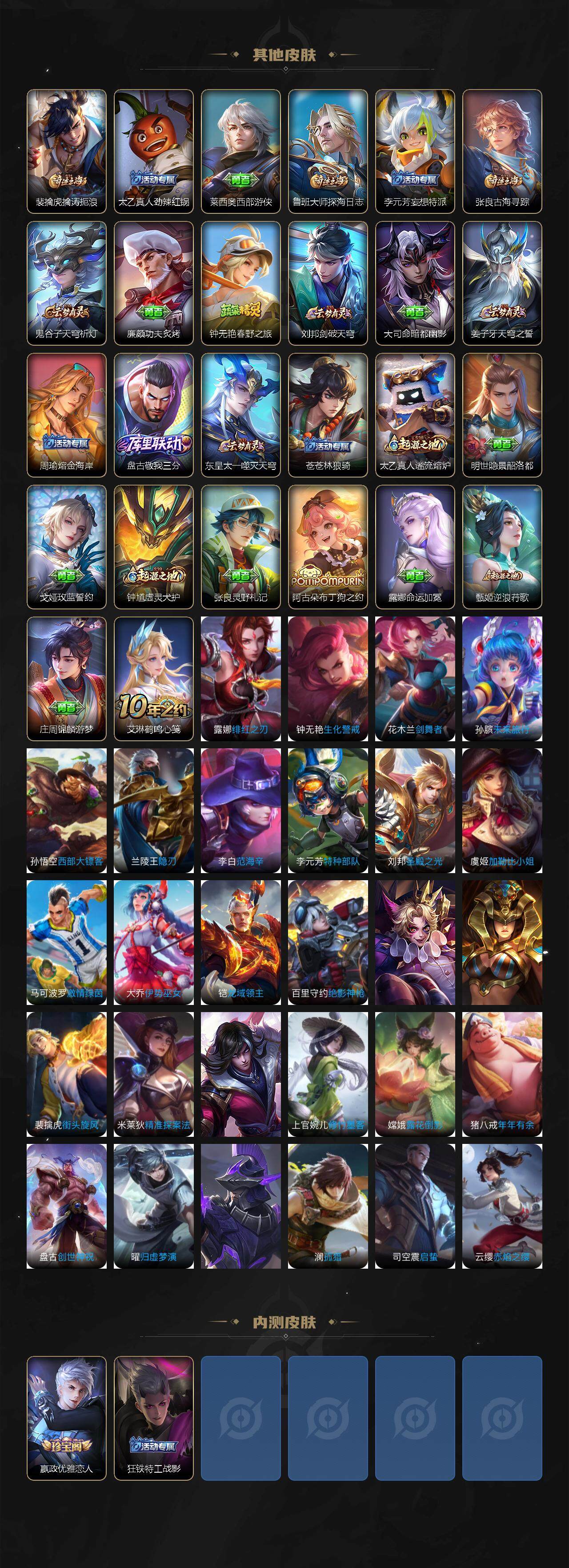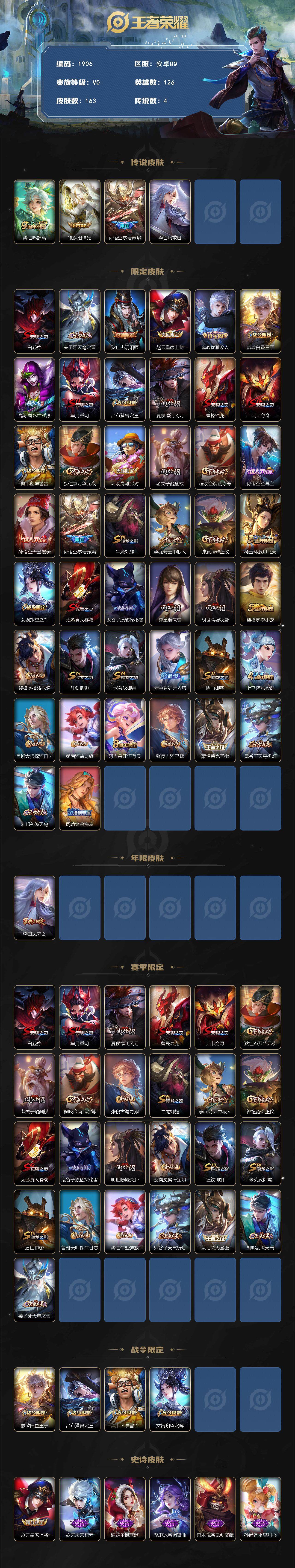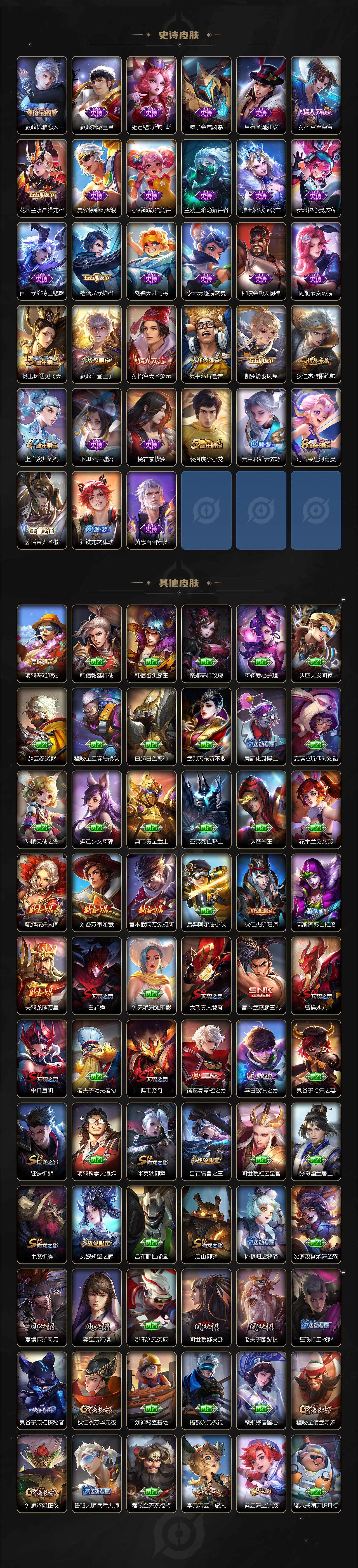 126英雄-163皮肤-贵族0/皮肤163/传说4/史诗39/英雄126/鸣野蒿 桑启/炽阳神光 镜/零号·赤焰 孙悟空/凤求凰 李白/狰 白起/天穹之誓 姜子牙/阴阳师 狄仁杰/皇家上将 赵云/优雅恋人 嬴政/白昼王子 嬴政/死亡摇滚 高渐离/重明 芈月/猎兽之王 吕布/朔风刀 夏侯惇/烛龙 曹操/穷奇 典韦/蓝屏警告 典韦/万华元夜 狄仁杰/海滩派对 项羽/醍醐杖 老夫子/演武夺筹 程咬金/至尊宝 孙悟空/大圣娶