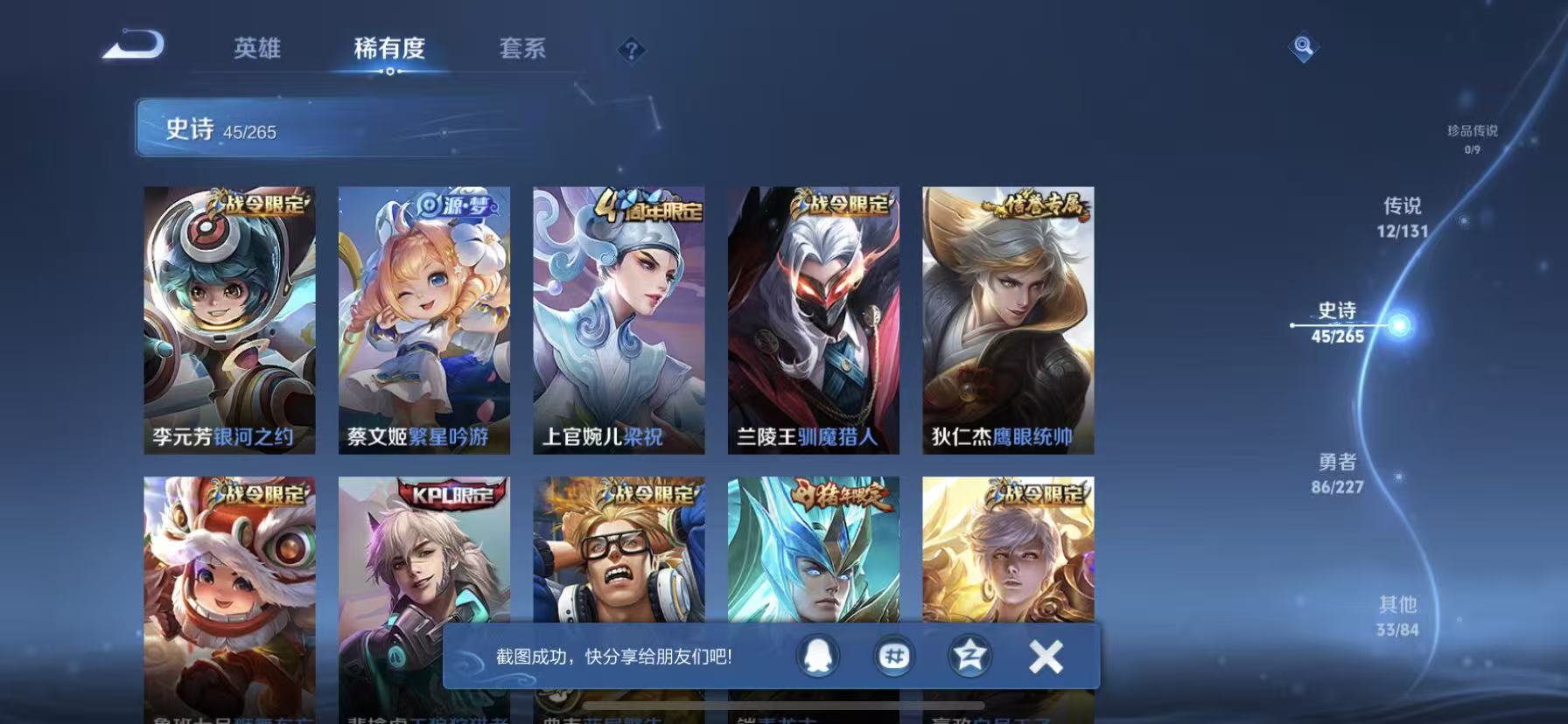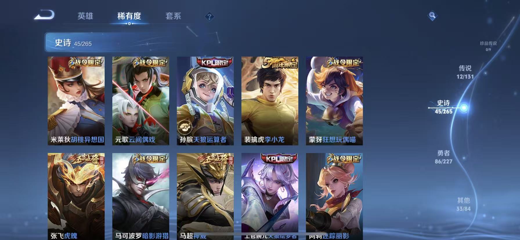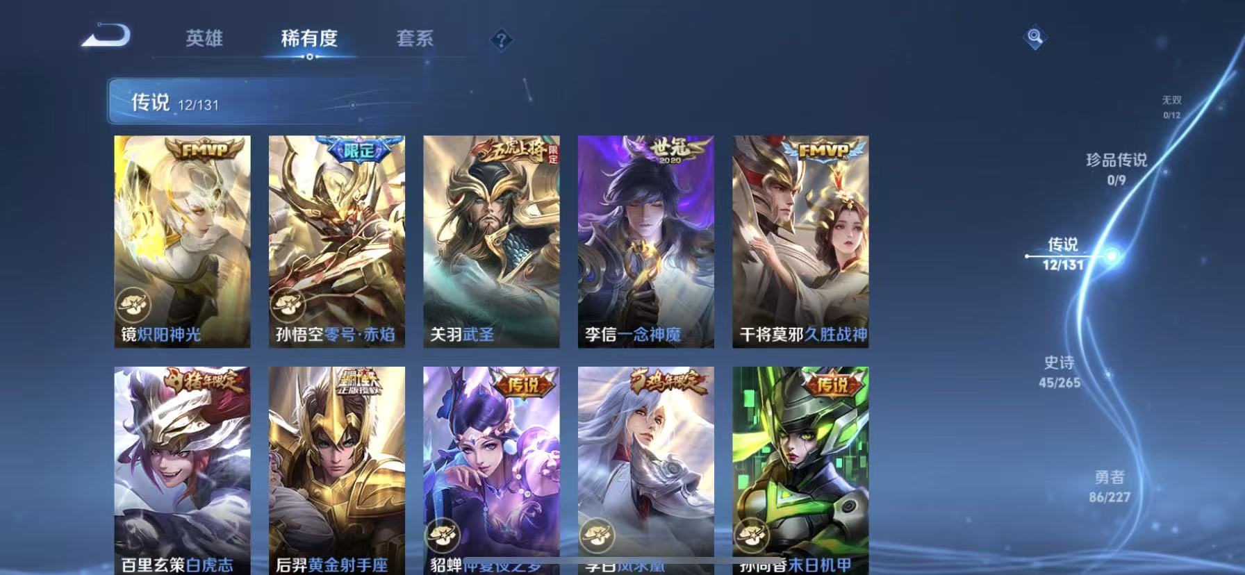 [14878480]【贵族7 176皮肤1星传说12传说238夺宝幸运值】 星传说: 金色仲夏夜 传说皮: 黄金射手座久胜战神炽阳神光一念神魔末日机甲-孙尚香仲夏夜之梦零号·赤焰超时空战士-狄仁杰 限定皮: 遇见飞天李小龙游园惊梦梁祝武圣虎魄天魔缭乱神威天狼狩猎者天狼运算者逐梦之星天狼绘梦者凤求凰白虎志青龙志