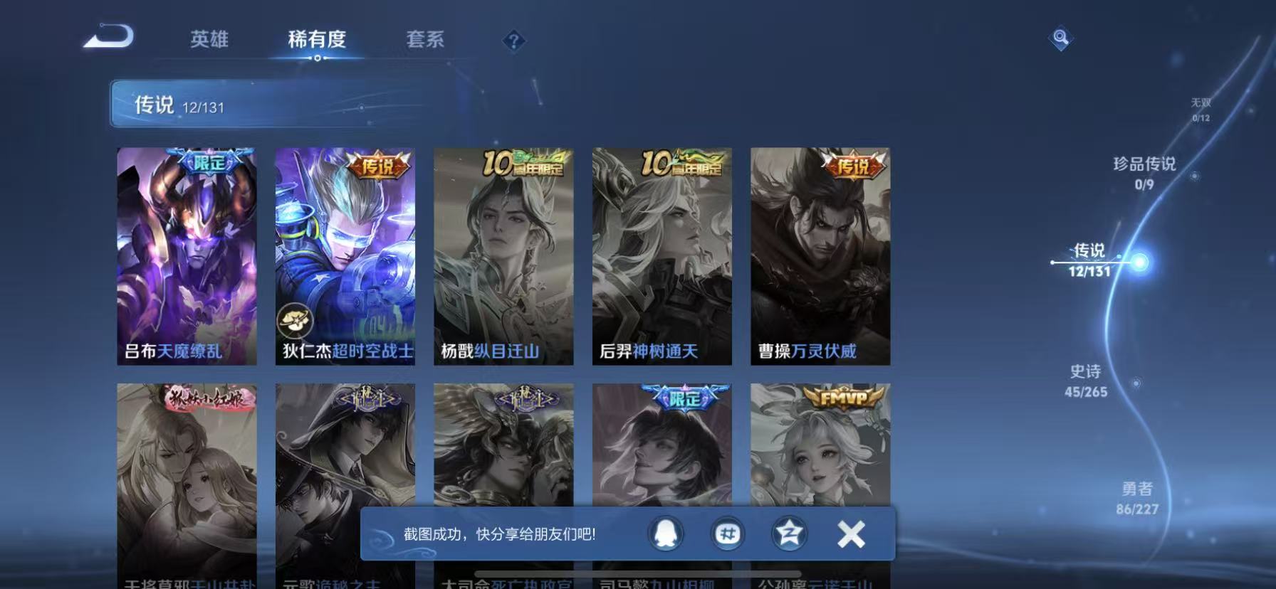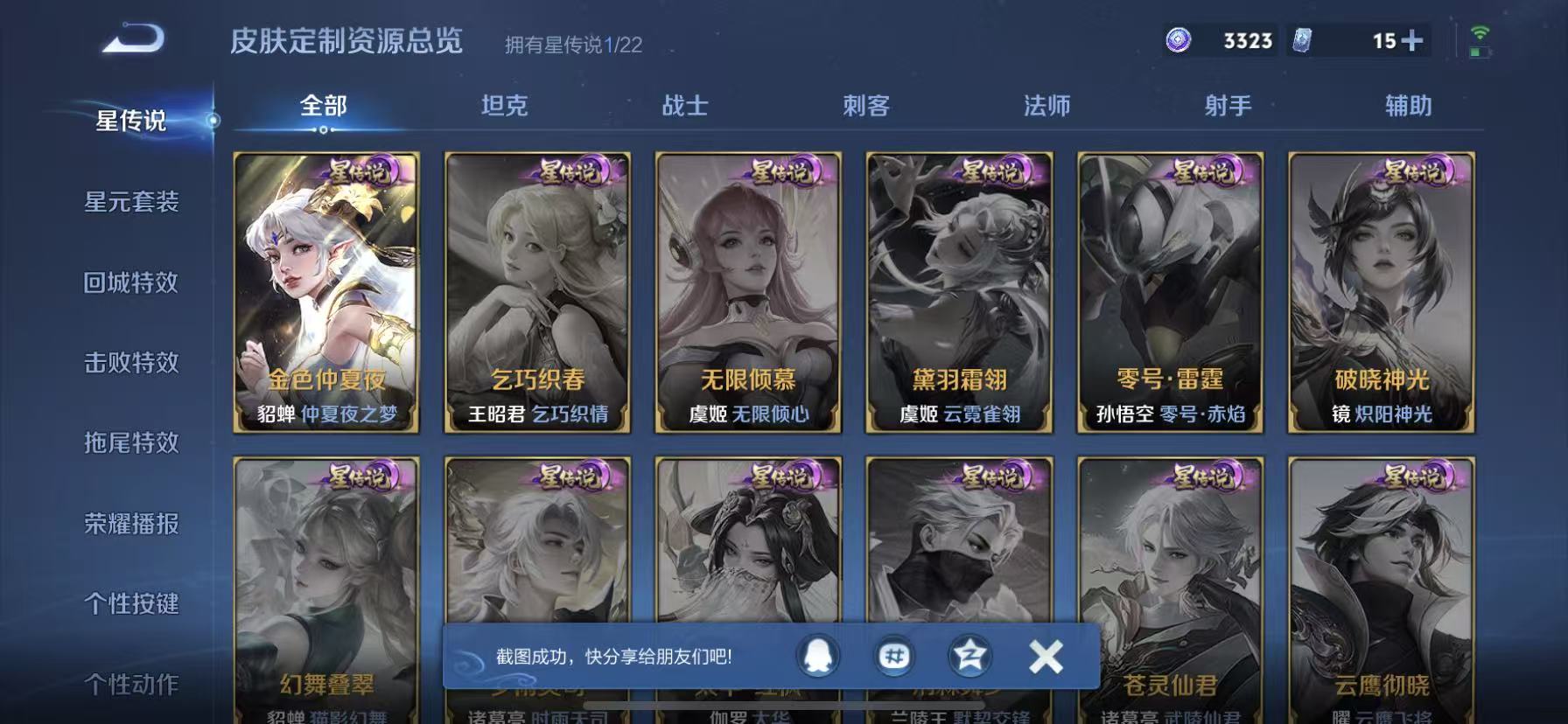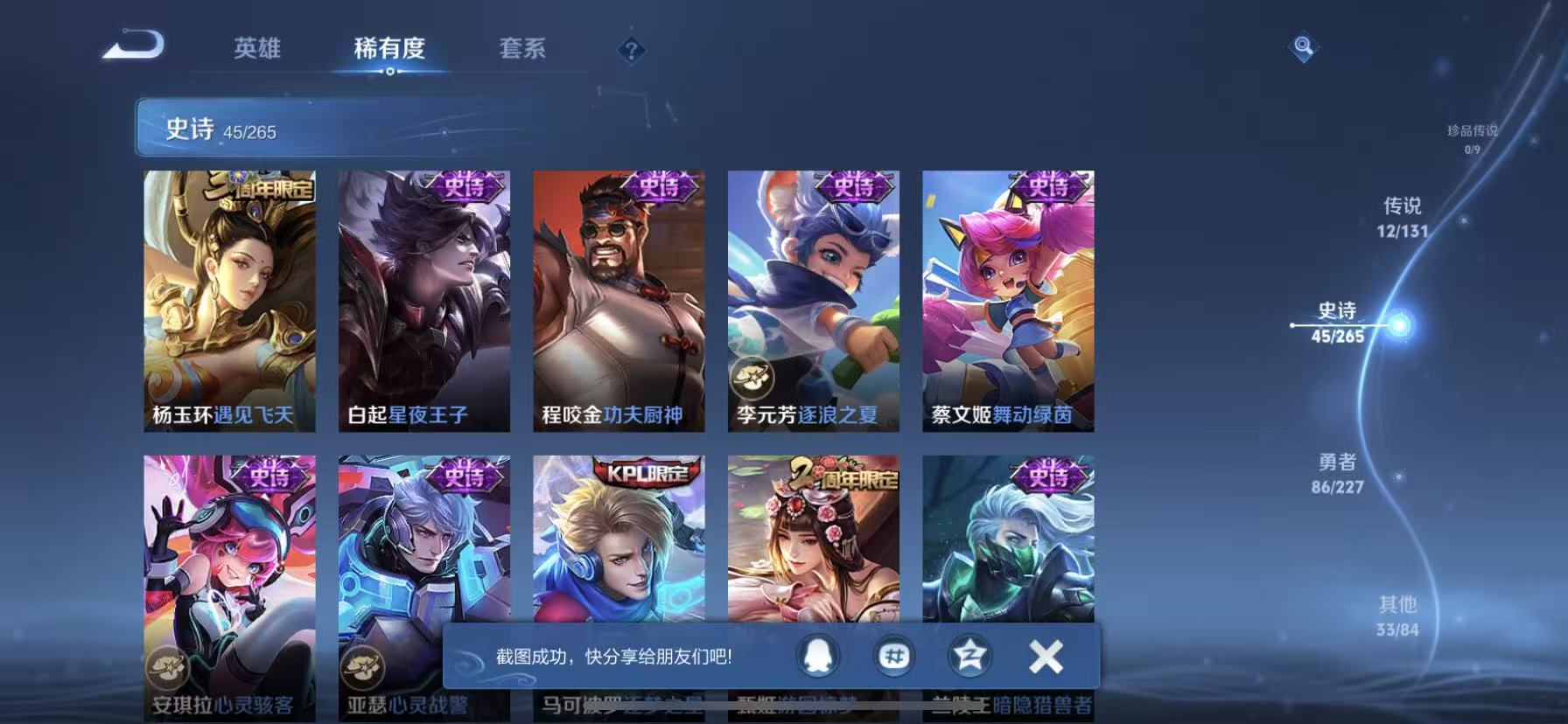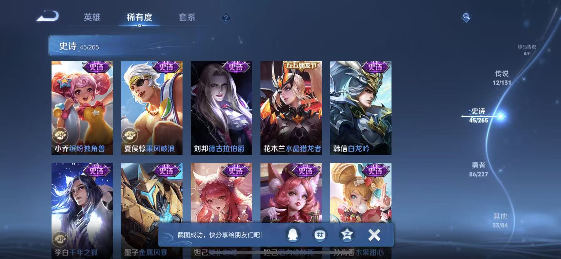 [14878480]【贵族7 176皮肤1星传说12传说238夺宝幸运值】 星传说: 金色仲夏夜 传说皮: 黄金射手座久胜战神炽阳神光一念神魔末日机甲-孙尚香仲夏夜之梦零号·赤焰超时空战士-狄仁杰 限定皮: 遇见飞天李小龙游园惊梦梁祝武圣虎魄天魔缭乱神威天狼狩猎者天狼运算者逐梦之星天狼绘梦者凤求凰白虎志青龙志