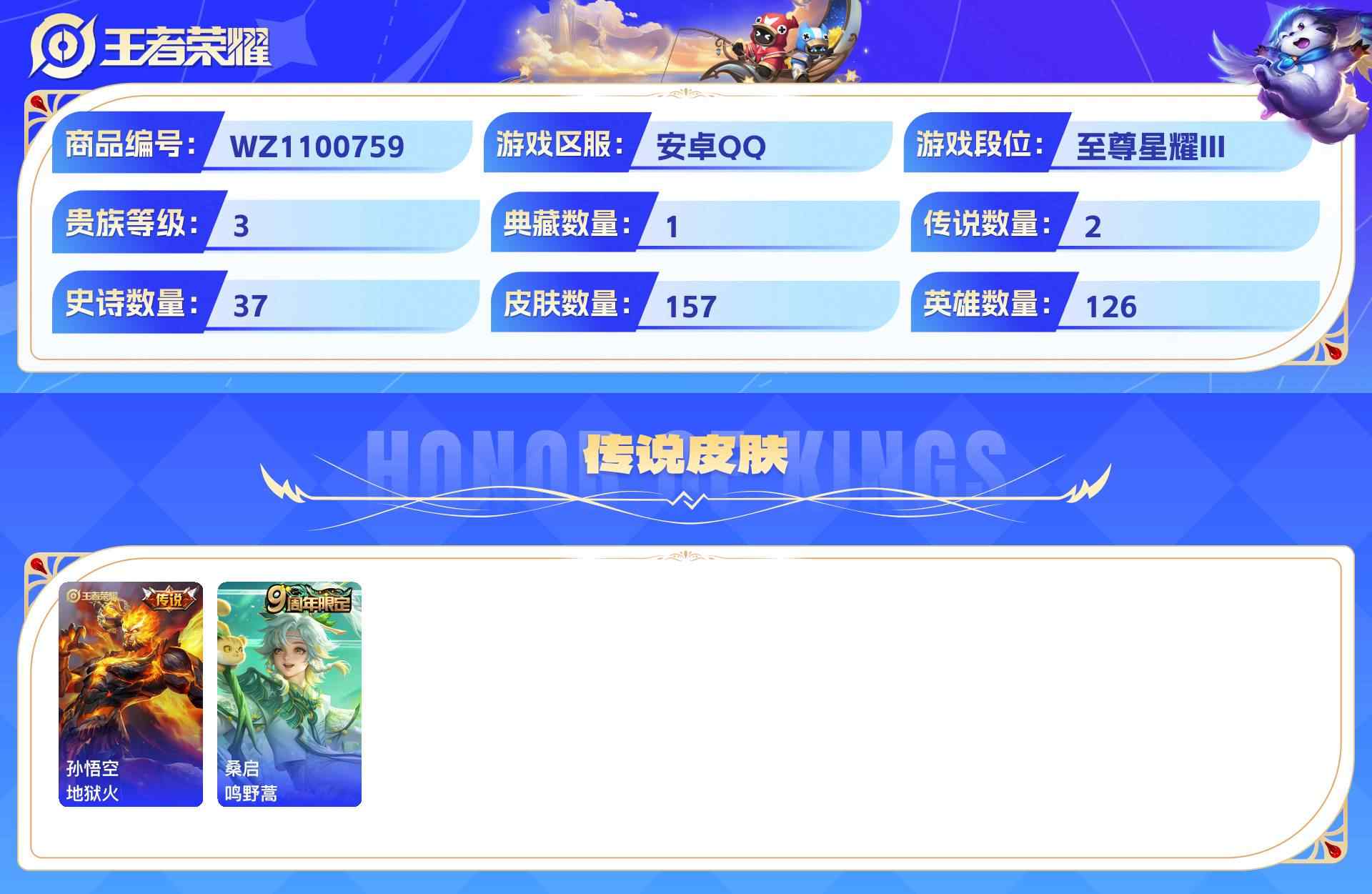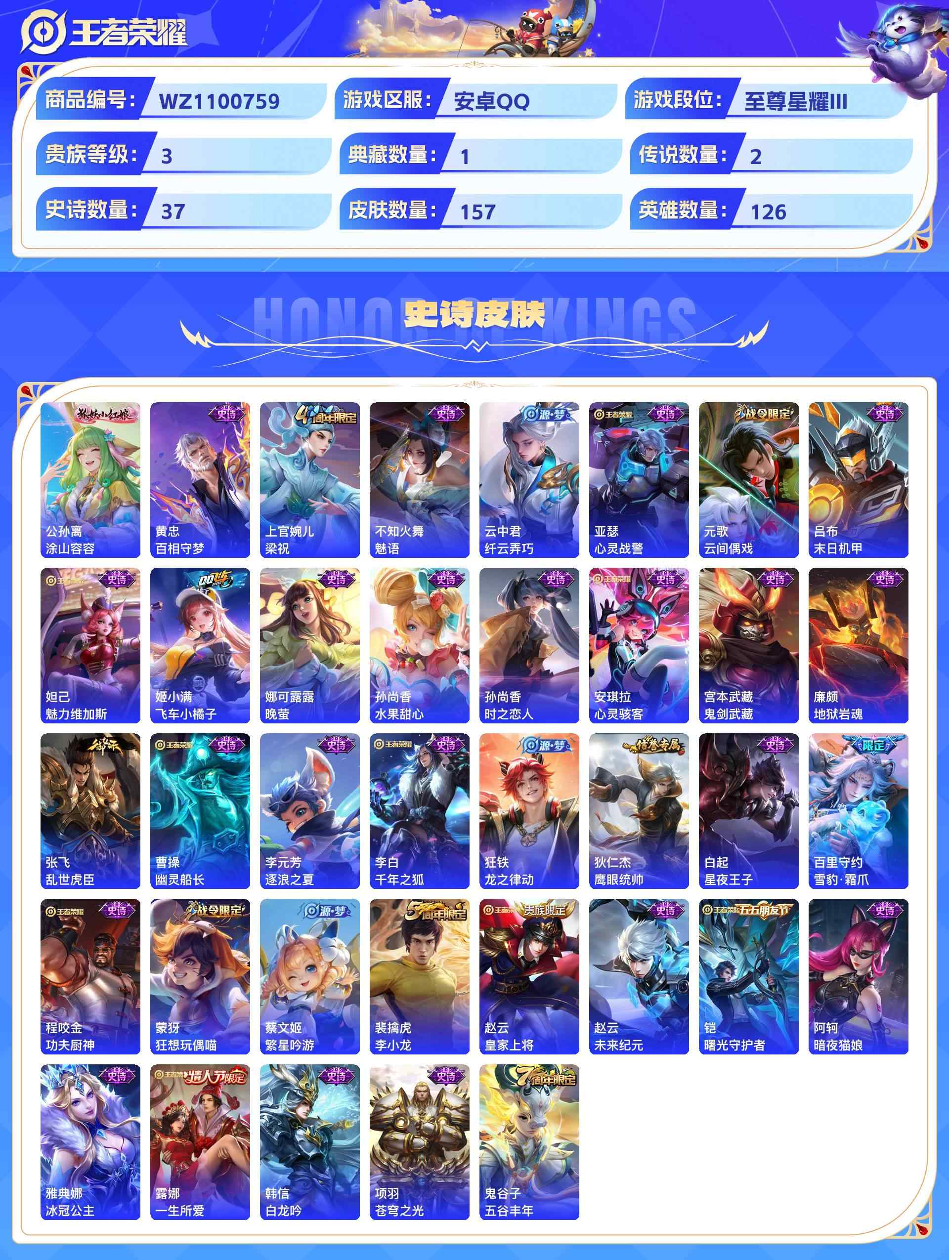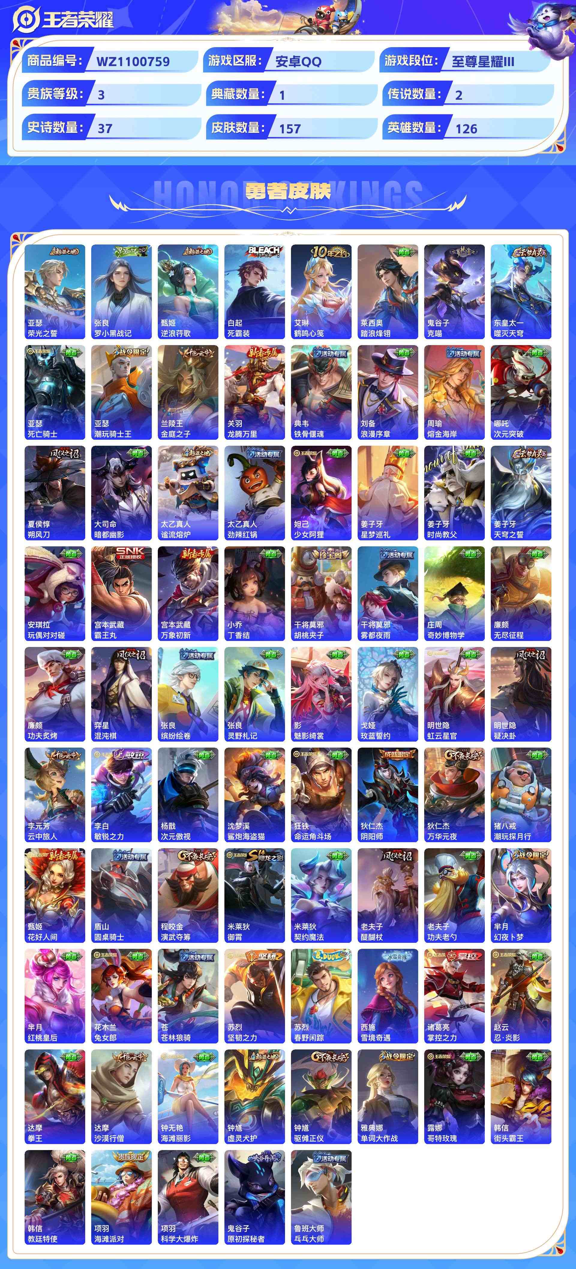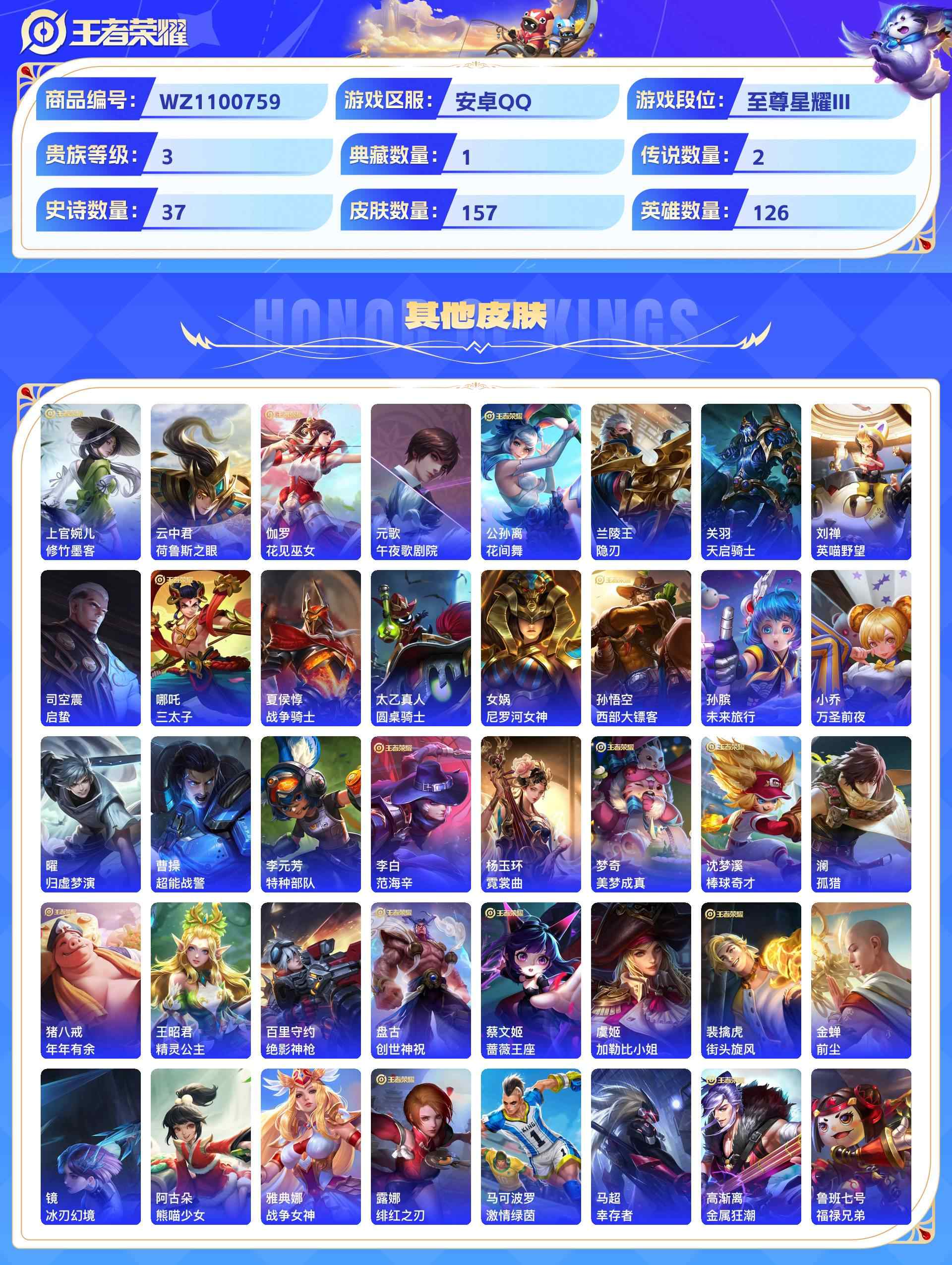 wz1100759|精品脱坑号可二次安卓qq 157皮 贵族3级 1典藏(银白咏叹调) 2传说 37史诗1星传说