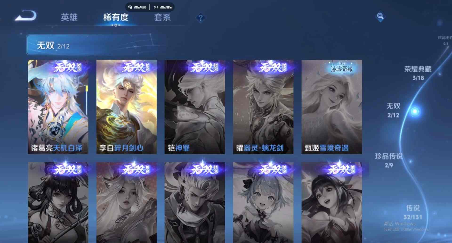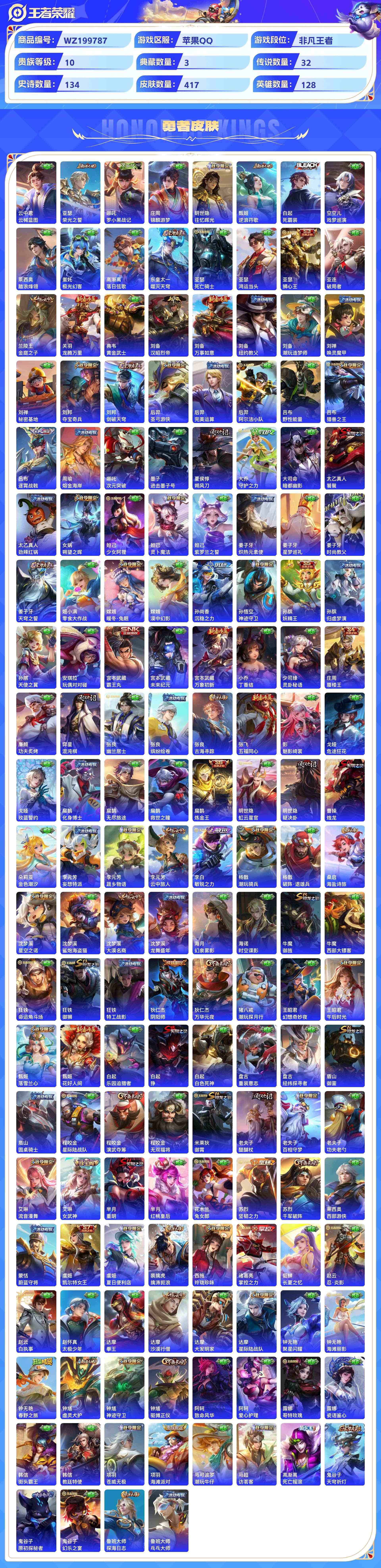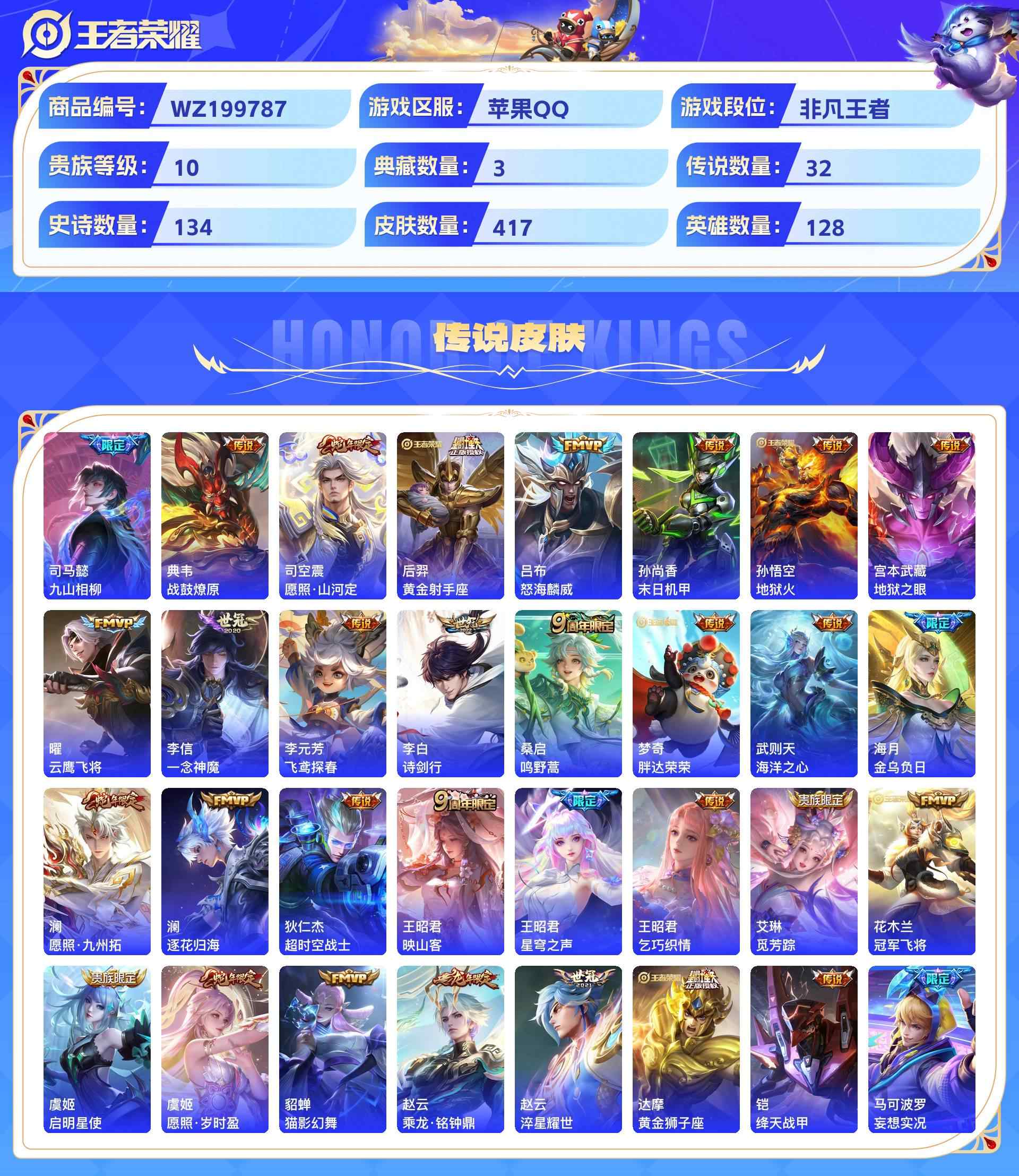wz199787|精品号苹果qq贵族10级 417皮 3典藏(拾光映像星域神启弑呛猎影) 2珍品传说(朽木白哉怪盗基德) 2无双(天机白泽碎月剑心) 32传说 134史诗4星传说23个性按键