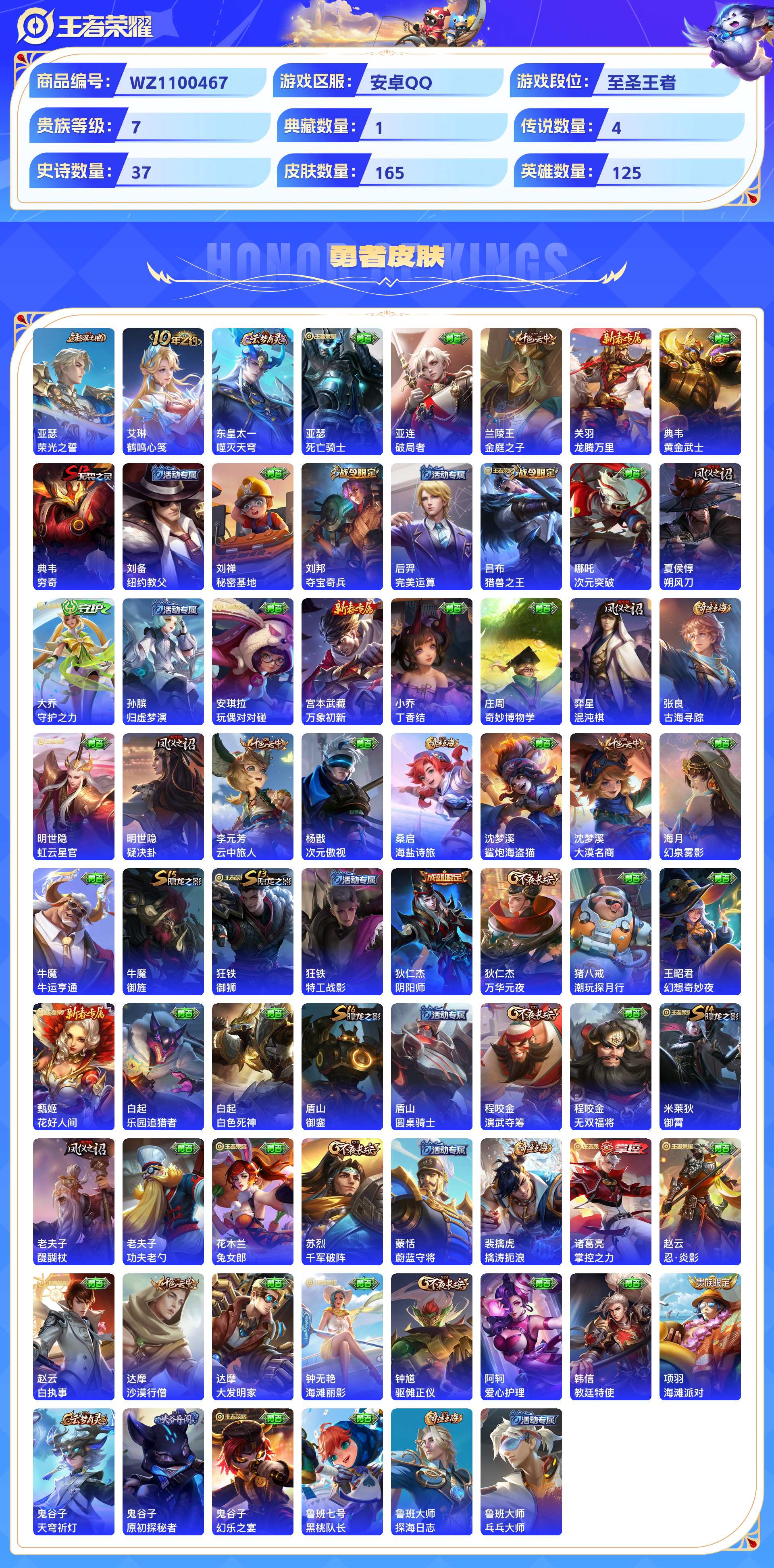 _2323388-安卓qq165皮贵族7级1典藏4传说37史诗【荣耀典藏】星域神启【传说皮肤】音你闪耀久胜战神鸣野蒿无双飞将【史诗皮肤】万灵启世纤云弄巧无心暗隐猎兽者天才门将德古拉伯爵辉光之辰金属风暴魅力维加斯女仆咖啡拒霜思白昼王子蔷薇恋人水果甜心大圣娶亲猫狗日记心灵骇客鬼剑武藏缤纷独角兽顽趣鹰眼统帅魔术师偶像歌手冰雪圆舞曲特工魅影原初追逐者功夫厨神荣光圣徽舞动绿茵圣诞恋歌皇家上将王者之锤江河有灵迷踪丽影黎明之约五谷丰年电玩小子【勇者皮肤】荣光之誓鹤鸣心笺噬灭天穹死亡骑士破局者金庭之子龙腾万里黄金武士穷奇纽约教父秘密基地夺宝奇兵完美运算猎兽之王次元突破朔风刀守护之力归虚梦演玩偶对对碰万象初新丁香结奇妙博物学混沌棋古海寻踪虹云星官疑决卦云中旅人次元傲视海盐诗旅鲨炮海盗猫大漠名商幻泉雾影牛运亨通御旌御狮特工战影阴阳师万华元夜潮玩探月行幻想奇妙夜花好人间乐园追猎者白色死神御銮圆桌骑士演武夺筹无双福将御霄醍醐杖功夫老勺兔女郎千军破阵蔚蓝守将擒涛扼浪掌控之力忍·炎影白执事沙漠行僧大发明家海滩丽影驱傩正仪爱心护理教廷特使海滩派对天穹祈灯原初探秘者幻乐之宴黑桃队长探海日志乓乓大师【其他皮肤】修竹墨客赤焰之缨花见巫女午夜歌剧院花间舞隐刃天启骑士英喵野望启蛰三太子伊势巫女尼罗河女神露花倒影西部大镖客海之征途未来旅行万圣前夜第七人偶踏雪寻梅一千零一夜归虚梦演死神来了超能战警灼热之刃特种部队范海辛埃及法老霓裳曲画中游美梦成真棒球奇才年年有余精灵公主森绝影神呛威尼斯狂欢创世神祝剑舞者维京掠夺者爱与和平秩序猎龙将蔷薇王座归虚梦演星航指挥官地府判官龙域领主熊喵少女战争女神绯红之刃激情绿茵幸存者木偶奇遇记芝加哥教父