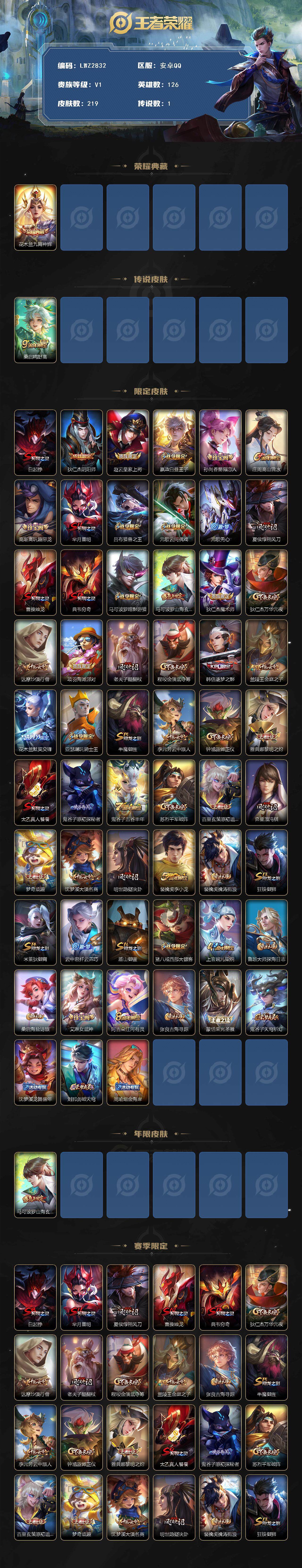 126英雄-219皮肤-安卓q-v1-最强王者段位-126英雄-219皮肤-1典藏皮肤-1传说-49史诗 【荣耀典藏】:花木兰九霄神辉 【传说皮肤】:桑启鸣野蒿 【限定皮肤】:白起狰,狄仁杰阴阳师,赵云皇家上将,嬴政白昼王子,孙尚香蔷薇恋人,庄周高山流水,高渐离玩趣恶龙,芈月重明,吕布猎兽之王,元歌云间偶戏,元歌无心,夏侯
