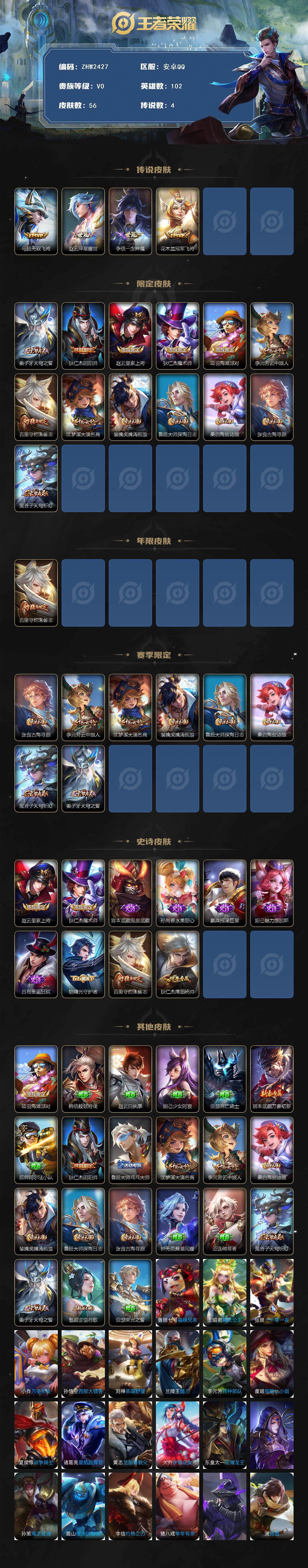 可二次【店主推荐捡漏号!可直接换绑】安卓q-v6-永恒钻石i段位-102英雄-56皮肤-4传说-10史诗 【传说皮肤】:马超无双飞将,赵云淬星耀世,李信一念神魔,花木兰冠军飞将 【限定皮肤】:姜子牙天穹之誓,狄仁杰阴阳师,赵云皇家上将,狄仁杰魔术师,项羽海滩派对,李元芳云中旅人,百里守约朱雀志,沈梦溪大漠名商,裴擒虎擒涛扼浪,鲁班大师探海日志,桑启海盐诗旅,张良古海寻踪,鬼谷子天穹祈灯 【年限皮肤】:百里守约朱雀志 【赛季限定】:张良古海寻踪,李元芳云中旅人,沈梦溪大漠名商,裴擒虎擒涛扼浪,鲁班大师探海日志,桑启海盐诗旅,鬼谷子天穹祈灯,姜子牙天穹之誓 【史诗皮肤】:赵云皇家上将,狄仁杰魔术师,宫本武藏鬼剑武藏,孙尚香水果甜心,嬴政摇滚巨星,妲己魅力维加斯,吕布圣诞狂欢,铠曙光守护者,百里守约朱雀志,狄仁杰鹰眼统帅 【其他皮肤】:项羽海滩派对,韩信教廷特使,赵云白执事,妲己少女阿狸,亚瑟死亡骑士,宫本武藏万象初新,后羿阿尔法小队,狄仁杰阴阳师,鲁班大师乓乓大师,沈梦溪大漠名商,李元芳云中旅人,桑启海盐诗旅,裴擒虎擒涛扼浪,鲁班大师探海日志,张良古海寻踪,钟无艳聚星闪耀,亚连破局者,鬼谷子天穹祈灯,姜子牙天穹之誓,甄姬逆浪荇歌,亚瑟荣光之誓,鲁班七号福禄兄弟,王昭君精灵公主,张良一千零一夜,小乔万圣前夜,孙悟空西部大镖客,刘禅英喵野望,兰陵王隐刃,李元芳特种部队,虞姬加勒比小姐,夏侯惇战争骑士,诸葛亮星航指挥官,黄忠芝加哥教父,大乔伊势巫女,东皇太一东海龙王,明世隐占星师,孙策海之征途,盾山极冰防御线,李信灼热之刃,猪八戒年年有余,蒙恬秩序猎龙将,澜孤猎 【营地id】:1575266304