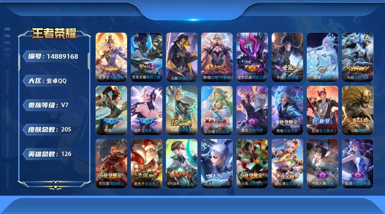 [14889168]v7-126英雄-205皮肤-1典藏皮肤-8传说-64史诗,,星币3600,,yh7039 【英雄全皮】:元歌全皮,孙权全皮,鬼谷子全皮,李信全皮 【荣耀典藏】:花木兰九霄神辉 【传说皮肤】:元歌诡秘之主,露娜霜月吟,花木兰燃星之曲,李信山海炽霜斩,马超无双飞将,女娲补天,李信一念神魔,宫本武藏地狱之眼 【限定皮肤】:狄仁杰阴阳师,赵云皇家上将,墨子神迹守卫,高渐离死亡摇滚,高渐离玩趣恶龙,钟无艳超时空战士,芈月幻夜卜梦,元歌云间偶戏,元歌无心,甄姬落雪兰心,马可波罗山海玄木吟,狄仁杰魔术师,狄仁杰万华元夜,达摩星际陆战队,达摩沙漠行僧,项羽海滩派对,老夫子圣诞老人,老夫子醍醐杖,老夫子航海奇遇记,程咬金演武夺筹,兰陵王金庭之子,花木兰默契交锋,花木兰燃星之曲,亚瑟潮玩骑士王,后羿如梦令,李元芳云中旅人,钟馗驱傩正仪,杨玉环遇见飞天,女娲补天,雅典娜黎明之约,鬼谷子原初探秘者,鬼谷子五谷丰年,黄忠火炮绅士,苏烈千军破阵,百里玄策原初追逐者,梦奇顽趣,沈梦溪大漠名商,明世隐疑决卦,裴擒虎李小龙,裴擒虎擒涛扼浪,米莱狄胡桃异想国,李信山海炽霜斩,嫦娥拒霜思,嫦娥暖冬兔眠,西施玲珑珍味,鲁班大师探海日志,镜匿光追影者,桑启海盐诗旅,暃星界游侠,戈娅驭风魔法,艾琳流音漫舞,司空震地狱燃心,阿古朵江河有灵,张良古海寻踪,蒙犽百解令,蒙恬荣光圣徽,鬼谷子天穹祈灯,姬小满妄想食味,沈梦溪龙舞盛年,刘邦剑破天穹 【年限皮肤】:马超神威,马可波罗山海玄木吟,李信山海炽霜斩 【赛季限定】:狄仁杰万华元夜,达摩沙漠行僧,老夫子醍醐杖,程咬金演武夺筹,兰陵王金庭之子,张良古海寻踪,李元芳云中旅人,钟馗驱傩正仪,雅典娜黎明之约,鬼谷子原初探秘者,苏烈千军破阵,百里玄策原初追逐者,梦奇顽趣,沈梦溪大漠名商,明世隐疑决卦,裴擒虎擒涛扼浪,鲁班大师探海日志,桑启海盐诗旅,鬼谷子天穹祈灯,蒙恬荣光圣徽,刘邦剑破天穹 【战令限定】:墨子神迹守卫,钟无艳超时空战士,芈月幻夜卜梦,元歌云间偶戏,甄姬落雪兰心,达摩星际陆战队,老夫子航海奇遇记,艾琳流音漫舞,亚瑟潮玩骑士王,黄忠火炮绅士,米莱狄胡桃异想国,嫦娥暖冬兔眠,西施玲珑珍味,司空震地狱燃心,暃星界游侠,戈娅驭风魔法 【史诗皮肤】:阿轲暗夜猫娘,赵云皇家上将,貂蝉圣诞恋歌,老夫子圣诞老人,甄姬冰雪圆舞曲,狄仁杰魔术师,廉颇地狱岩魂,宫本武藏鬼剑武藏
