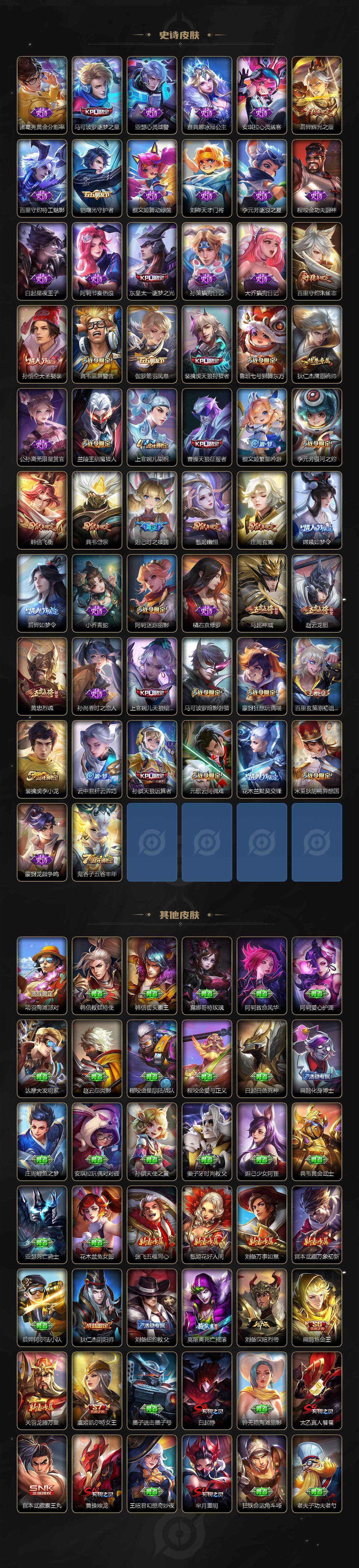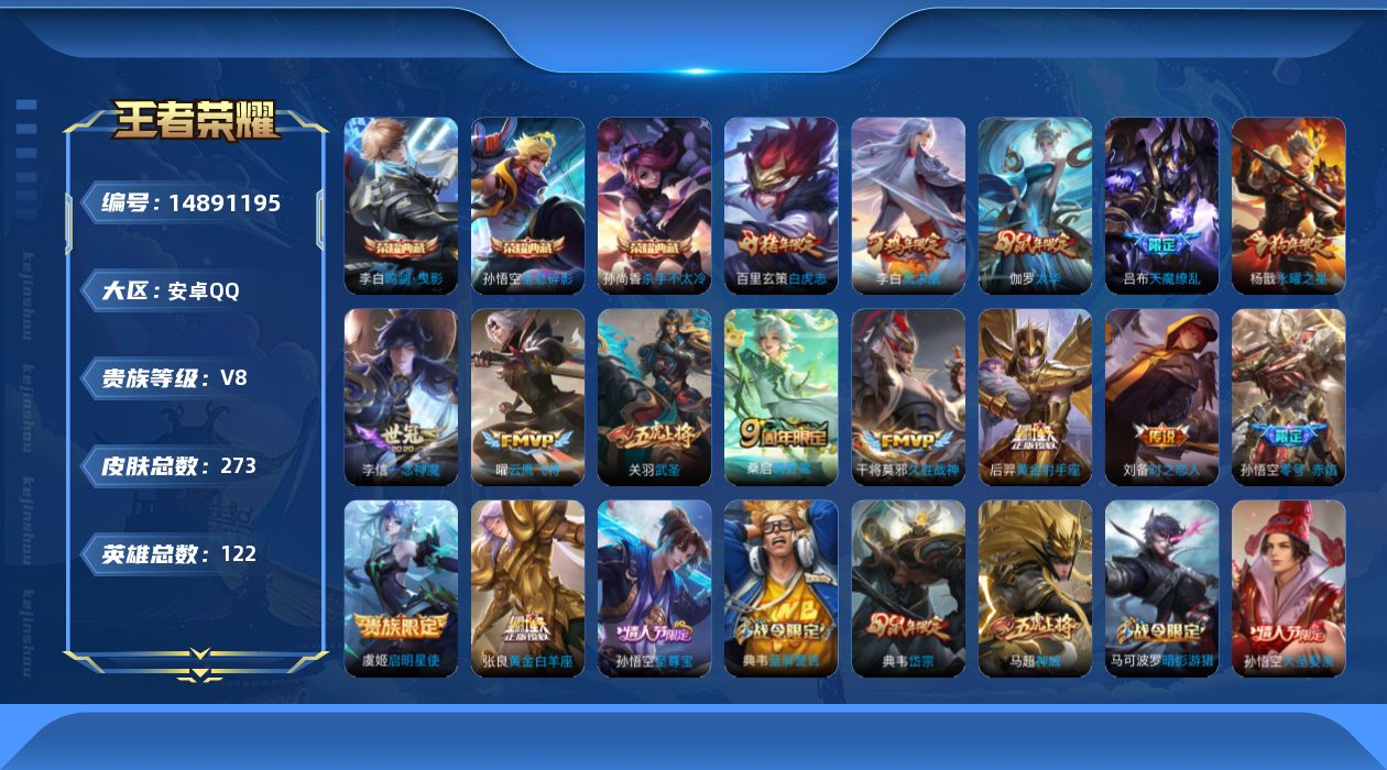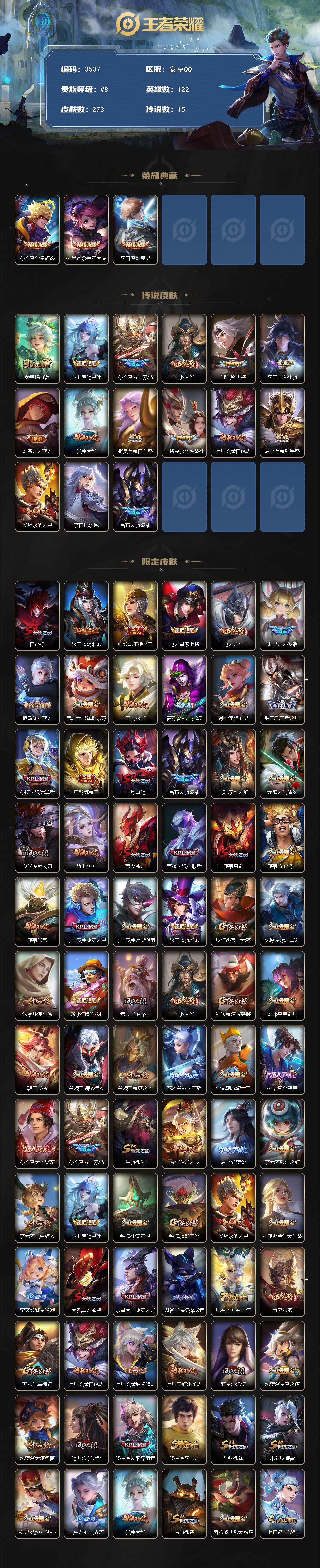 [14891195]安卓q-v0-秩序白银ii段位-122英雄-273皮肤-3典藏皮肤-15传说-86史诗 【荣耀典藏】:孙悟空全息碎影,孙尚香杀手不太冷,李白鸣剑曳影 【传说皮肤】:桑启鸣野蒿,虞姬启明星使,孙悟空零号赤焰,关羽武圣,曜云鹰飞将,李信一念神魔,刘备时之恋人,伽罗太华,张良黄金白羊座,干将莫邪久胜战神,百里玄策白虎志,后羿黄金射手座,杨戬永曜之星,李白凤求凰,吕布天魔缭乱 【限定皮肤】:白起狰,狄仁杰阴阳师,虞姬凯尔特女王,赵云皇家上将,赵云龙胆,妲己时之彼端,嬴政优雅恋人,鲁班七号狮舞东方,庄周玄嵩,高渐离死亡摇滚,阿轲迷踪丽影,钟无艳王者之锤,孙膑天狼运算者,扁鹊炼金王,芈月重明,吕布天魔缭乱,周瑜赤莲之焰,元歌云间偶戏,夏侯惇朔风刀,甄姬幽恒,曹操烛龙,曹操天狼征服者,典韦穷奇,典韦蓝屏警告,典韦岱宗,马可波罗逐梦之星,马可波罗暗影游猎,狄仁杰魔术师,狄仁杰万华元夜,达摩星际陆战队,达摩沙漠行僧,项羽海滩派对,老夫子醍醐杖,关羽武圣,程咬金演武夺筹,刘邦夺宝奇兵,韩信飞衡,兰陵王驯魔猎人,兰陵王金庭之子,花木兰默契交锋,亚瑟潮玩骑士王,孙悟空至尊宝,孙悟空大圣娶亲,孙悟空零号赤焰,牛魔御旌,后羿辉光之辰,后羿如梦令,李元芳银河之约,李元芳云中旅人,虞姬启明星使,钟馗神迹守卫,钟馗驱傩正仪,杨戬永曜之星,雅典娜单词大作战,蔡文姬繁星吟游,太乙真人饕餮,东皇太一逐梦之光,鬼谷子原初探秘者,鬼谷子五谷丰年,黄忠烈魂,苏烈千军破阵,百里玄策白虎志,百里玄策原初追逐者,百里守约朱雀志,弈星混沌棋,沈梦溪星空之诺,沈梦溪大漠名商,明世隐疑决卦,裴擒虎天狼狩猎者,裴擒虎李小龙,狂铁御狮,米莱狄御霄,米莱狄胡桃异想国,云中君纤云弄巧,伽罗太华,盾山御銮,猪八戒西部大镖客,上官婉儿梁祝,上官婉儿天狼绘梦者,嫦娥如梦令,蒙犽狂想玩偶喵,桑启海盐诗旅,张良古海寻踪,鬼谷子天穹祈灯 【年限皮肤】:百里玄策白虎志,百里守约朱雀志,李白凤求凰,杨戬永曜之星,后羿辉光之辰,伽罗太华,甄姬幽恒,韩信飞衡,典韦岱宗,庄周玄嵩,马超神威,关羽武圣,黄忠烈魂,赵云龙胆 【赛季限定】:扁鹊炼金王,白起狰,芈月重明,夏侯惇朔风刀,曹操烛龙,典韦穷奇,狄仁杰万华元夜,达摩沙漠行僧,老夫子醍醐杖,程咬金演武夺筹,兰陵王金庭之子,张良古海寻踪,牛魔御旌,李元芳云中旅人,虞姬凯尔特女王,钟馗驱傩正仪,太乙真人饕