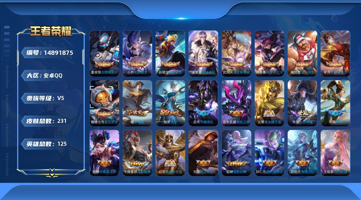 [14891875]可二次 皇冠号 贵族10-贵族积分198358-231皮9典藏21传说 安卓手q18区231皮9典藏21传说0无双v10 营地id240635184秩序白银iii【荣耀典藏】:星域神启活力突击星空梦想倪克斯神谕无限飓风号全息碎影天鹅之梦大秦宣太后杀手不太冷【优质限定皮肤】:神威天魔缭乱【传说皮肤】:觅芳踪乞巧织情补天李 音你心动飞鸢