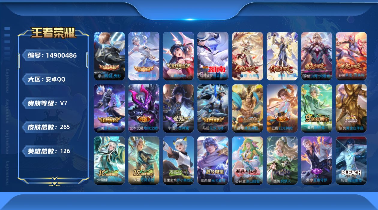 [14900486]v7 2典藏 1无双 1珍品传说 13传说 126英雄 265皮肤 可修改实名 【英雄全皮】李信全皮少司缘全皮司空震全皮蒙恬全皮敖隐全皮孙权全皮蚩奼全皮戈娅全皮影全皮 【稀有英雄】大司命敖隐小龙人夏洛特夏师傅金蝉唐僧戈娅赵云韩信韩跳跳艾琳不知火舞娜可露露鸟人橘右京橘子 【荣耀水晶】最初的交响伽罗典藏鸣剑·曳影 【无双皮】真我赫兹瑶瑶无双 【珍品传说】怪盗基德 【传说皮】山海·炽霜斩李信年限一念神魔乘龙·淬吴钩孙策年限神树通天遇见神鼓地狱之眼黄金白羊座无双飞将澜逐花归海幻光神呛 【珍宝阁皮】蔷薇恋人万物之道 【赛季/战令皮】剑破天穹s35火炮绅士星空之诺落雪兰心大漠名商s28超时空战士-钟无艳千军破阵s25沙漠行僧s26狮舞东方天穹之誓s36地狱燃心金庭之子s27噬灭天穹s37驭风魔法擒涛扼浪s31探海日志s32流音漫舞玲珑珍味天穹祈灯s34古海寻踪s33海盐诗旅s30幻夜卜梦云中旅人s29虞姬夏日便利店胡桃异想国顽趣-梦奇驱傩正仪s24 【史诗皮】乘风破浪化蝶舞百相守梦-黄忠月团寄思曙光守护者幽灵船长箭羽风息地狱岩魂乱世虎臣缤纷独角兽青蛇石田雨龙江河有灵水果甜心魅语星界战将器灵·浮梦炉圣诞狂欢紫霞仙子末日机甲-吕布涂山红红巫礼祀神黄金分割率电玩·爆裂旋风天才门将战舞者无心鬼剑武藏暗隐猎兽者破空之剑圣诞恋歌涂山容容谪仙醉月水晶猎龙者千年之狐永昼百解令蒙犽蒙犽顽岩魄星夜王子织梦人心灵战警万灵启世摇滚巨星暗夜贵公子鹰眼统帅光弋星穹功夫厨神原初追逐者罗小黑战记-百里玄策冰冠公主未来纪元-赵云纤云弄巧黎明之约百相守梦-百里守约东方月初特工魅影逐浪之夏金属风暴赏金猎手女仆咖啡魅力维加斯蒙恬荣光圣徽偶像歌手拒霜思修罗龙之律动 【限定皮】游园惊梦愿照·山河定司空震年限李小龙山海·玄木吟马可年限陌上桑五谷丰年鸣野蒿至尊宝愿照·九州拓澜年限 【普通皮】伊势巫女落日弦歌虎啸剑宗刘邦虎啸剑宗前尘