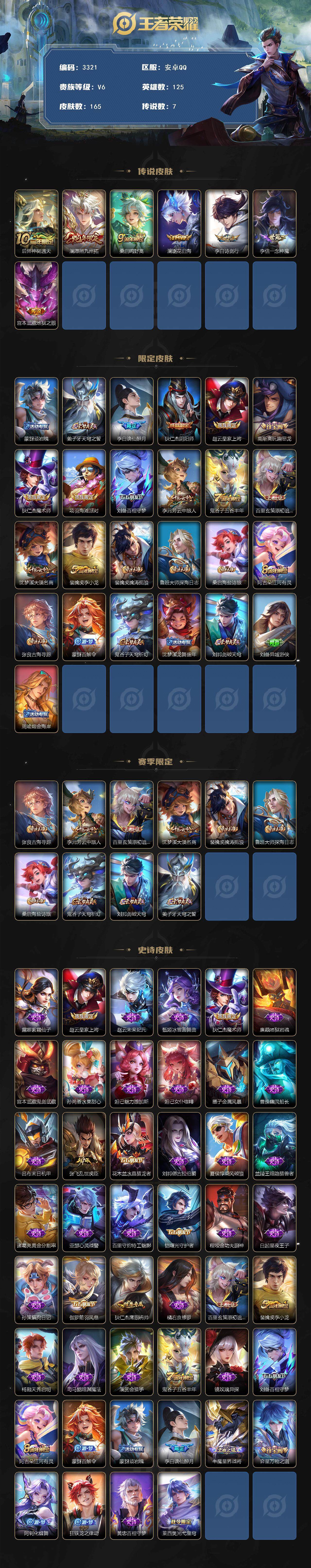 [14900758]安卓q-v6-最强王者段位-125英雄-165皮肤-7传说-46史诗 【传说皮肤】:后羿神树通天,澜愿照九州拓,桑启鸣野蒿,澜逐花归海,李白诗剑行,李信一念神魔,宫本武藏地狱之眼 【限定皮肤】:蒙犽顽岩魄,姜子牙天穹之誓,李白谪仙醉月,狄仁杰阴阳师,赵云皇家上将,高渐离玩趣恶龙,狄仁杰魔术师,项羽海滩派对,刘备百相守梦,李元芳云中旅人,鬼谷子五谷丰年,百里玄策原初追逐者,沈梦溪大漠名商,裴擒虎李小龙,裴擒虎擒涛扼浪,鲁班大师探海日志,桑启海盐诗旅,阿古朵江河有灵,张良古海寻踪,蒙犽百解令,鬼谷子天穹祈灯,沈梦溪龙舞盛年,刘邦剑破天穹,刘备异域游侠,周瑜熔金海岸 【赛季限定】:张良古海寻踪,李元芳云中旅人,百里玄策原初追逐者,沈梦溪大漠名商,裴擒虎擒涛扼浪,鲁班大师探海日志,桑启海盐诗旅,鬼谷子天穹祈灯,刘邦剑破天穹,姜子牙天穹之誓 【史诗皮肤】:露娜紫霞仙子,赵云皇家上将,赵云未来纪元,甄姬冰雪圆舞曲,狄仁杰魔术师,廉颇地狱岩魂,宫本武藏鬼剑武藏,孙尚香水果甜心,妲己魅力维加斯,妲己女仆咖啡,墨子金属风暴,曹操幽灵船长,吕布末日机甲,张飞乱世虎臣,花木兰水晶猎龙者,刘邦德古拉伯爵,夏侯惇乘风破浪,兰陵王暗隐猎兽者,诸葛亮黄金分割率,亚瑟心灵战警,百里守约特工魅影,铠曙光守护者,程咬金功夫厨神,白起星夜王子,孙策猫狗日记,伽罗箭羽风息,狄仁杰鹰眼统帅,橘右京修罗,百里玄策原初追逐者,裴擒虎李小龙,杨戬天秀启明,司马懿暗渊魔法,澜赏金猎手,鬼谷子五谷丰年,镜玫瑰异探,刘备百相守梦,阿古朵江河有灵,蒙犽百解令,蒙犽顽岩魄,李白谪仙醉月,牛魔星界战将,弈星万物之道,阿轲化蝶舞,狂铁龙之律动,黄忠百相守梦,莱西奥光弋星穹 【其他皮肤】:项羽海滩派对,韩信教廷特使,韩信街头霸王,阿轲爱心护理,赵云白执事,赵云忍炎影,白起白色死神,牛魔西部大镖客,武则天东方不败,扁鹊化身博士,扁鹊救世之瞳,宫本武藏未来纪元,孙膑天使之翼,姜子牙时尚教父,妲己少女阿狸,典韦黄金武士,亚瑟死亡骑士,达摩拳王,花木兰兔女郎,张飞五福同心,甄姬花好人间,刘备万事如意,宫本武藏万象初新,后羿阿尔法小队,狄仁杰阴阳师,刘备纽约教父,关羽龙腾万里,狂铁命运角斗场,老夫子功夫老勺,孙尚香沉稳之力,李白敏锐之力,苏烈坚韧之力,大乔守护之力,小乔丁香结,高渐离玩趣恶龙,沈梦溪鲨炮海盗猫,哪吒次元突破,盾山圆桌骑士