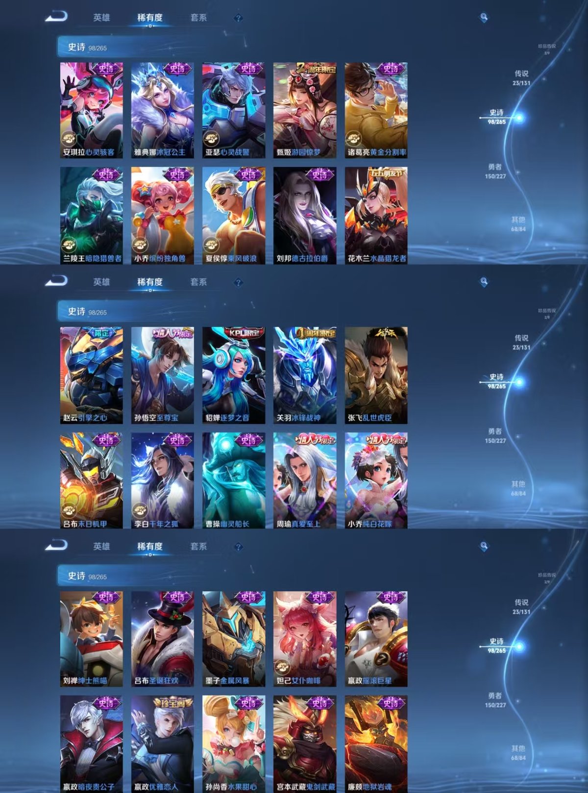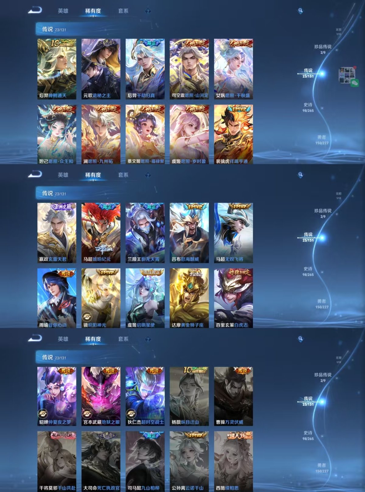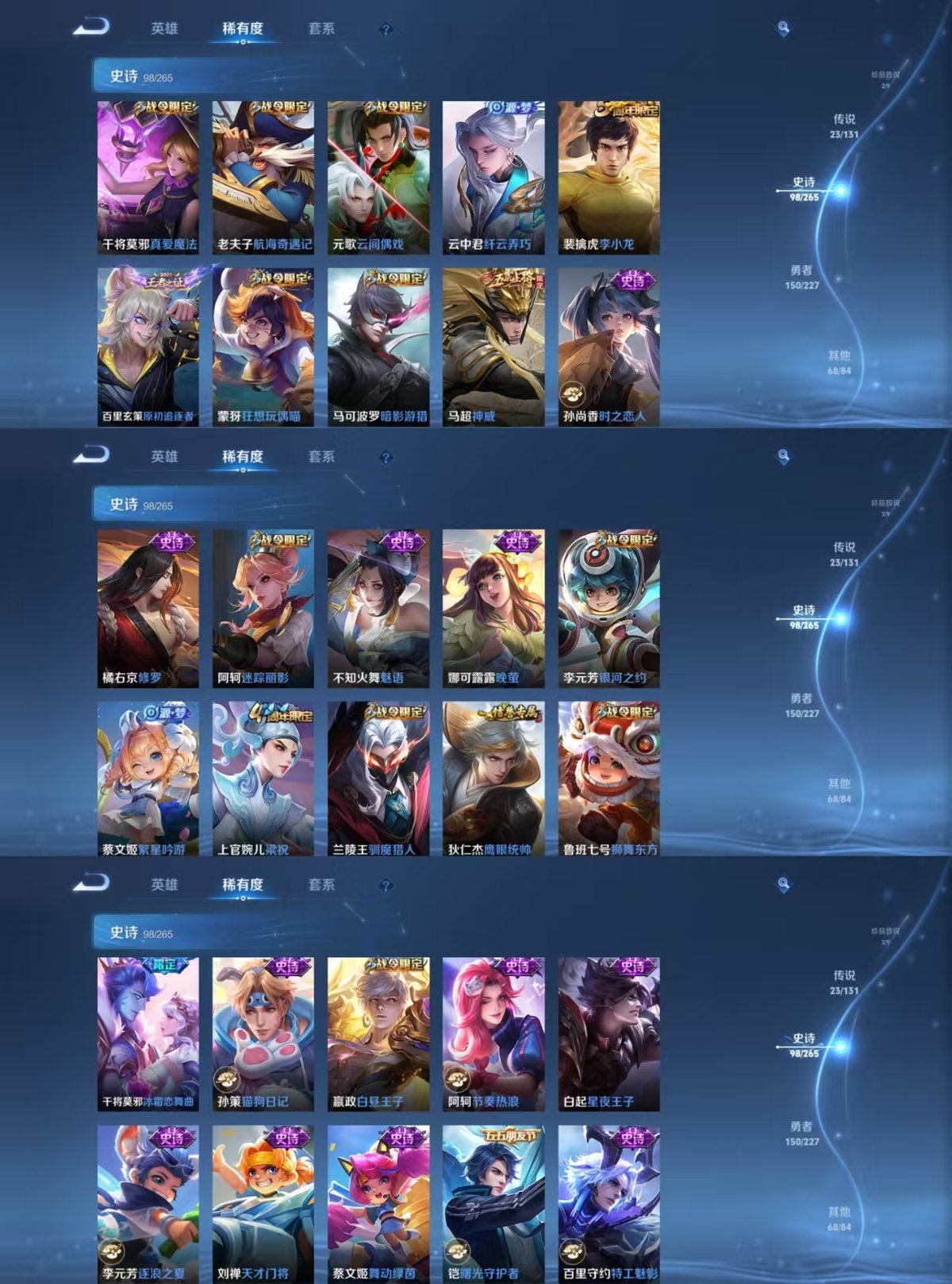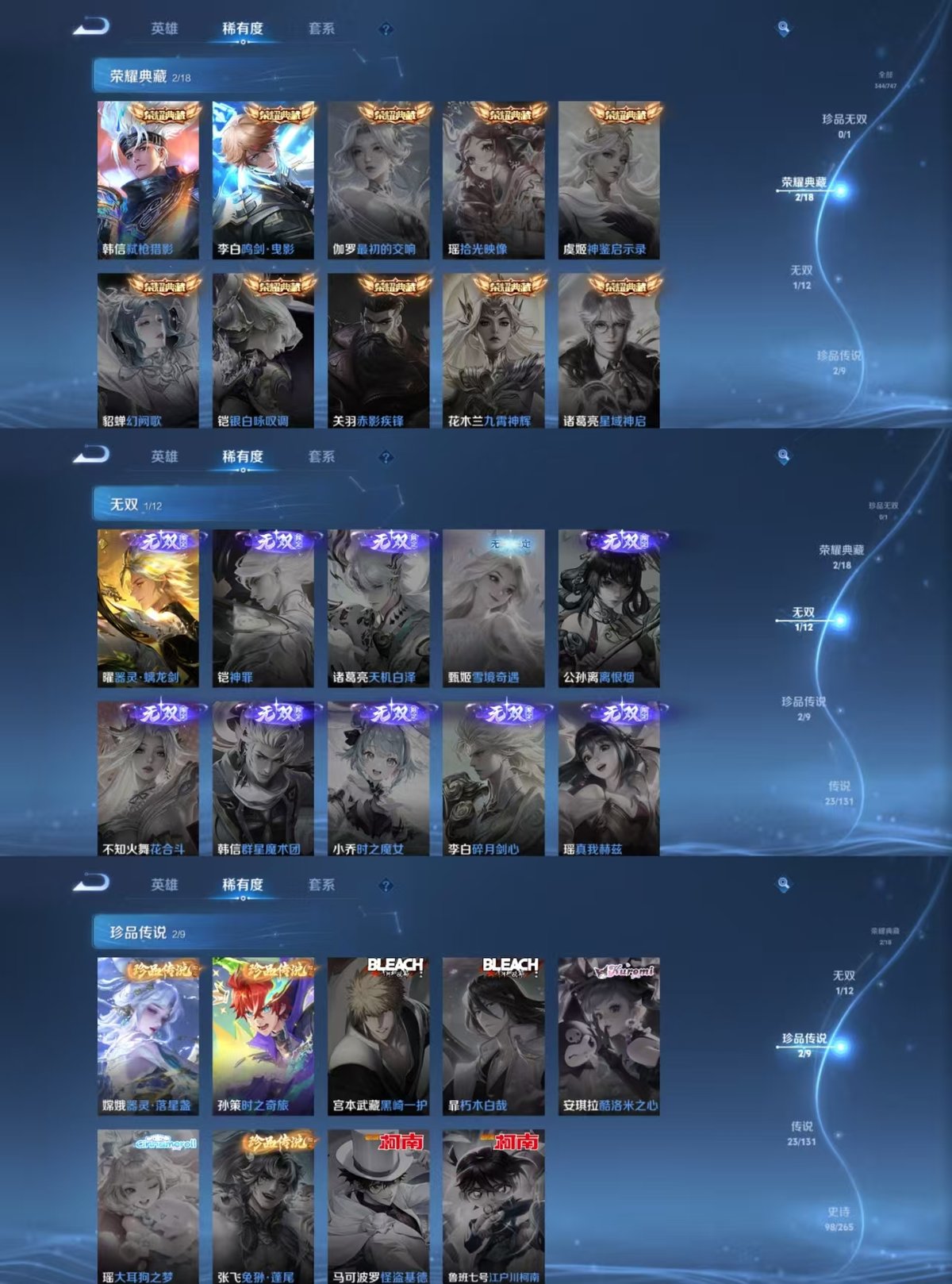 2324430-实名: 可修改 贵族等级: v8 英雄数: 126 皮肤数: 344 荣耀水晶: 鸣剑·曳影弑呛猎影 无双皮: 器灵·螭龙剑 珍品传说: 时之奇旅-孙策器灵·落星盏 传说皮: 黄金狮子座炽阳神光仲夏夜之梦地狱之眼音你心动-周瑜超时空战士-狄仁杰无双飞将琥珀纪元马超玄雷天君祥瑞亨通千劫归真诡秘之主神树通天 限定皮: 冰锋战神李小龙游园惊梦梁祝