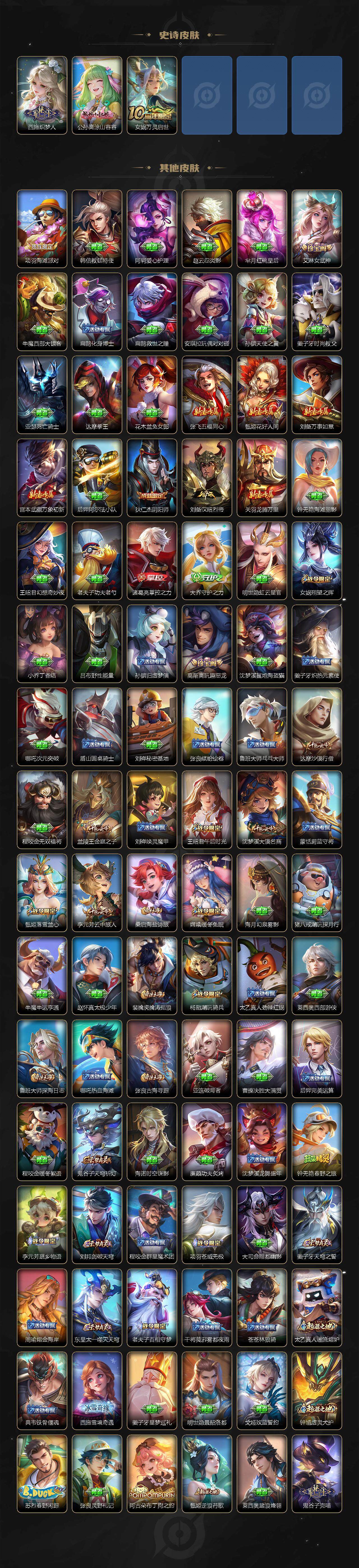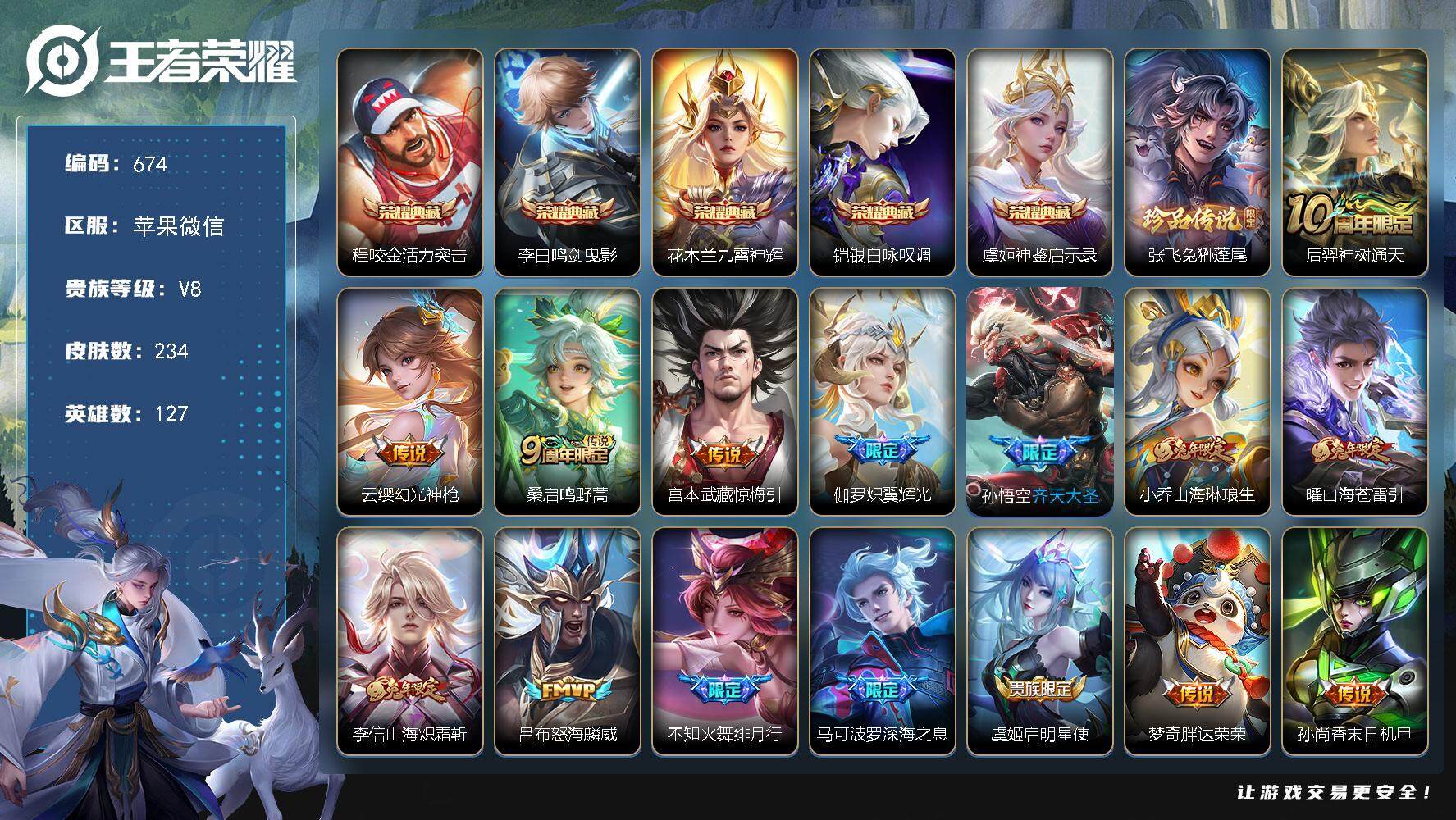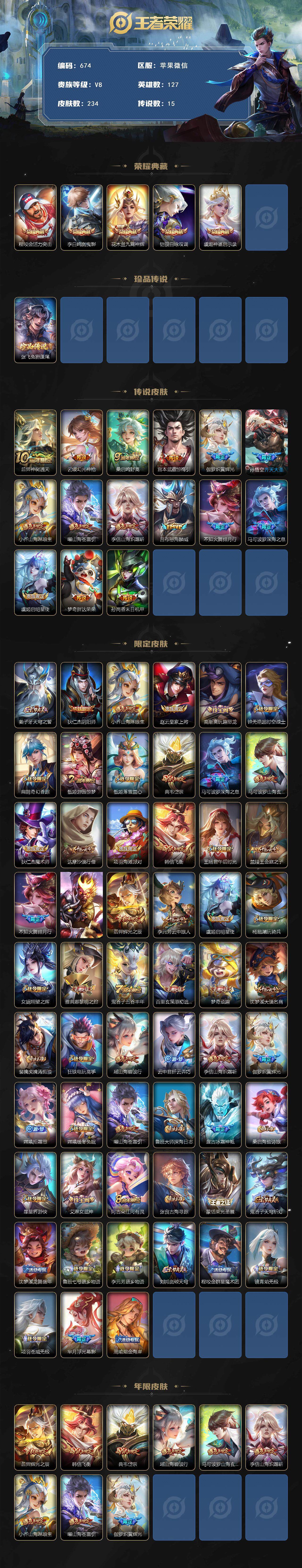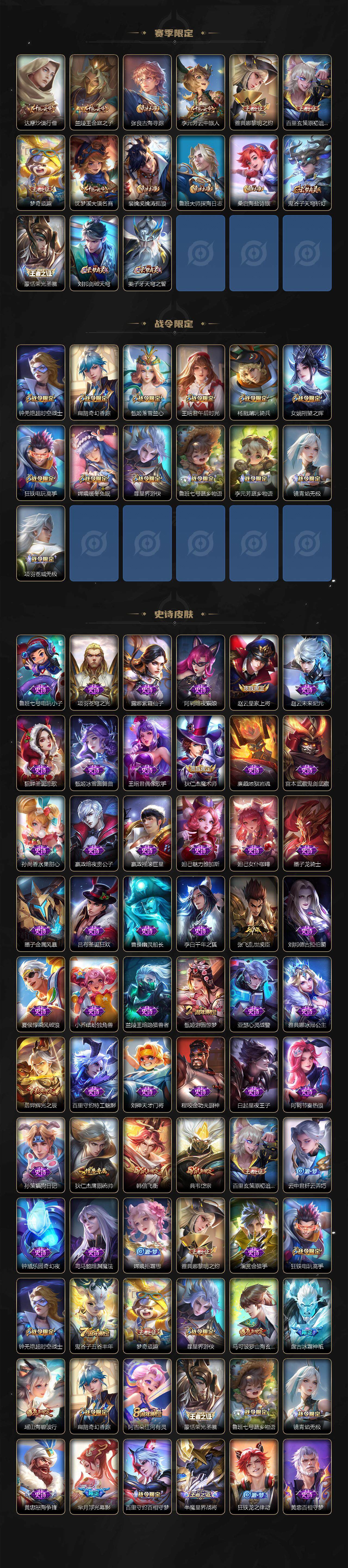 2324435-wx-v8-最强王者段位-全场景社交限制可尝试解除-15王者印记-百星印记-发育路29段-打野25段-2星元刘备时之恋人-孙尚香末日机甲-5级满铭文-紫星币4573-127英雄-234皮肤-5典藏皮肤-1珍品传说-15传说-69史诗 【荣耀典藏】:程咬金活力突击,李白鸣剑曳影,花木兰九霄神辉,铠银白咏叹调,虞姬神鉴启示录 【珍品传说】:张飞兔狲蓬尾 【传说皮肤】:后羿神树通天