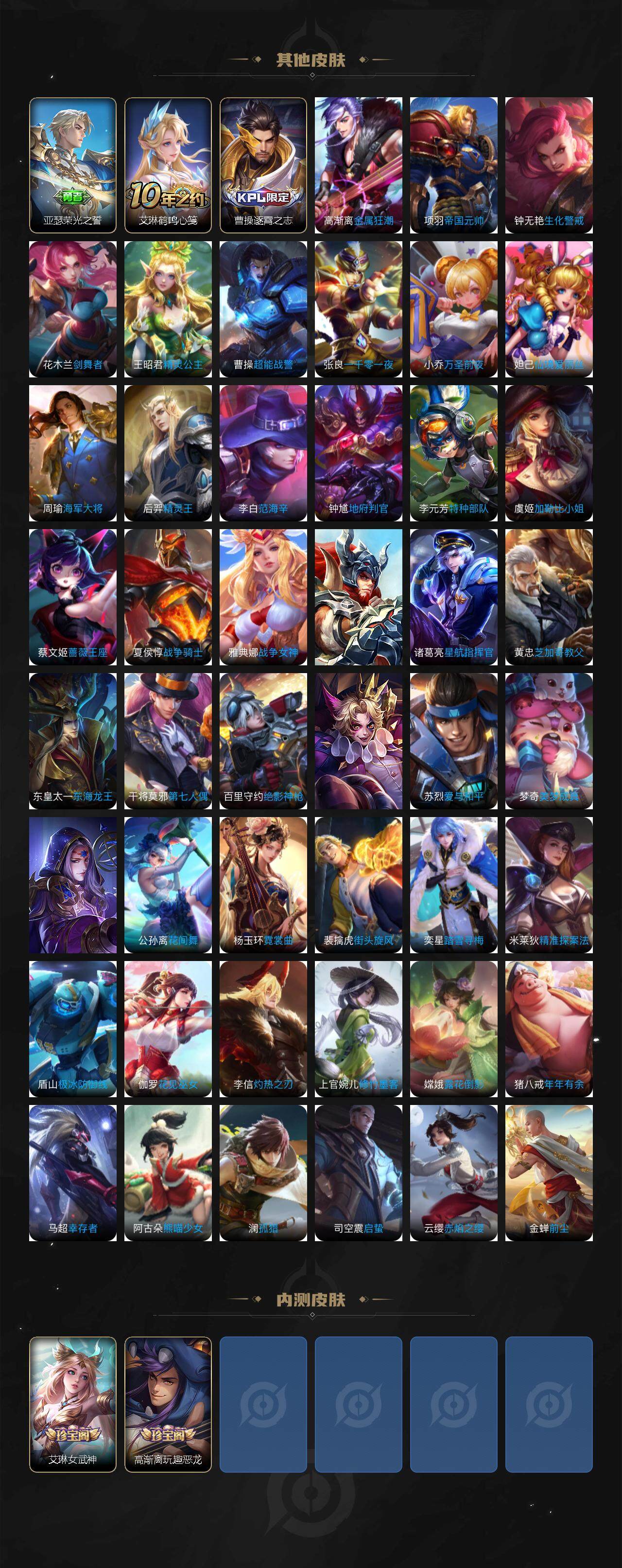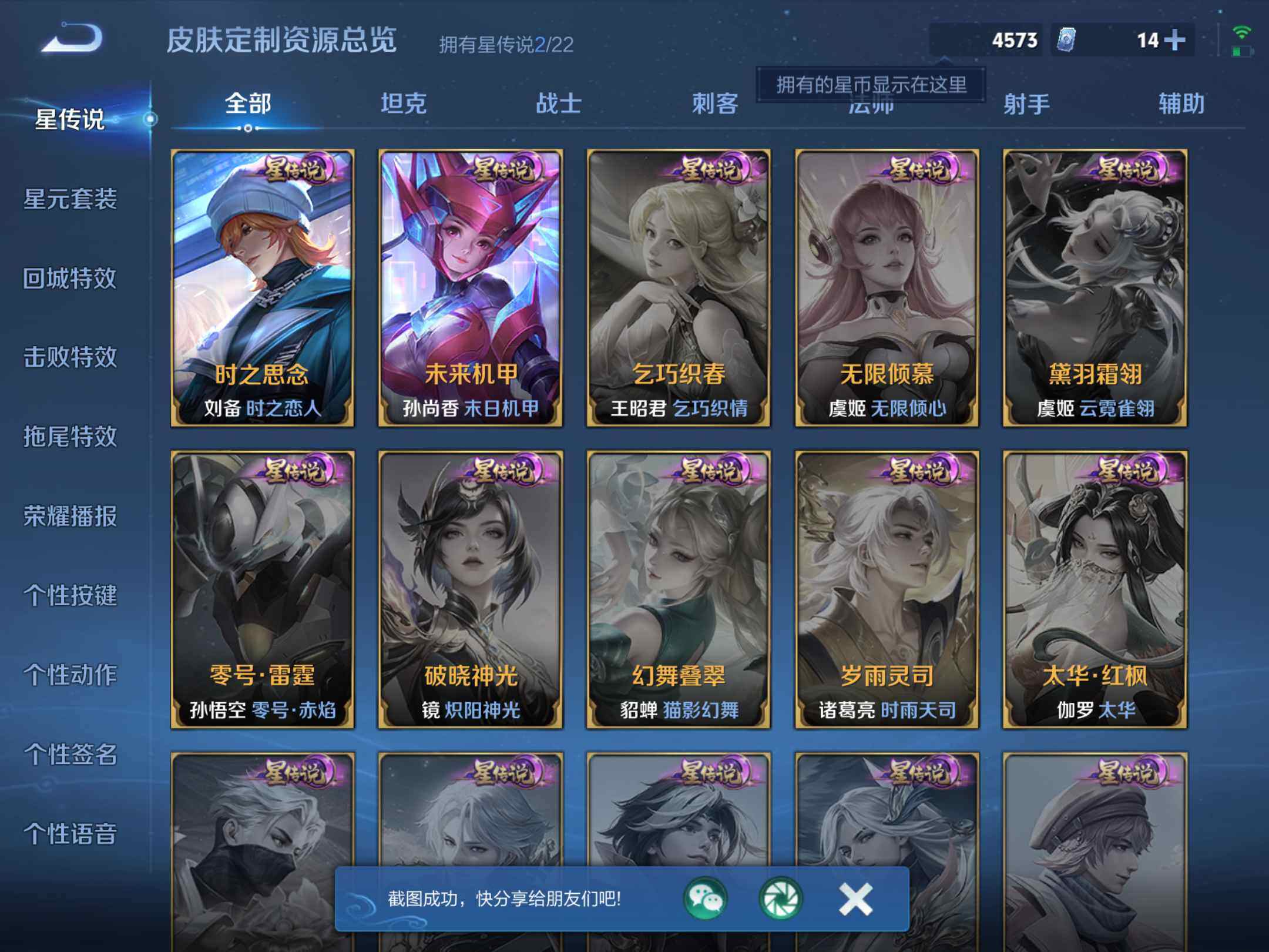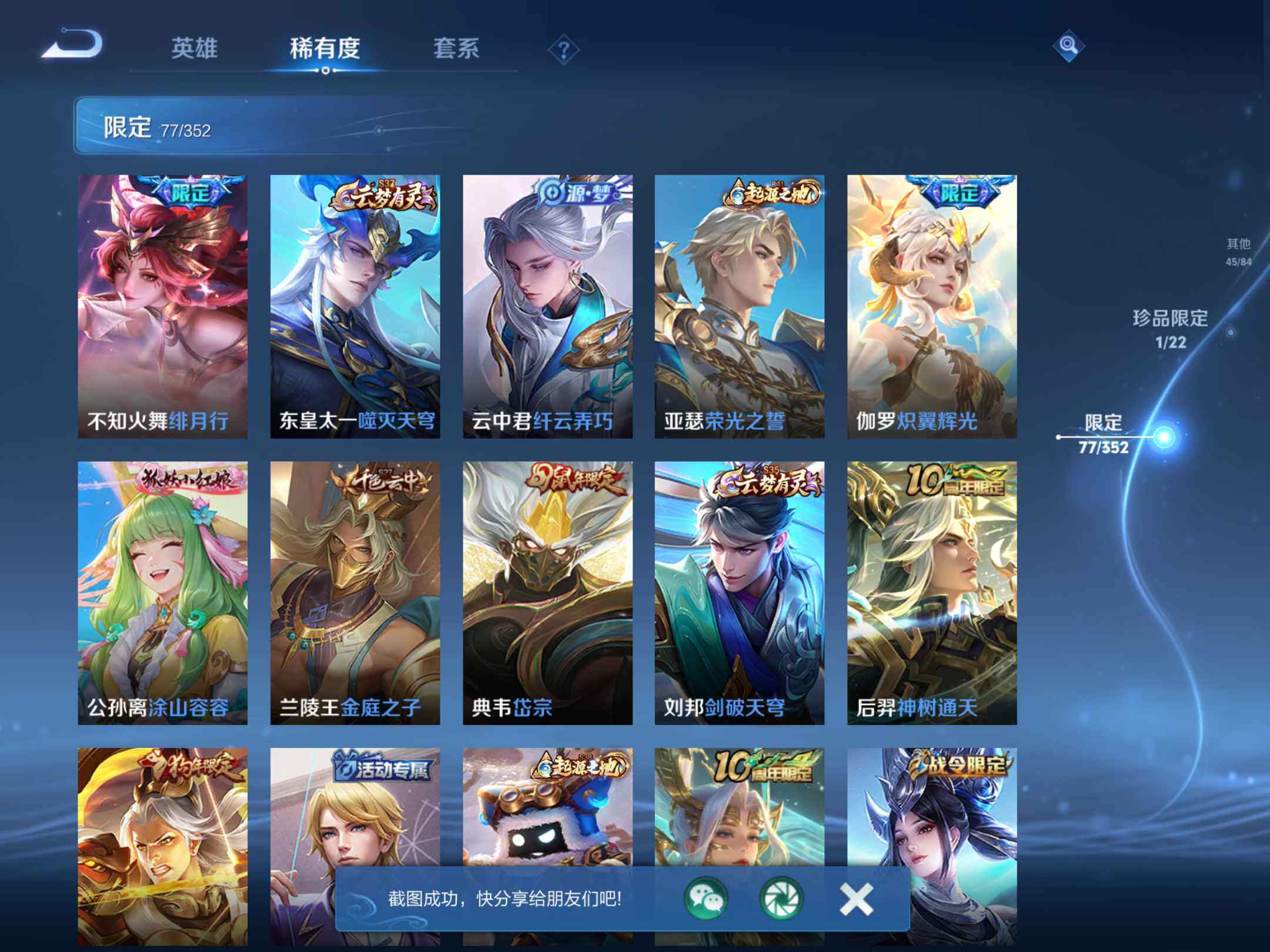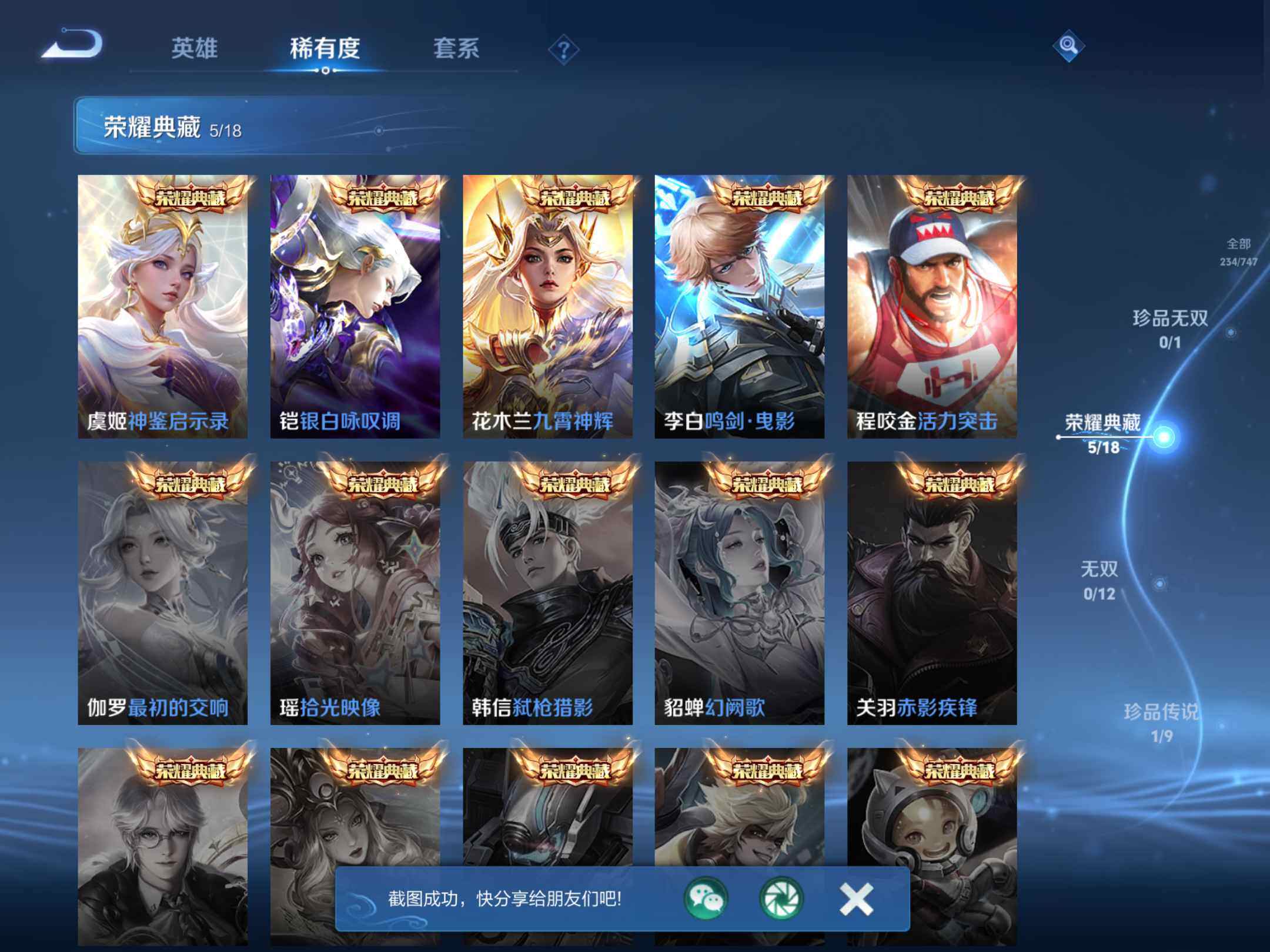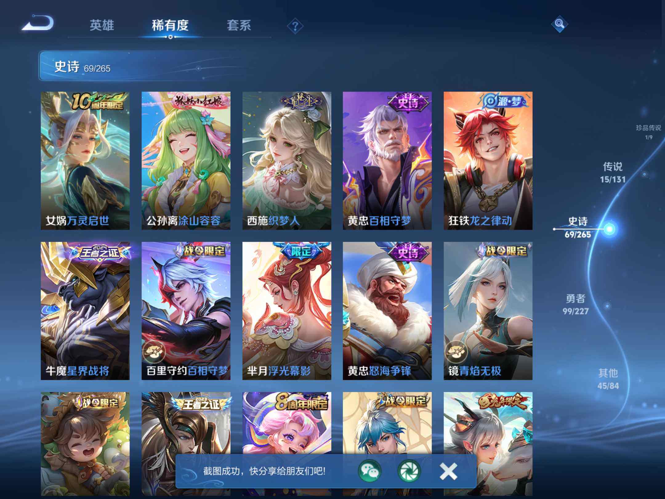 2324435-wx-v8-最强王者段位-全场景社交限制可尝试解除-15王者印记-百星印记-发育路29段-打野25段-2星元刘备时之恋人-孙尚香末日机甲-5级满铭文-紫星币4573-127英雄-234皮肤-5典藏皮肤-1珍品传说-15传说-69史诗 【荣耀典藏】:程咬金活力突击,李白鸣剑曳影,花木兰九霄神辉,铠银白咏叹调,虞姬神鉴启示录 【珍品传说】:张飞兔狲蓬尾 【传说皮肤】:后羿神树通天