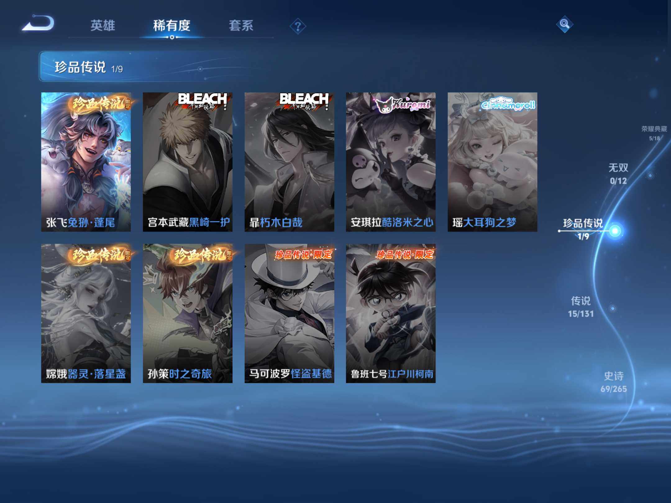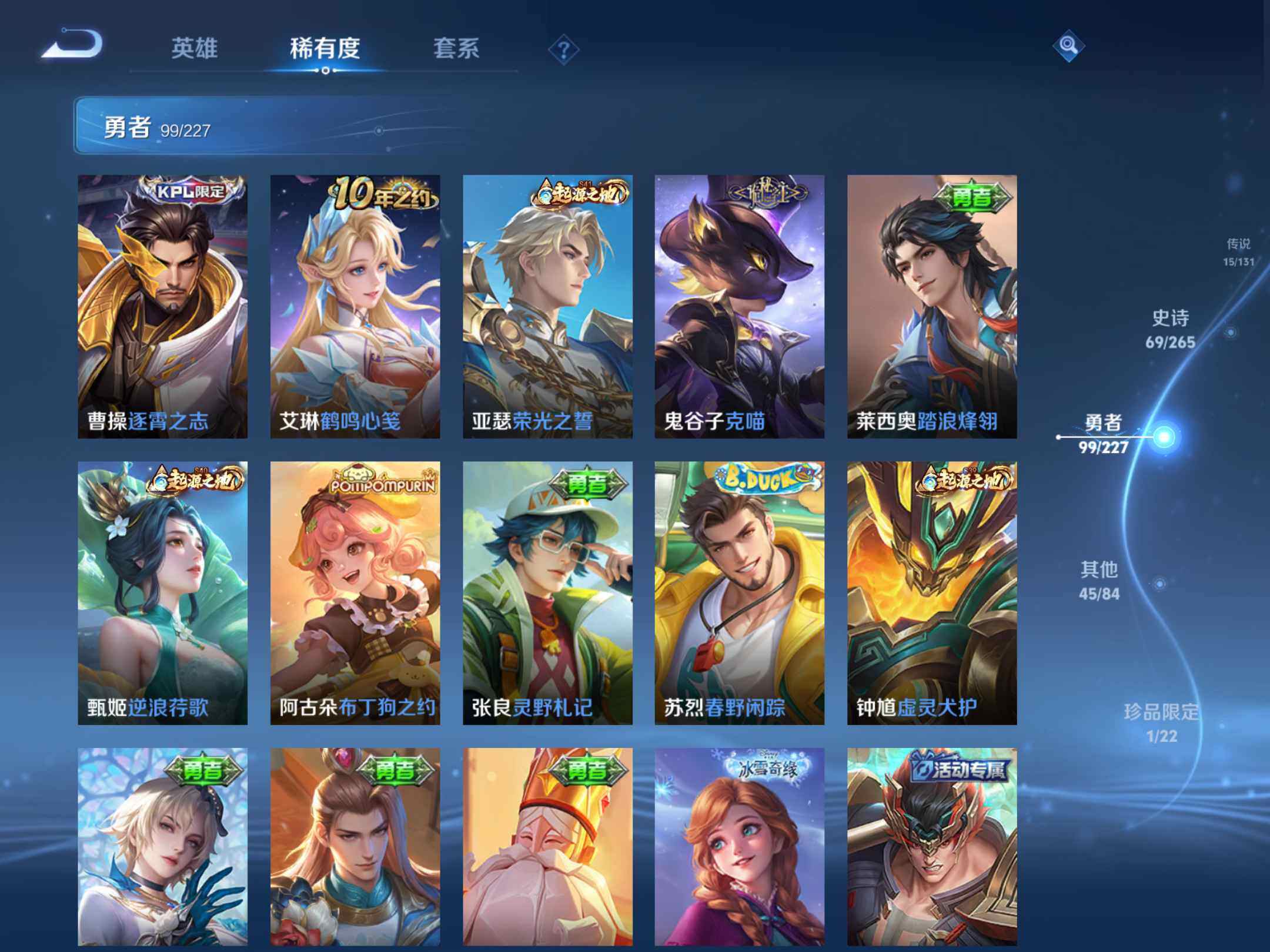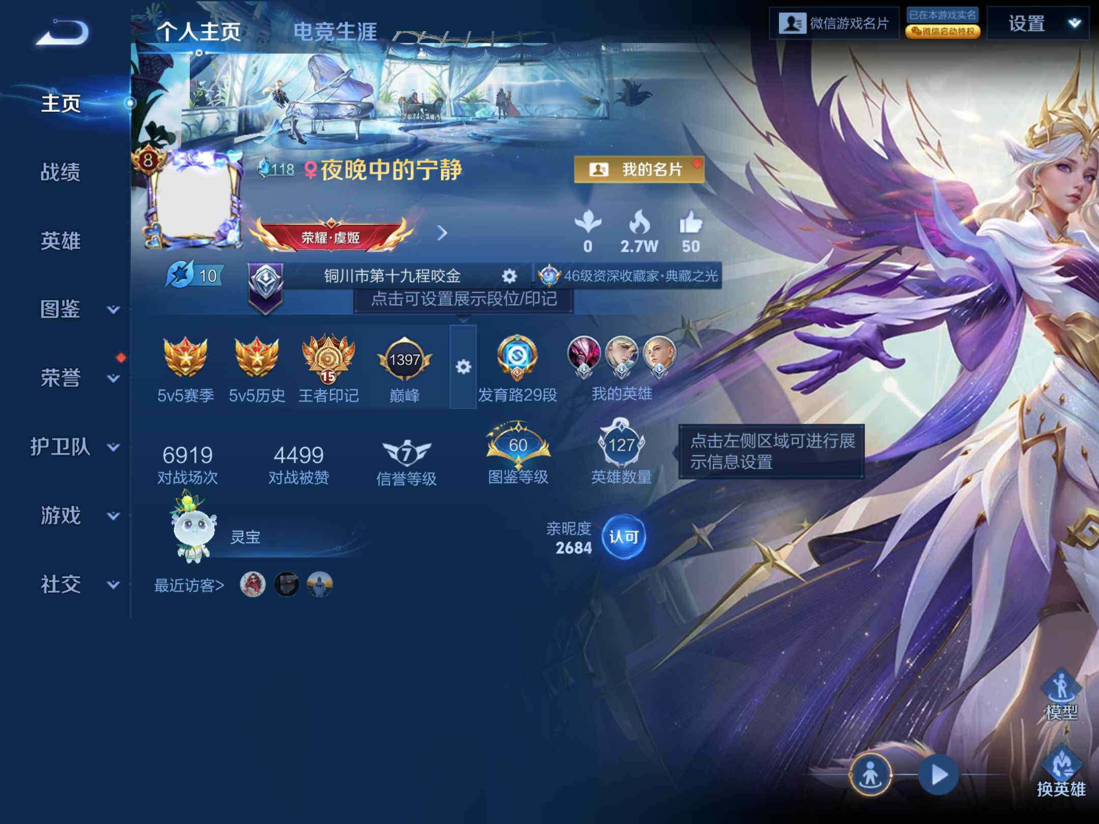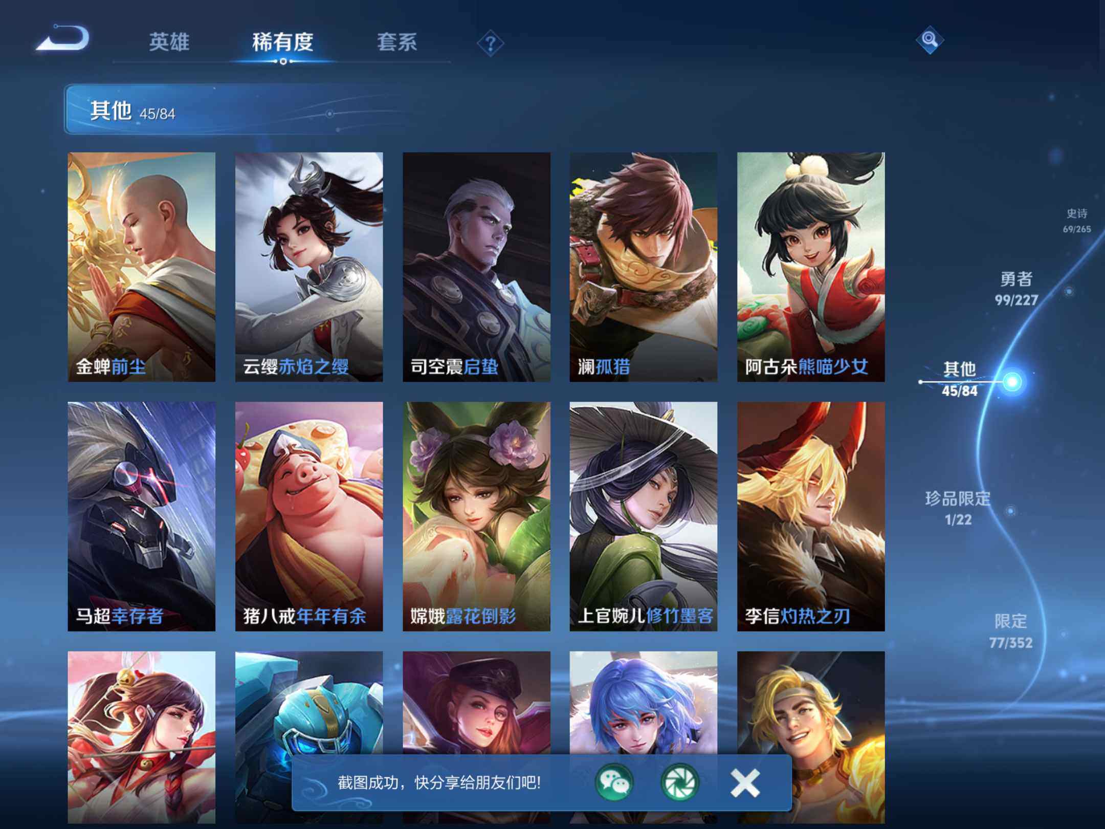 2324435-wx-v8-最强王者段位-全场景社交限制可尝试解除-15王者印记-百星印记-发育路29段-打野25段-2星元刘备时之恋人-孙尚香末日机甲-5级满铭文-紫星币4573-127英雄-234皮肤-5典藏皮肤-1珍品传说-15传说-69史诗 【荣耀典藏】:程咬金活力突击,李白鸣剑曳影,花木兰九霄神辉,铠银白咏叹调,虞姬神鉴启示录 【珍品传说】:张飞兔狲蓬尾 【传说皮肤】:后羿神树通天