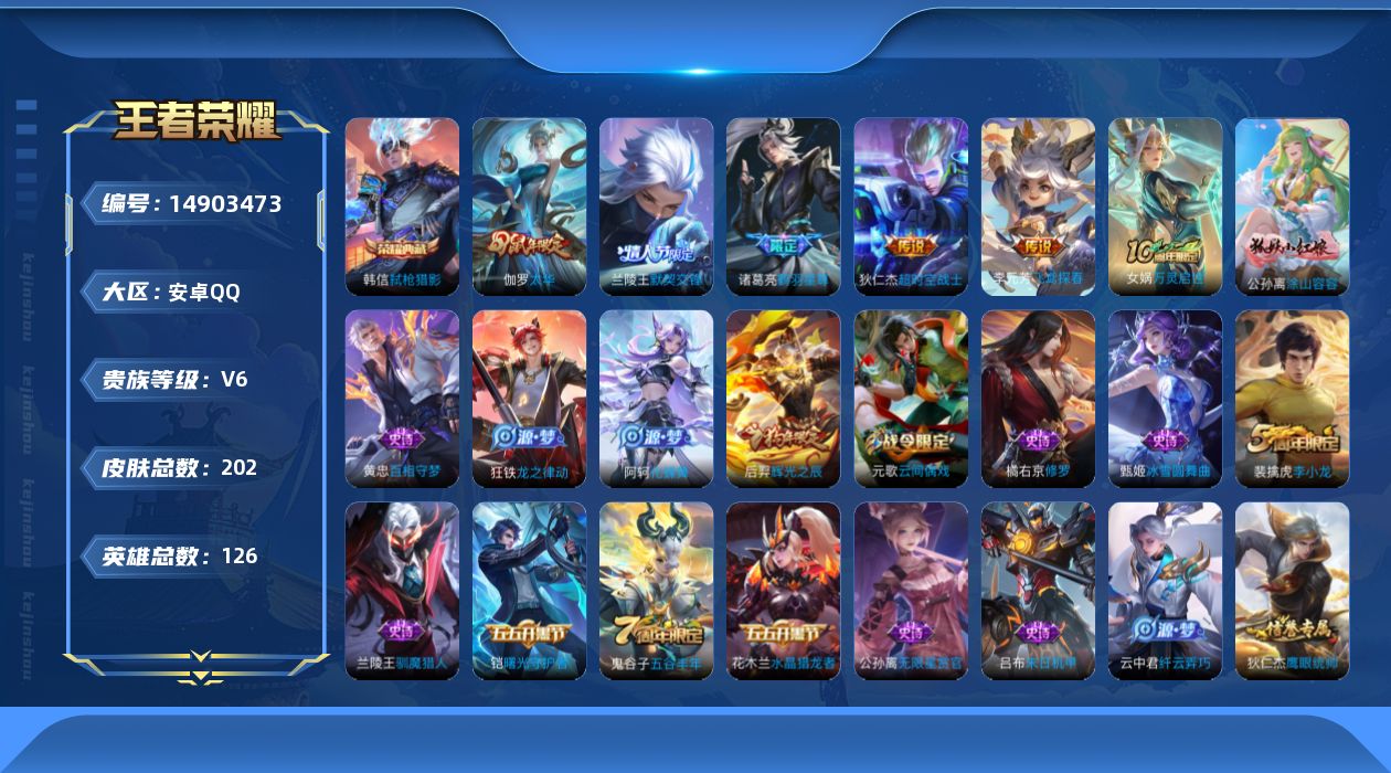 [14903473]安卓q-v5-最强王者段位-126英雄-202皮肤-1典藏皮肤-6传说-50史诗 【荣耀典藏】:韩信弑呛猎影 【传说皮肤】:后羿神树通天,诸葛亮鹤羽星尊,李元芳飞鸢探春,兰陵王默契交锋,伽罗太华,狄仁杰超时空战士 【限定皮肤】:狄仁杰阴阳师,赵云皇家上将,孙尚香蔷薇恋人,庄周高山流水,白起夜都怪侠,芈月重明,周瑜赤莲之焰,元歌云间偶戏,夏侯惇朔风刀,甄姬游园惊梦,曹操烛龙,典韦穷奇,狄仁杰魔术师,狄仁杰万华元夜,达摩沙漠行僧,项羽海滩派对,老夫子醍醐杖,程咬金演武夺筹,兰陵王默契交锋,兰陵王驯魔猎人,兰陵王金庭之子,亚瑟潮玩骑士王,牛魔御旌,后羿辉光之辰,李元芳云中旅人,钟馗驱傩正仪,杨玉环遇见飞天,雅典娜黎明之约,鬼谷子原初探秘者,鬼谷子五谷丰年,诸葛亮鹤羽星尊,苏烈千军破阵,百里玄策原初追逐者,弈星混沌棋,梦奇顽趣,沈梦溪大漠名商,明世隐疑决卦,明世隐吟游魔法,裴擒虎李小龙,裴擒虎擒涛扼浪,狂铁御狮,米莱狄御霄,云中君纤云弄巧,伽罗太华,盾山御銮,上官婉儿梁祝,鲁班大师探海日志,桑启海盐诗旅,阿古朵江河有灵,张良古海寻踪,鬼谷子天穹祈灯,沈梦溪龙舞盛年,刘邦剑破天穹 【年限皮肤】:后羿辉光之辰,伽罗太华 【赛季限定】:芈月重明,夏侯惇朔风刀,曹操烛龙,典韦穷奇,狄仁杰万华元夜,达摩沙漠行僧,老夫子醍醐杖,程咬金演武夺筹,兰陵王金庭之子,张良古海寻踪,牛魔御旌,李元芳云中旅人,钟馗驱傩正仪,雅典娜黎明之约,鬼谷子原初探秘者,苏烈千军破阵,百里玄策原初追逐者,弈星混沌棋,梦奇顽趣,沈梦溪大漠名商,明世隐疑决卦,裴擒虎擒涛扼浪,狂铁御狮,米莱狄御霄,盾山御銮,鲁班大师探海日志,桑启海盐诗旅,鬼谷子天穹祈灯,刘邦剑破天穹 【战令限定】:白起夜都怪侠,周瑜赤莲之焰,元歌云间偶戏,兰陵王驯魔猎人,亚瑟潮玩骑士王,明世隐吟游魔法 【史诗皮肤】:赵云皇家上将,貂蝉圣诞恋歌,甄姬冰雪圆舞曲,狄仁杰魔术师,廉颇地狱岩魂,宫本武藏鬼剑武藏,孙尚香蔷薇恋人,孙尚香水果甜心,嬴政摇滚巨星,妲己魅力维加斯,墨子金属风暴,吕布圣诞狂欢,刘禅绅士熊喵,吕布末日机甲,张飞乱世虎臣,花木兰水晶猎龙者,兰陵王暗隐猎兽者,甄姬游园惊梦,雅典娜冰冠公主,后羿辉光之辰,百里守约特工魅影,铠曙光守护者,蔡文姬舞动绿茵,程咬金功夫厨神,杨玉环遇见飞天,大乔猫狗日记,伽罗箭羽风息,狄仁杰鹰眼统帅,公孙离无限星