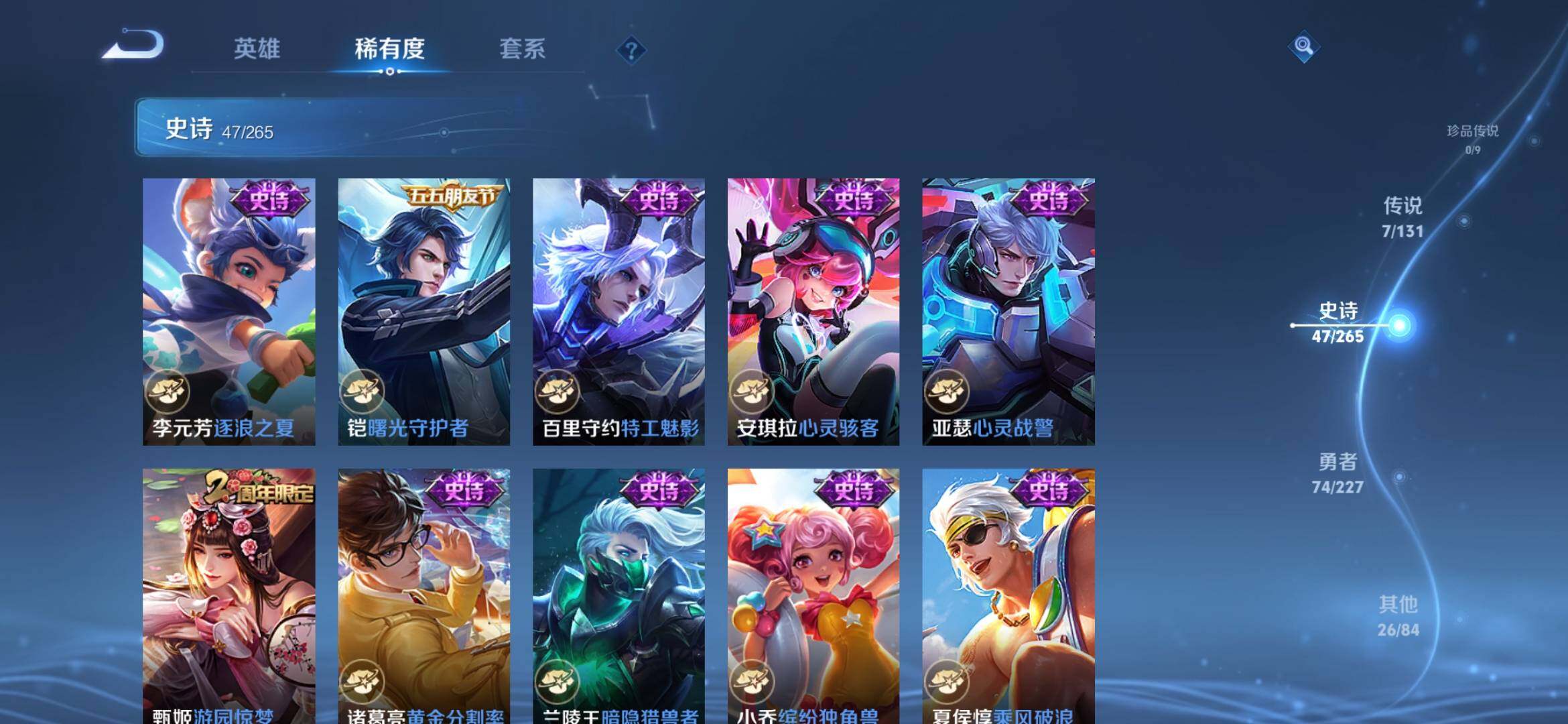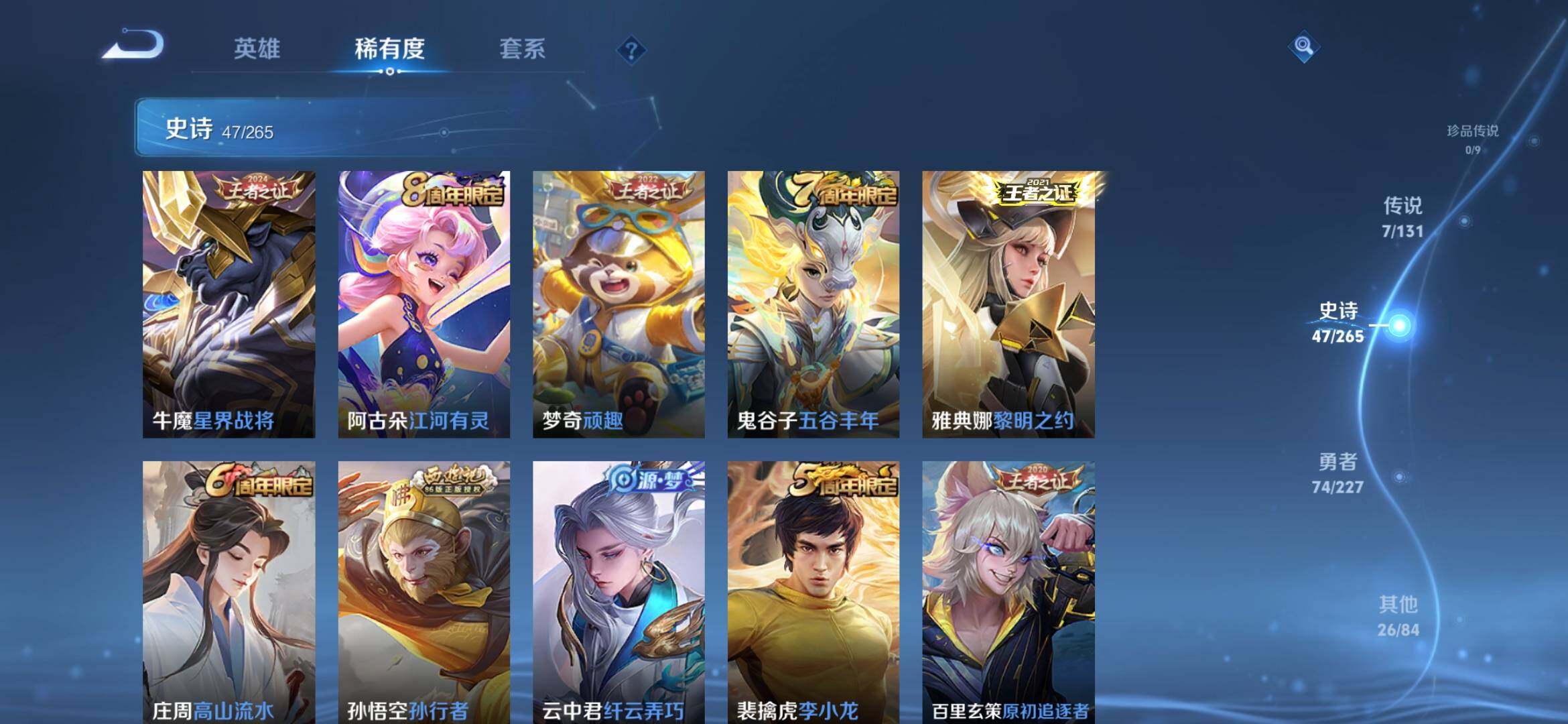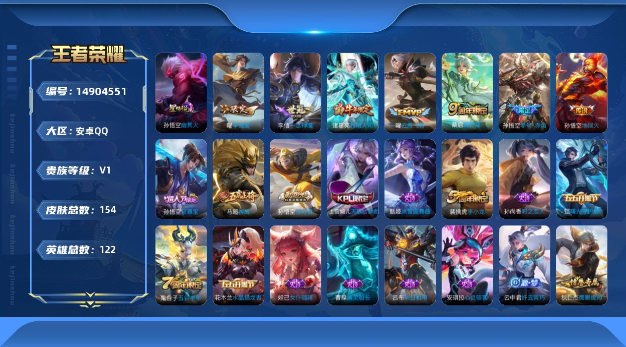 [14904551]安卓q-v0-尊贵铂金iv段位-122英雄-154皮肤-7传说-47史诗 【传说皮肤】:桑启鸣野蒿,曜李 ,诸葛亮时雨天司,孙悟空零号赤焰,曜云鹰飞将,李信一念神魔,孙悟空地狱火 【限定皮肤】:白起狰,大乔绒语心约,姜子牙天穹之誓,狄仁杰阴阳师,赵云皇家上将,庄周高山流水,高渐离玩趣恶龙,阿轲迷踪丽影,芈月重明,夏侯惇朔风刀,甄姬游园惊梦,曹操烛龙,典韦穷奇,狄仁杰魔术师,狄仁杰万华元夜,达摩沙漠行僧,项羽海滩派对,老夫子醍醐杖,程咬金演武夺筹,刘邦夺宝奇兵,兰陵王金庭之子,孙悟空至尊宝,孙悟空零号赤焰,孙悟空孙行者,牛魔御旌,李元芳云中旅人,钟馗驱傩正仪,杨玉环遇见飞天,雅典娜单词大作战,雅典娜黎明之约,蔡文姬繁星吟游,太乙真人饕餮,鬼谷子原初探秘者,鬼谷子五谷丰年,诸葛亮时雨天司,苏烈千军破阵,百里玄策原初追逐者,弈星混沌棋,梦奇顽趣,沈梦溪大漠名商,明世隐疑决卦,裴擒虎李小龙,裴擒虎擒涛扼浪,狂铁御狮,米莱狄御霄,云中君纤云弄巧,上官婉儿天狼绘梦者,曜李 ,蒙犽狂想玩偶喵,鲁班大师探海日志,桑启海盐诗旅,阿古朵江河有灵,张良古海寻踪,刘邦剑破天穹,周瑜熔金海岸 【年限皮肤】:诸葛亮时雨天司,马超神威 【赛季限定】:白起狰,芈月重明,夏侯惇朔风刀,曹操烛龙,典韦穷奇,狄仁杰万华元夜,达摩沙漠行僧,老夫子醍醐杖,程咬金演武夺筹,兰陵王金庭之子,张良古海寻踪,牛魔御旌,李元芳云中旅人,钟馗驱傩正仪,雅典娜黎明之约,太乙真人饕餮,鬼谷子原初探秘者,苏烈千军破阵,百里玄策原初追逐者,弈星混沌棋,梦奇顽趣,沈梦溪大漠名商,明世隐疑决卦,裴擒虎擒涛扼浪,狂铁御狮,米莱狄御霄,鲁班大师探海日志,桑启海盐诗旅,刘邦剑破天穹,姜子牙天穹之誓 【战令限定】:阿轲迷踪丽影,刘邦夺宝奇兵,雅典娜单词大作战,蒙犽狂想玩偶喵 【史诗皮肤】:项羽苍穹之光,赵云皇家上将,赵云未来纪元,甄姬冰雪圆舞曲,王昭君偶像歌手,狄仁杰魔术师,宫本武藏鬼剑武藏,孙尚香水果甜心,嬴政摇滚巨星,妲己魅力维加斯,妲己女仆咖啡,墨子金属风暴,吕布圣诞狂欢,曹操幽灵船长,吕布末日机甲,孙悟空至尊宝,花木兰水晶猎龙者,夏侯惇乘风破浪,小乔缤纷独角兽,兰陵王暗隐猎兽者,诸葛亮黄金分割率,甄姬游园惊梦,亚瑟心灵战警,安琪拉心灵骇客,百里守约特工魅影,铠曙光守护者,李元芳逐浪之夏,程咬金功夫厨神,杨玉环遇见飞天,孙
