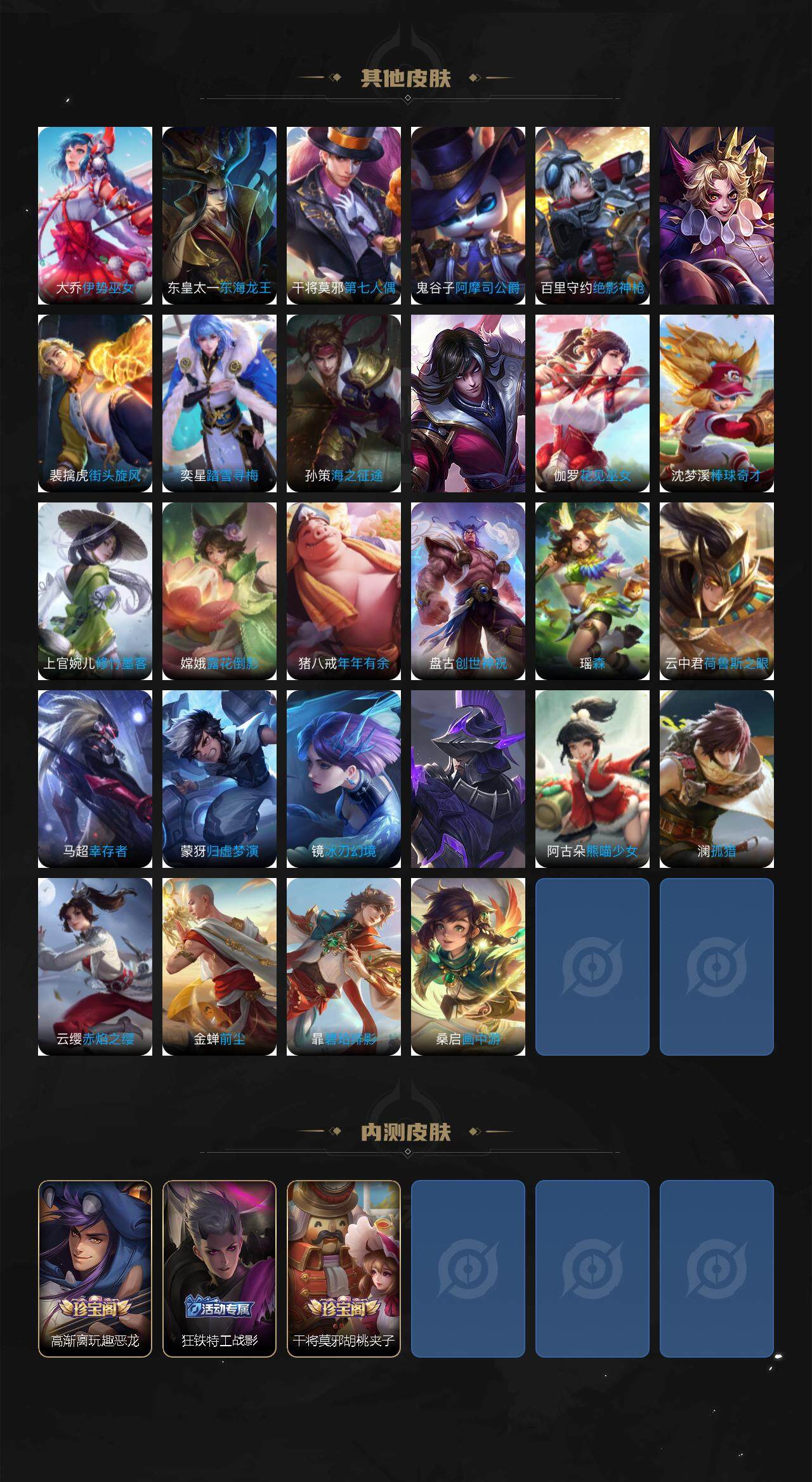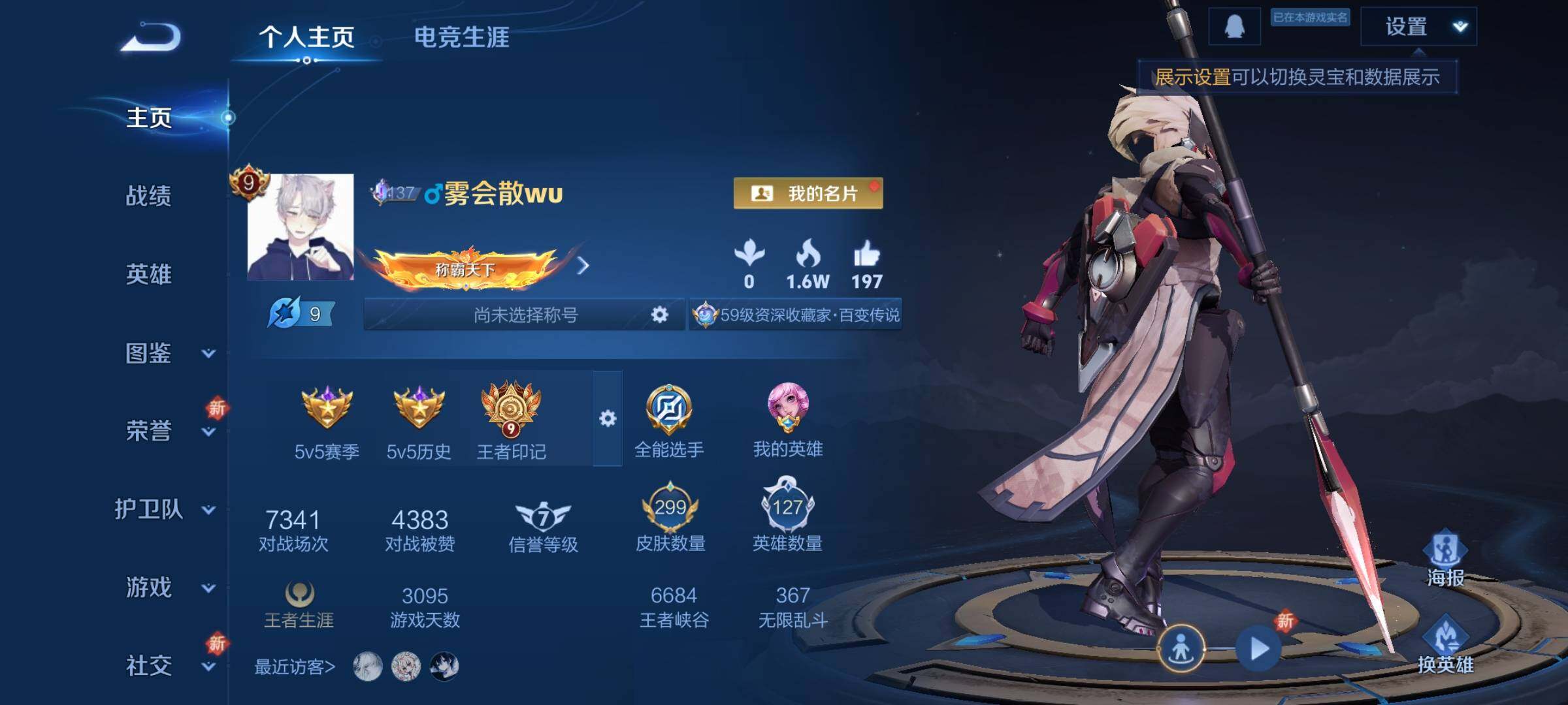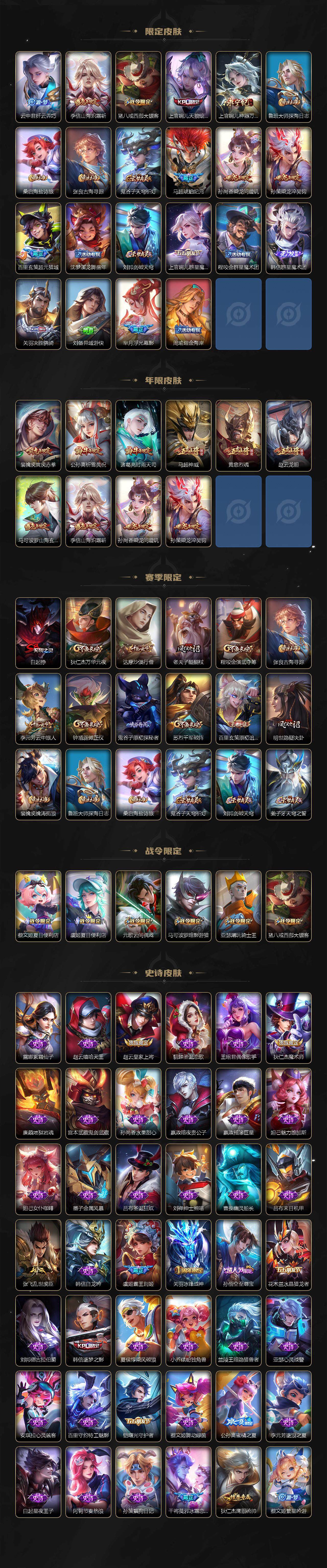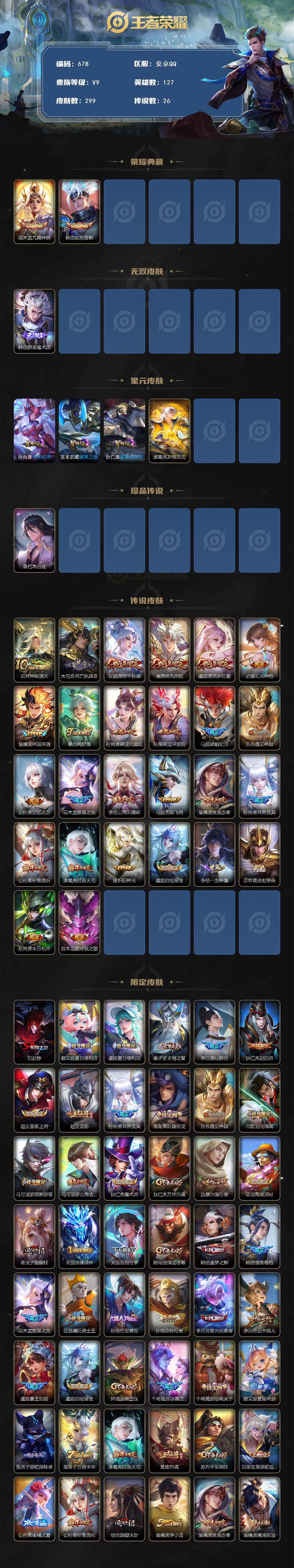 2324572-q-v9-最强王者段位-打野25段,,发育路16段,4星元岁雨灵司,,幽冥之眼,星际治安官,未来机甲,127英雄-299皮肤-2典藏皮肤-1无双-1珍品传说-26传说-85史诗 【英雄全皮】:鬼谷子全皮,马超全皮,影全皮 【荣耀典藏】:花木兰九霄神辉,韩信弑呛猎影 【无双皮肤】:韩信群星魔术团 【珍品传说】:暃朽木白哉 【传说皮肤】:后羿神树通天,大司命死亡执政官,女娲愿照千
