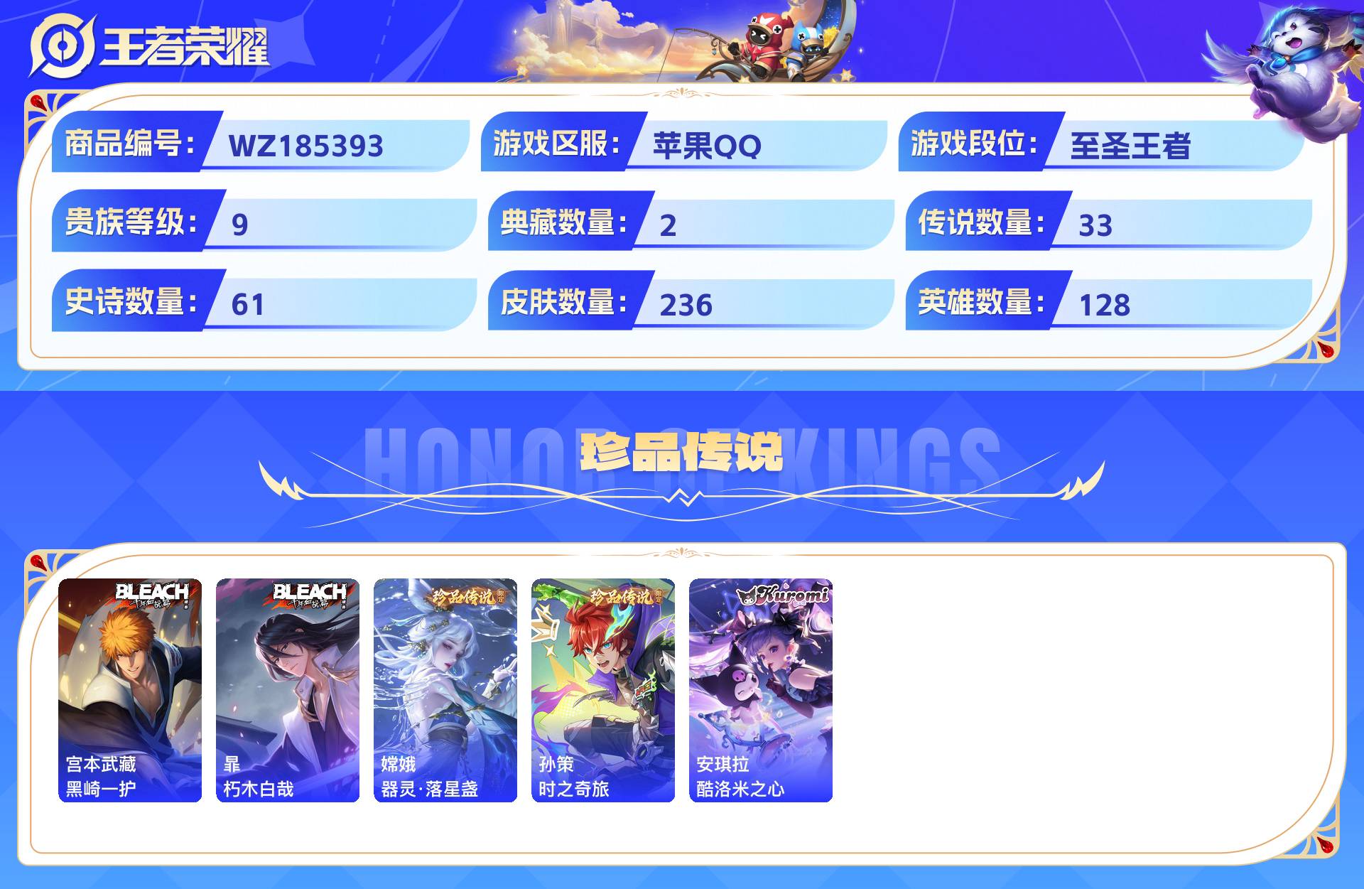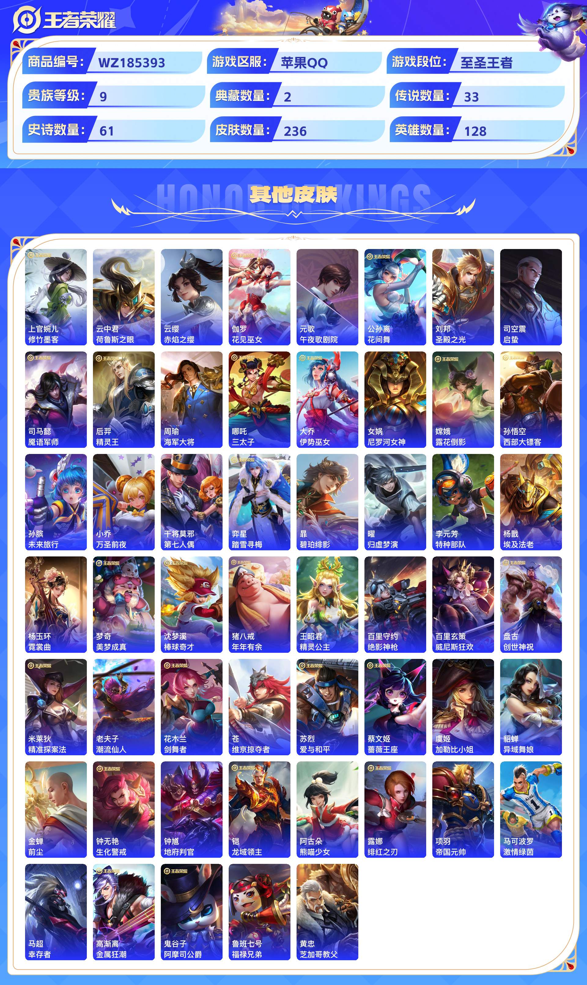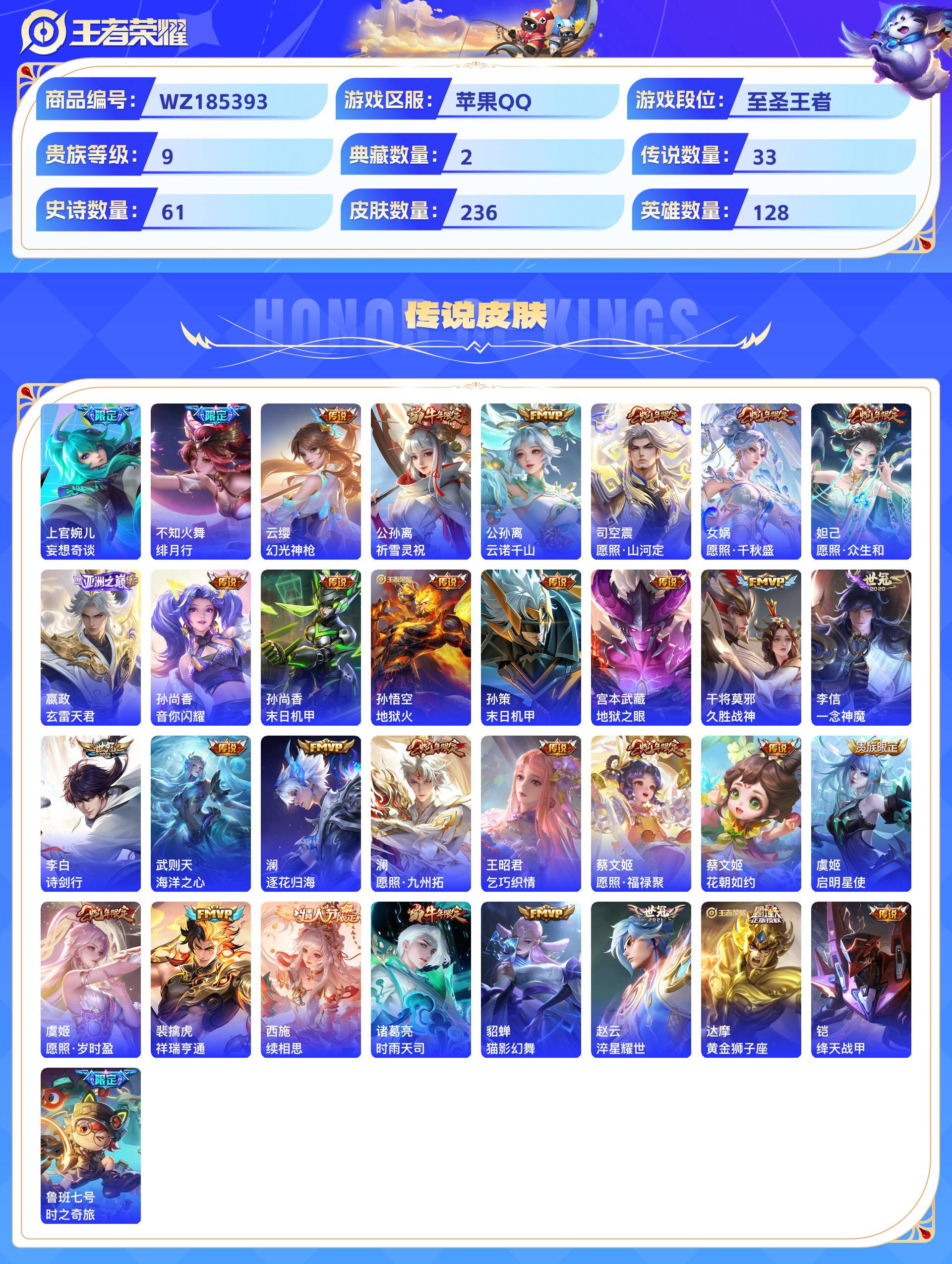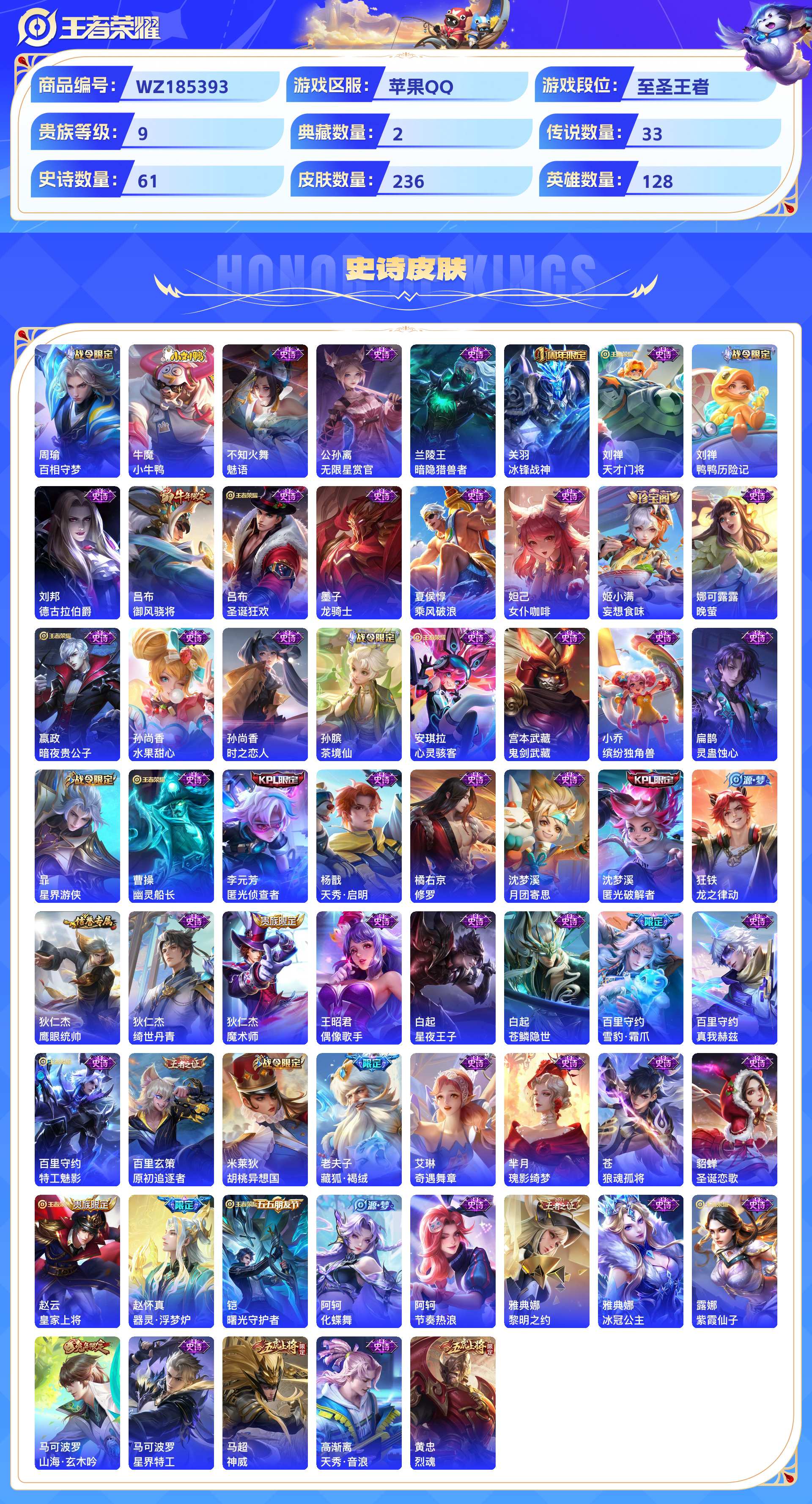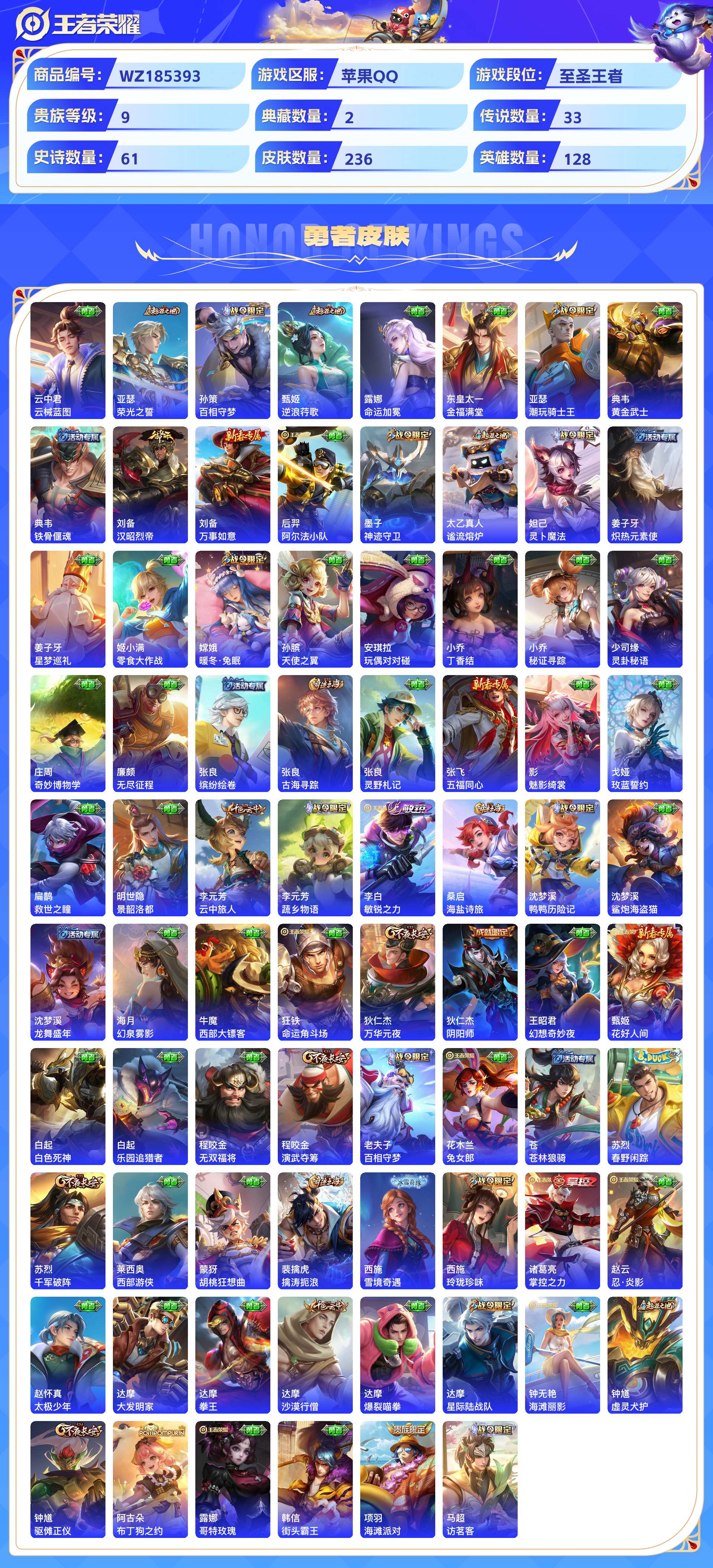 2280894-苹果qq 236皮 贵族9级 2典藏 5珍品传说 1无双 33传说 61史诗【荣耀典藏】九霄神辉银白咏叹调【珍品传说】黑崎一护朽木白哉器灵·落星盏时之奇旅酷洛米之心【无双限定】雪境奇遇【传说皮肤】妄想奇谈绯月行幻光神呛祈雪灵祝云诺千山愿照·山河定愿照·千秋盛愿照·众生和玄雷天君音你闪耀末日机甲地狱火末日机甲地狱之眼久胜战神一念神魔诗剑