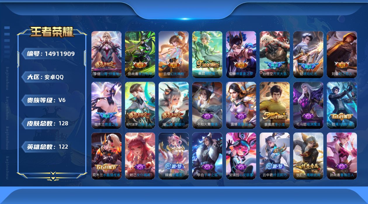 [14911909]v6 9传说 122英雄 128皮肤 可修改实名 【稀有英雄】:大司命韩信韩跳跳夏洛特夏师傅艾琳橘右京橘子娜可露露鸟人不知火舞赵云金蝉唐僧戈娅 【传说皮】:琥珀纪元铠幻光神呛山海·炽霜斩李信年限仲夏夜之梦大飞蛾末日机甲-孙尚香绿蚂蚱时之恋人-刘备电焊工燃星之曲 【珍宝阁皮】:万物之道蔷薇恋人 【赛季/战令皮】:噬灭天穹s37古海寻踪s33海盐诗旅s30擒涛扼浪s31探海日志s32剑破天穹s35天穹祈灯s34万华元夜s22演武夺筹s23驱傩正仪s24千军破阵s25沙漠行僧s26金庭之子s27大漠名商s28云中旅人s29 【史诗皮】:星界战将紫霞仙子苍穹之光黄金分割率特工魅影千年之狐江河有灵蒙恬荣光圣徽魅语猫狗日记-孙策女仆咖啡水果甜心星夜王子心灵骇客德古拉伯爵暗隐猎兽者鬼剑武藏暗渊魔法舞动绿茵纤云弄巧拒霜思缤纷独角兽逐浪之夏水晶猎龙者曙光守护者金属风暴圣诞狂欢圣诞恋歌鹰眼统帅魅力维加斯未来纪元-赵云 【限定皮】:鸣野蒿山海·碧波行瑶年限齐天大圣李小龙山海·玄木吟马可年限 【普通皮】:苍林狼骑铁骨偃魂谧流熔炉雾都夜雨敬我三分劲辣红锅刘备异域游侠暗都幽影功夫炙烤街头霸王雪境奇遇-西施聚星闪耀潮玩造梦师太极少年妄想特派王牌新星完美运算鬼谷子天穹祈灯s34花好人间归虚梦演-孙膑归虚梦演-西施海滩丽影海滩派对皇家上将魔术师沉稳之力守护之力坚韧之力敏锐之力化身博士圆桌骑士(盾山)乓乓大师次元突破功夫老勺哥特玫瑰鲨炮海盗猫西部大镖客牛魔教廷特使阴阳师死亡骑士少女阿狸忍·炎影秘密基地未来纪元-宫本武藏玩偶对对碰幻乐之宴虹云星官孤猎修竹墨客踏雪寻梅地府判官生化警戒异域舞娘星航指挥官战争女神启蛰森花间舞木偶奇遇记帝国元帅精灵公主一千零一夜前尘碧珀绯影无双福将幻泉雾影-海月潮玩探月行牛运亨通乐园追猎者