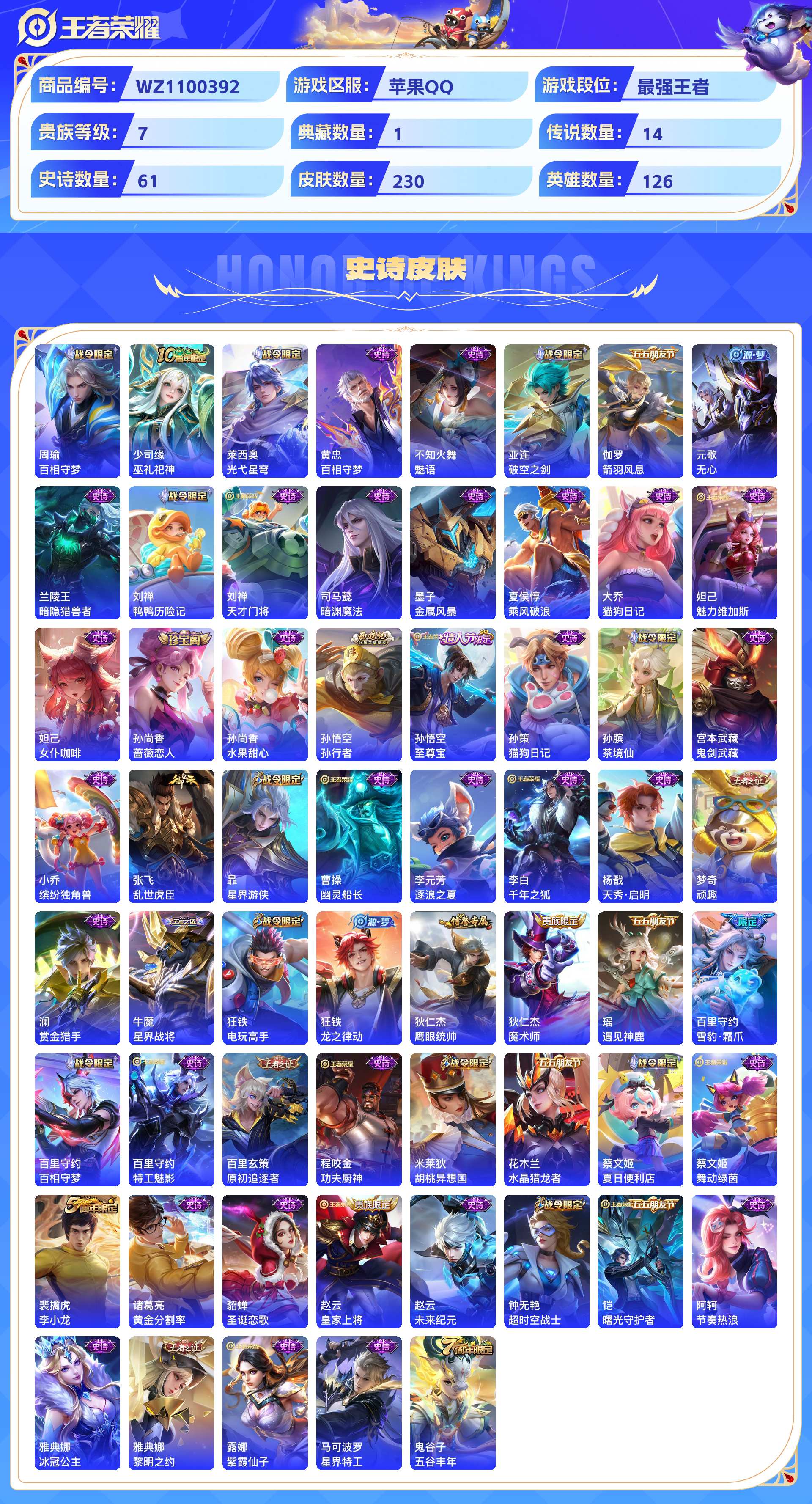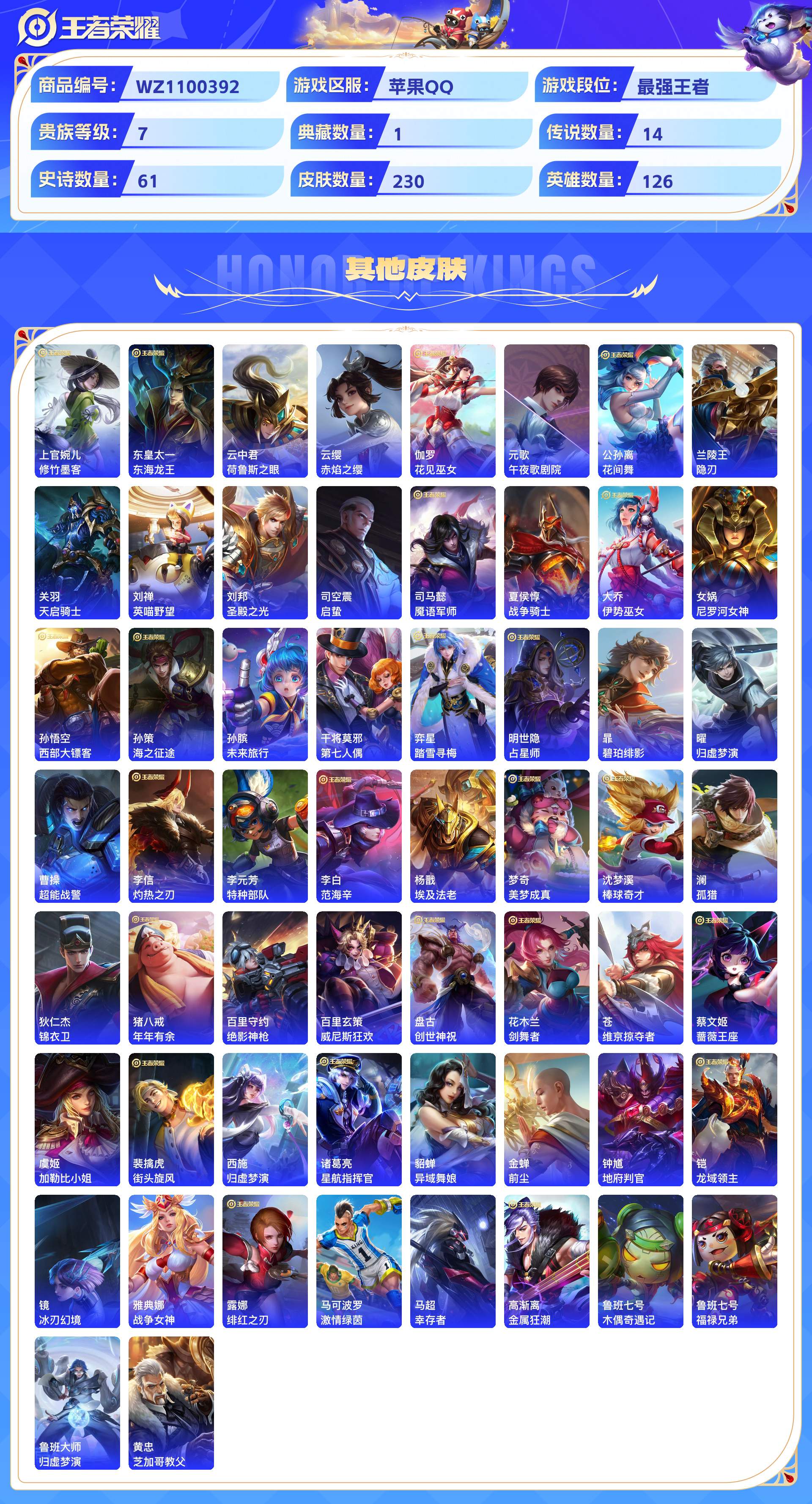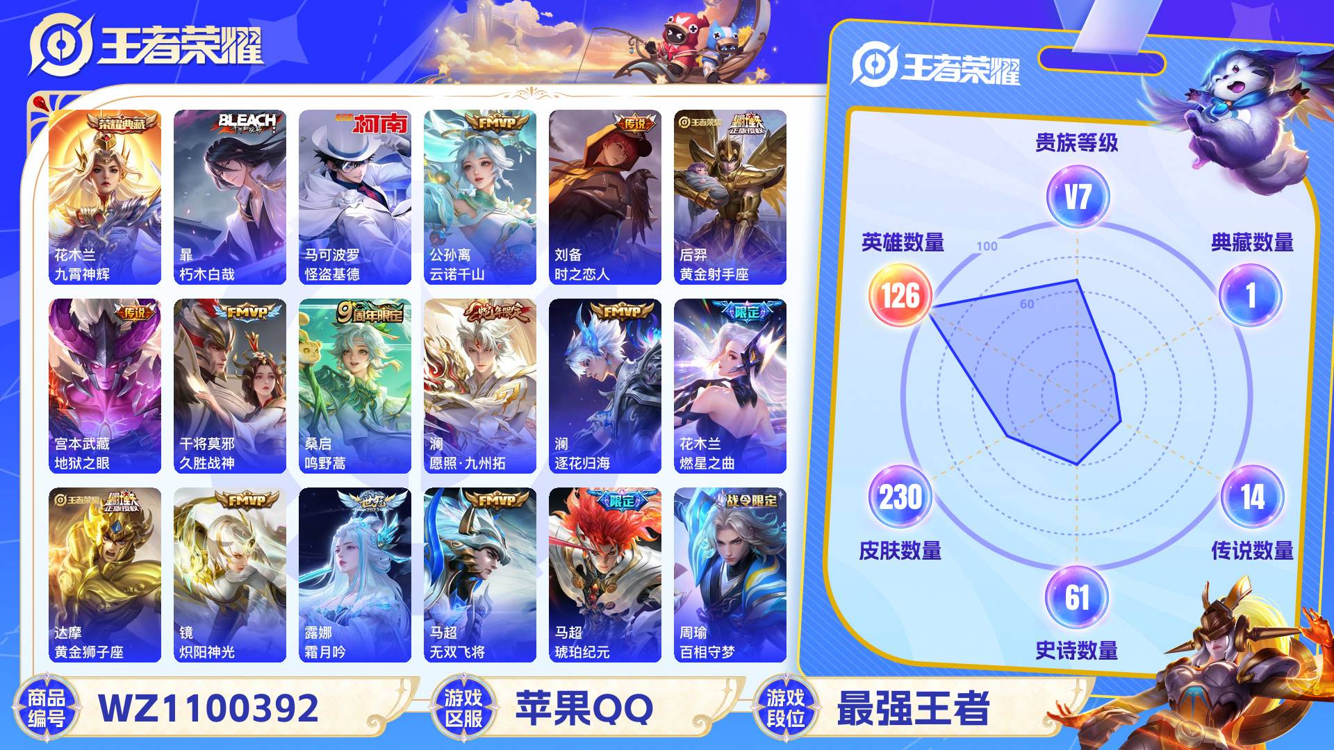 2324770-苹果qq 230皮 贵族7级 1典藏 2珍品传说 14传说 61史诗【荣耀典藏】九霄神辉【珍品传说】朽木白哉怪盗基德【传说皮肤】云诺千山时之恋人黄金射手座地狱之眼久胜战神鸣野蒿愿照·九州拓逐花归海燃星之曲黄金狮子座炽阳神光霜月吟无双飞将琥珀纪元【史诗皮肤】百相守梦巫礼祀神光弋星穹百相守梦魅语破空之剑箭羽风息无心暗隐猎兽者鸭鸭历险记