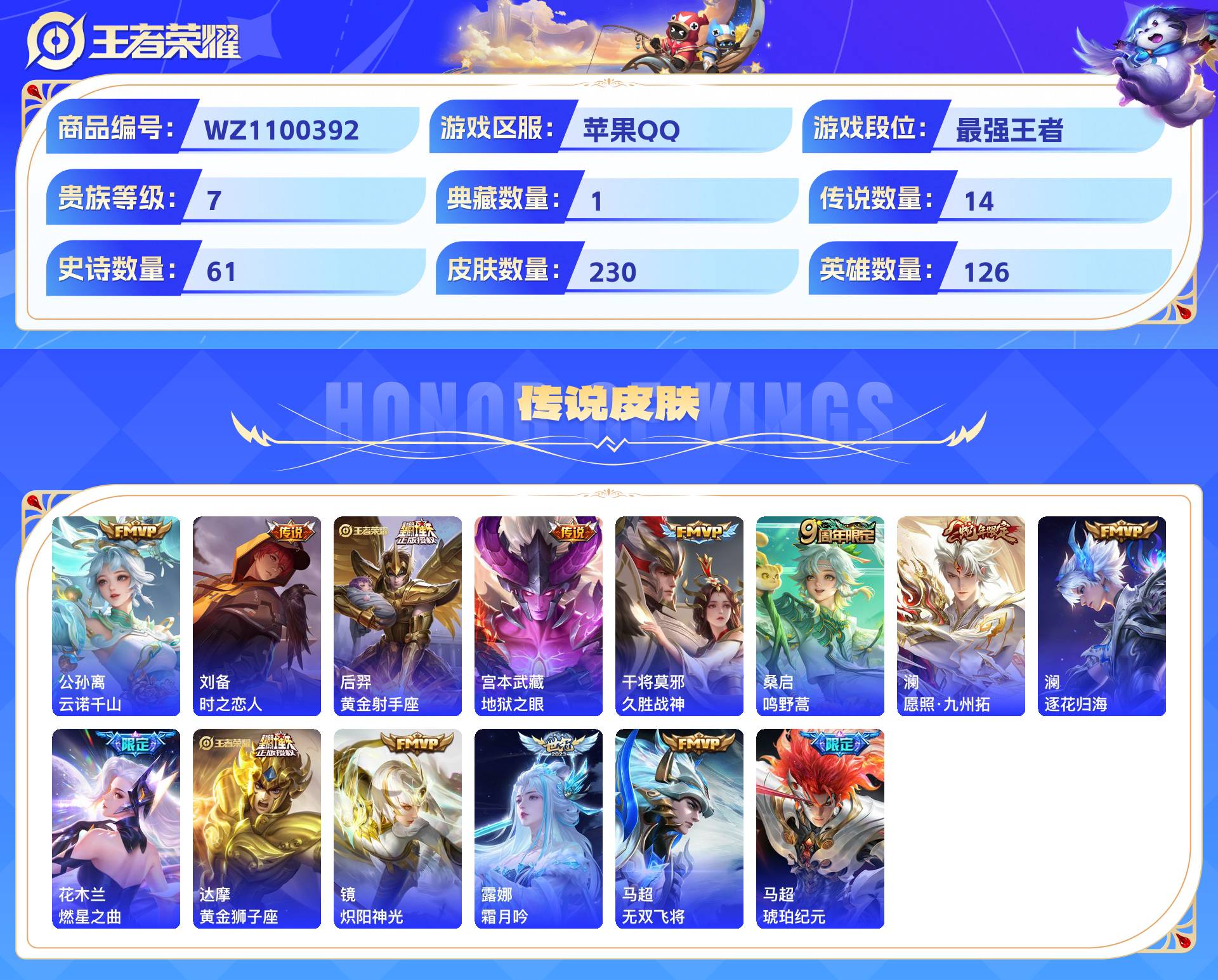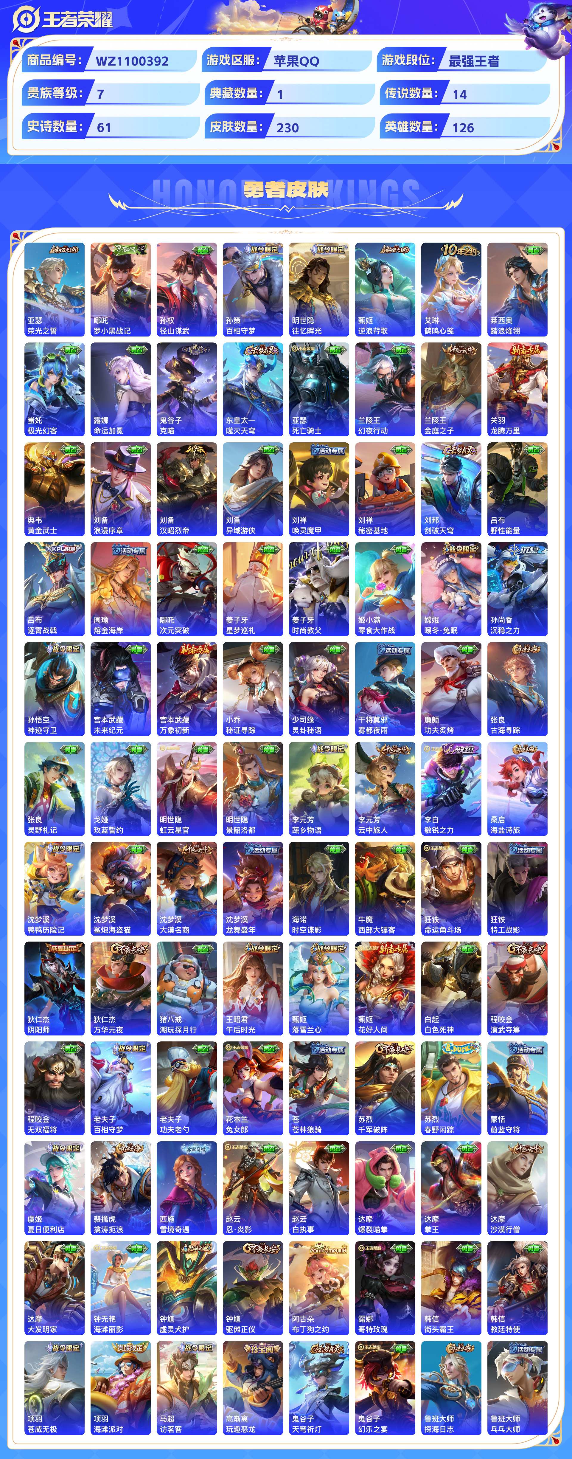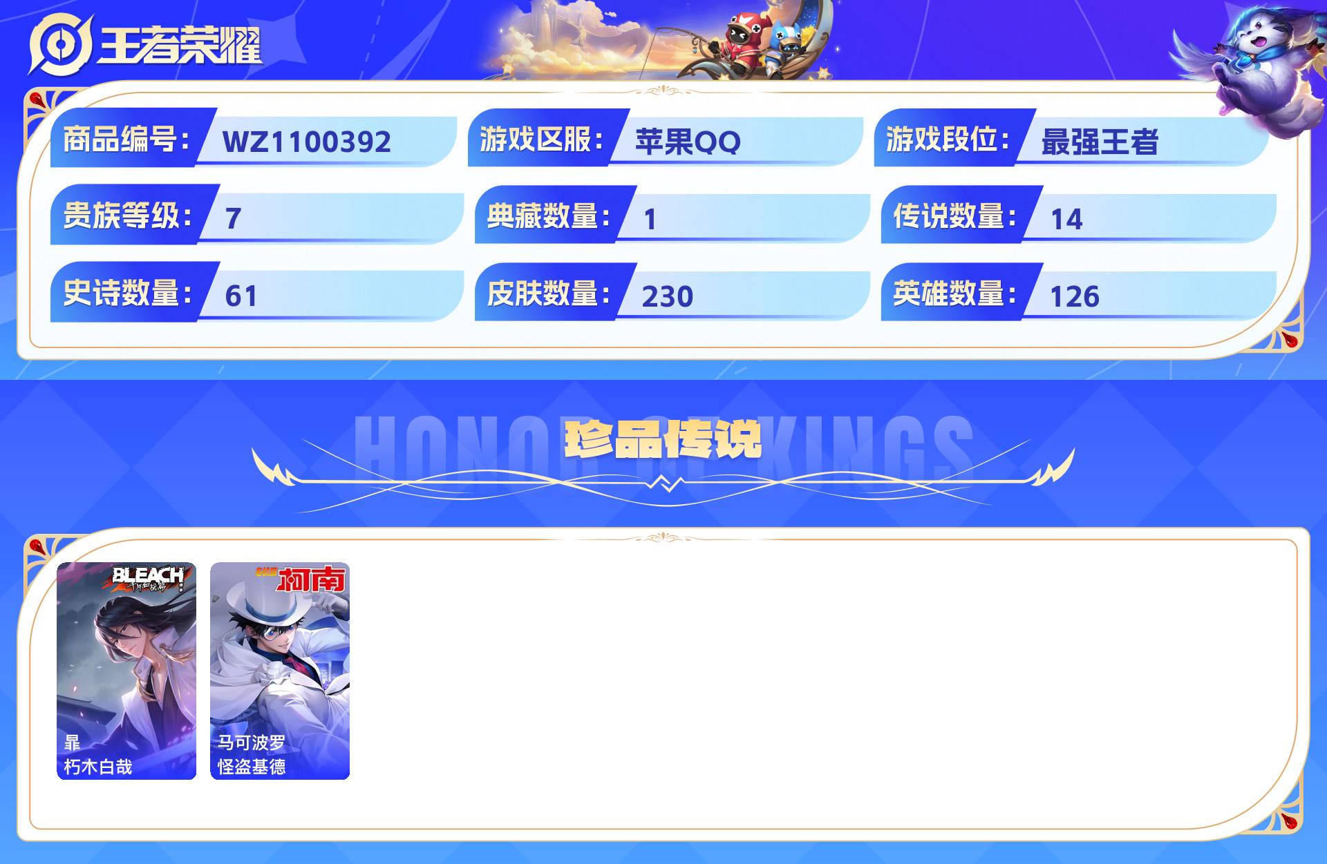 2324770-苹果qq 230皮 贵族7级 1典藏 2珍品传说 14传说 61史诗【荣耀典藏】九霄神辉【珍品传说】朽木白哉怪盗基德【传说皮肤】云诺千山时之恋人黄金射手座地狱之眼久胜战神鸣野蒿愿照·九州拓逐花归海燃星之曲黄金狮子座炽阳神光霜月吟无双飞将琥珀纪元【史诗皮肤】百相守梦巫礼祀神光弋星穹百相守梦魅语破空之剑箭羽风息无心暗隐猎兽者鸭鸭历险记