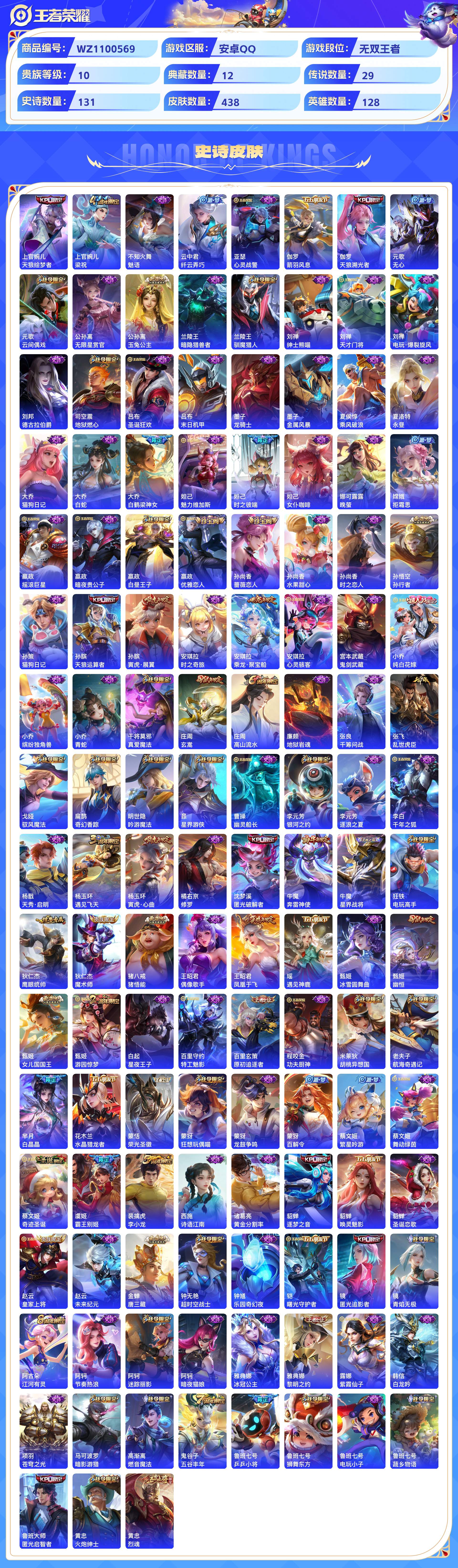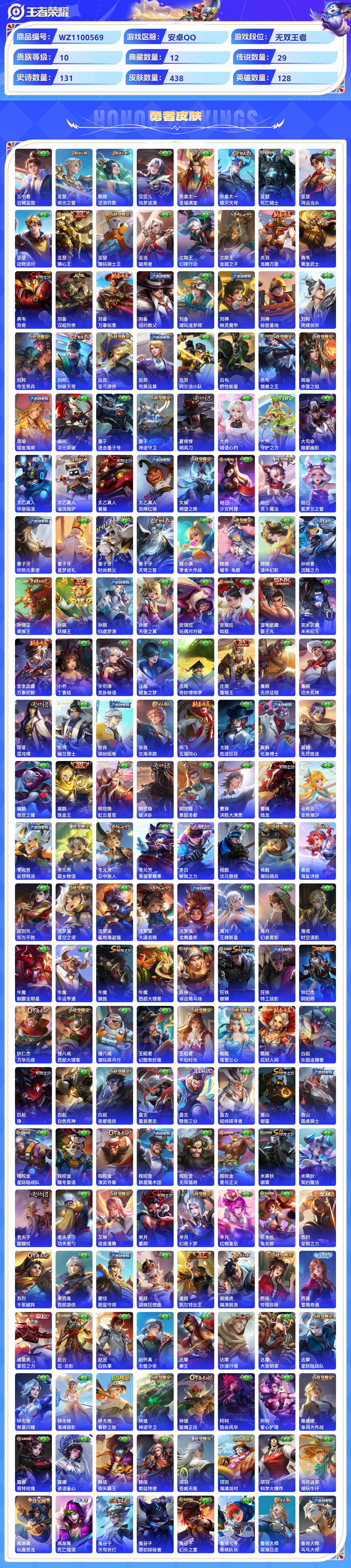 2324772-安卓qq 438皮 贵族10级 12典藏 1无双 29传说 131史诗【荣耀典藏】无限飓风号杀手不太冷天鹅之梦鸣剑·曳影倪克斯神谕拾光映像大秦宣太后神鉴启示录星域神启幻阙歌银白咏叹调星空梦想【无双限定】青丘·九尾【传说皮肤】祈雪灵祝时之恋人黄金射手座天魔缭乱音你心动补天末日机甲异界灵契音你心动久胜战神李 鸣野蒿胖达荣荣海洋之