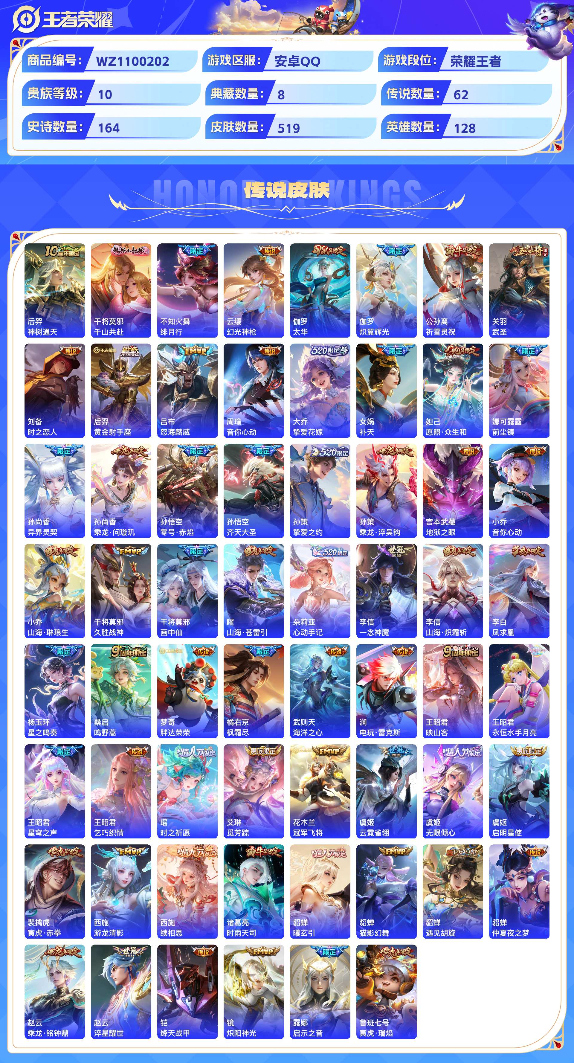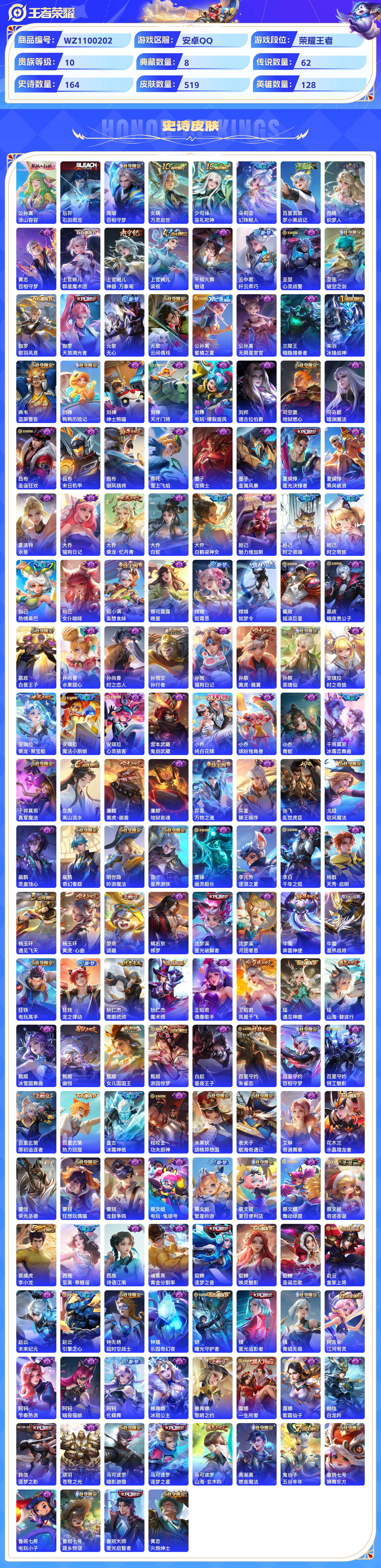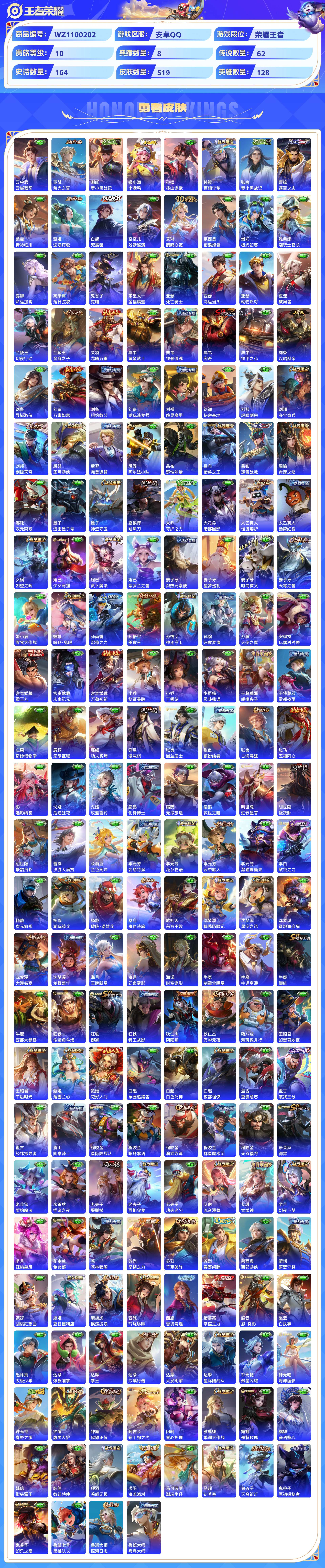 2324776-安卓qq 519皮 贵族10级 8典藏 3珍品传说 4无双 62传说 164史诗【荣耀典藏】赤影疾锋天鹅之梦鸣剑·曳影倪克斯神谕神鉴启示录幻阙歌银白咏叹调弑呛猎影【珍品传说】器灵·落星盏酷洛米之心大耳狗之梦【无双限定】青丘·九尾时之魔女神器·明辉仪雪境奇遇【传说皮肤】神树通天千山共赴绯月行幻光神呛太华炽翼辉光祈雪灵祝武圣时之恋人黄金射