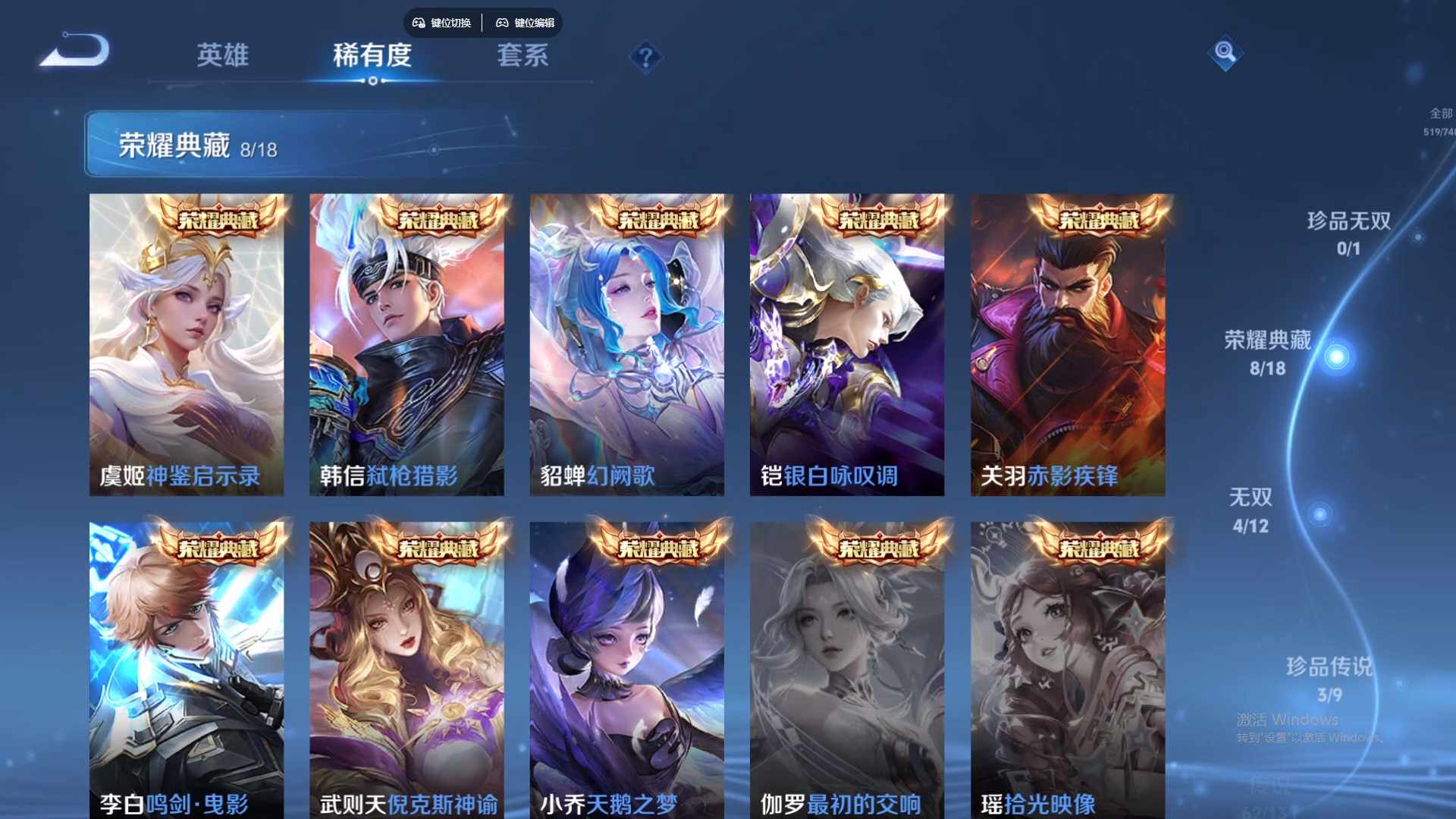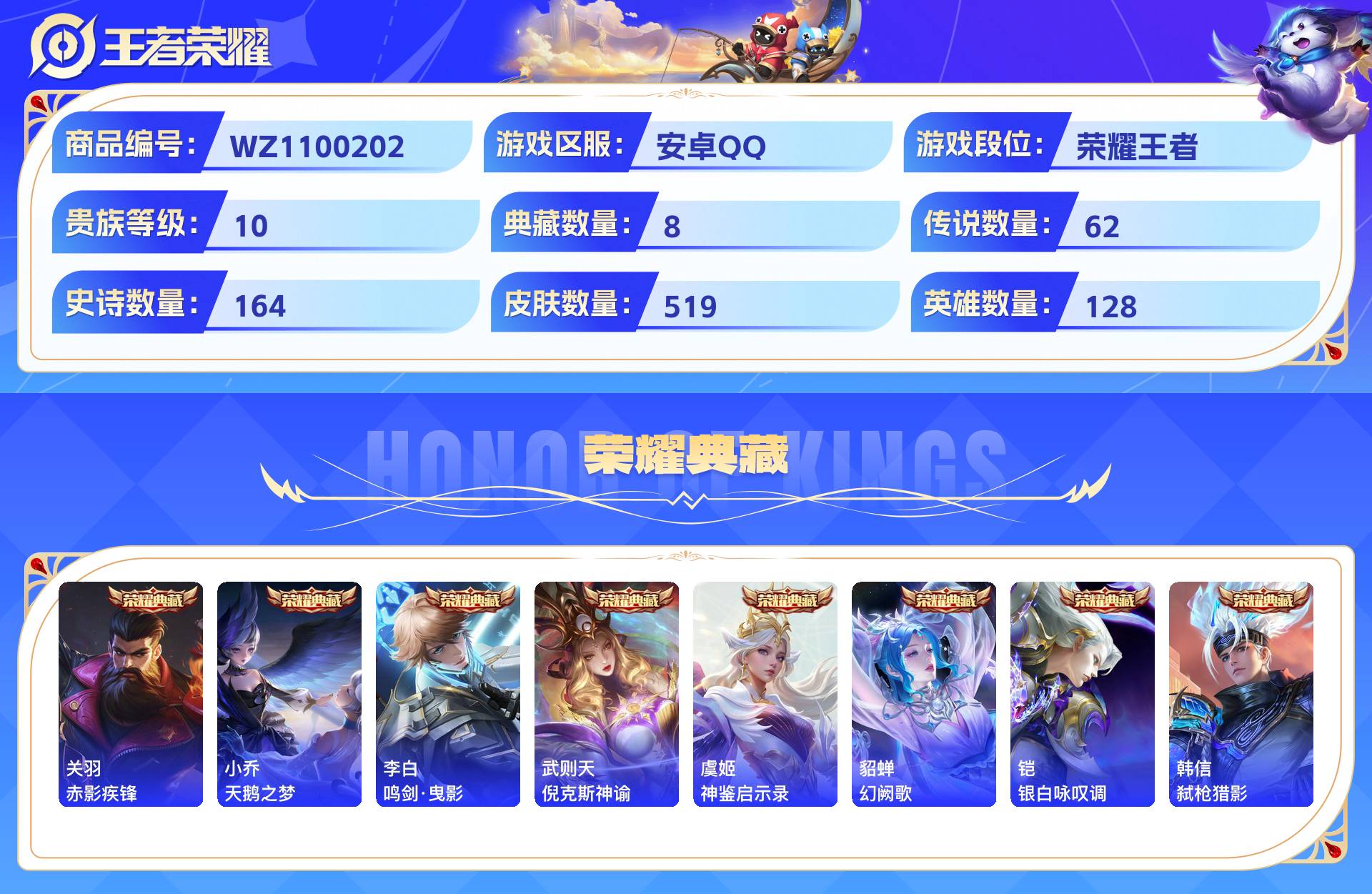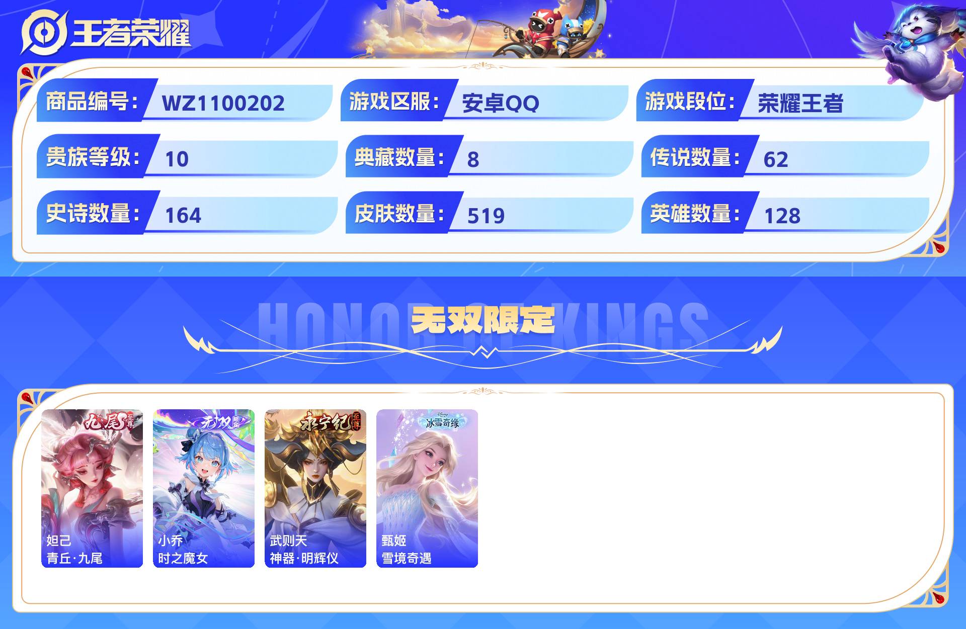 2324776-安卓qq 519皮 贵族10级 8典藏 3珍品传说 4无双 62传说 164史诗【荣耀典藏】赤影疾锋天鹅之梦鸣剑·曳影倪克斯神谕神鉴启示录幻阙歌银白咏叹调弑呛猎影【珍品传说】器灵·落星盏酷洛米之心大耳狗之梦【无双限定】青丘·九尾时之魔女神器·明辉仪雪境奇遇【传说皮肤】神树通天千山共赴绯月行幻光神呛太华炽翼辉光祈雪灵祝武圣时之恋人黄金射