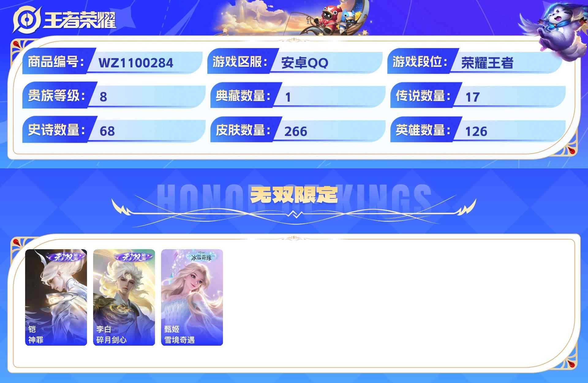 wz1100284|精品号安卓qq 贵族8级 266皮 1珍品无双 (馥梦繁花)1典藏(弑呛猎影) 1珍品传说(怪盗基德) 3无双(神罪碎月剑心雪境奇遇) 17传说(神树通天纵目迁山幻光神呛愿照·山河定霜北刀愿照·众生和) 68史诗1星传说17个性按键