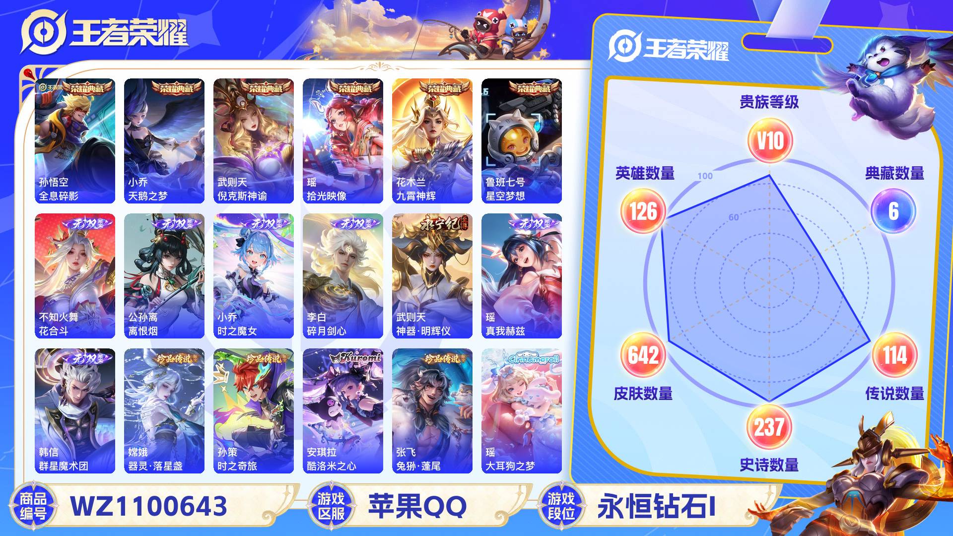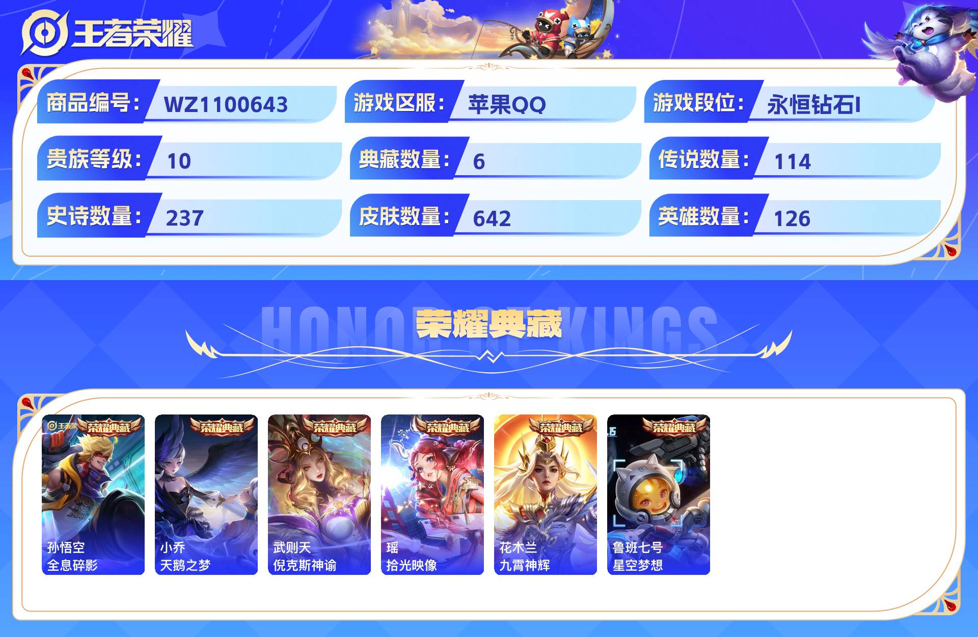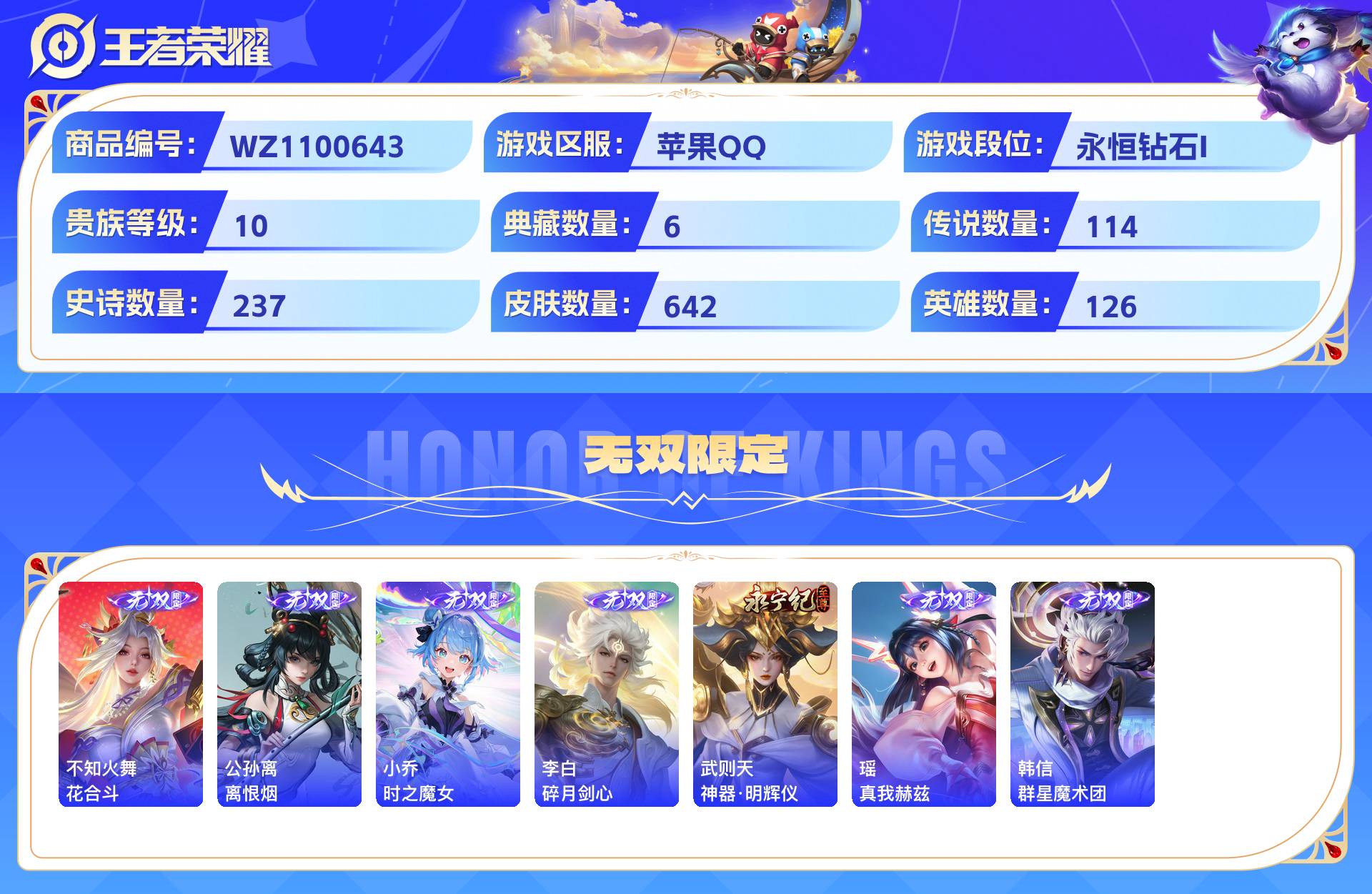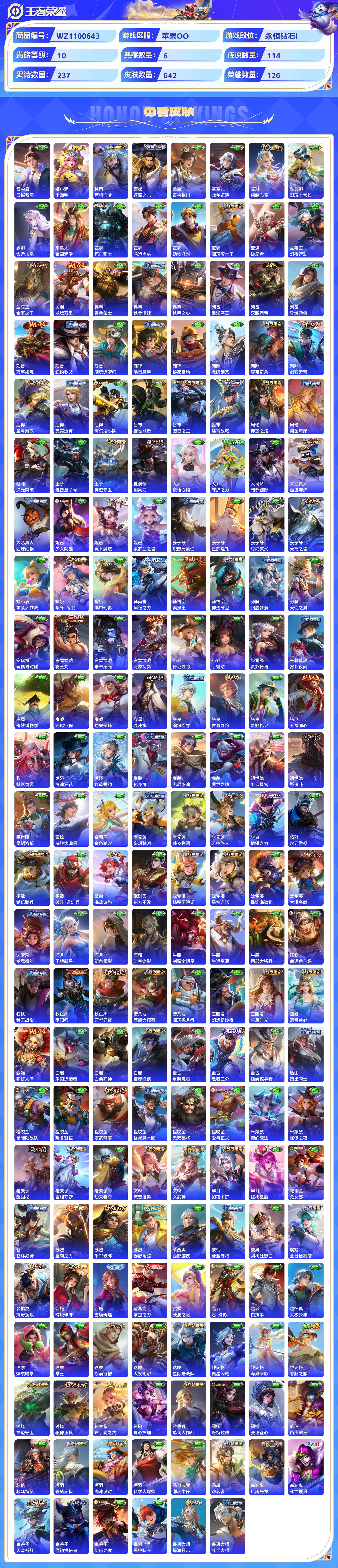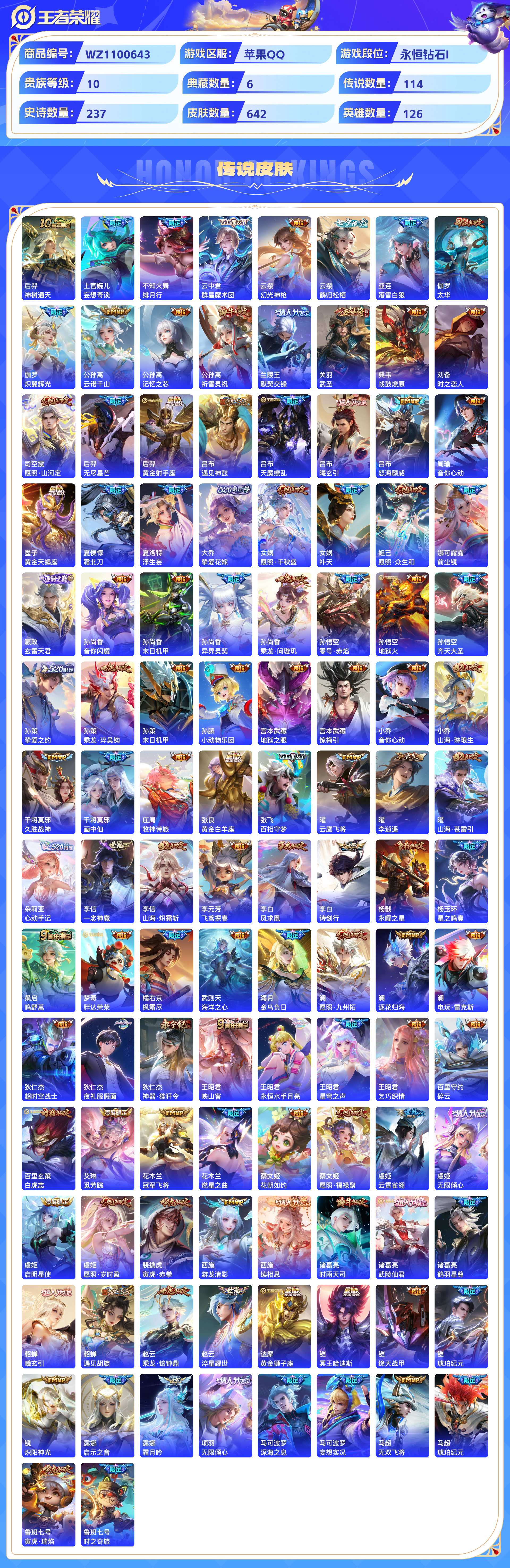 2324780-苹果qq 642皮 贵族10级 6典藏 7珍品传说 7无双 114传说 237史诗【荣耀典藏】全息碎影天鹅之梦倪克斯神谕拾光映像九霄神辉星空梦想【珍品传说】器灵·落星盏时之奇旅酷洛米之心兔狲·蓬尾大耳狗之梦怪盗基德江户川柯南【无双限定】花合斗离恨烟时之魔女碎月剑心神器·明辉仪真我赫兹群星魔术团【传说皮肤】神树通天妄想奇谈绯月行群星魔术团