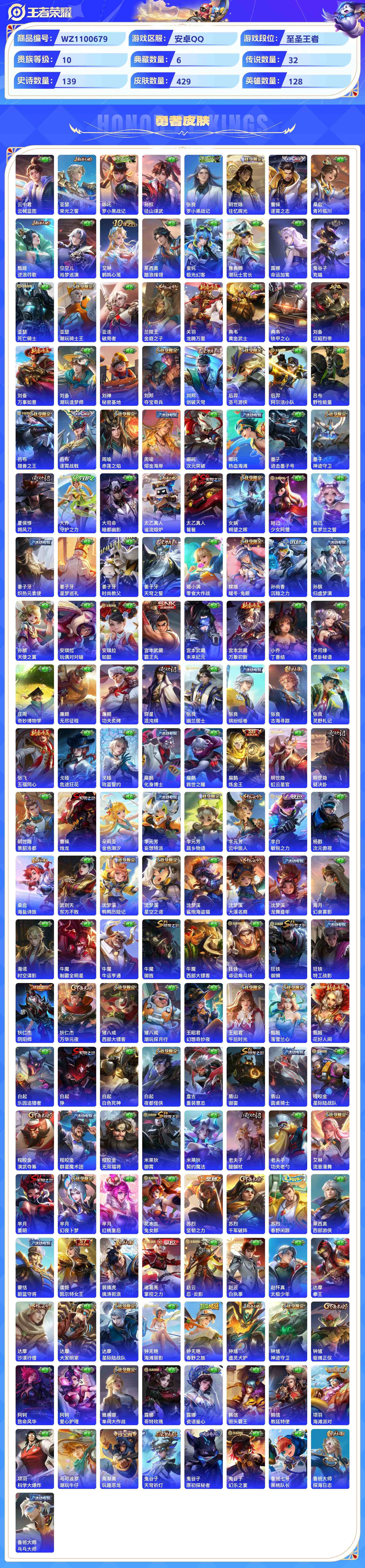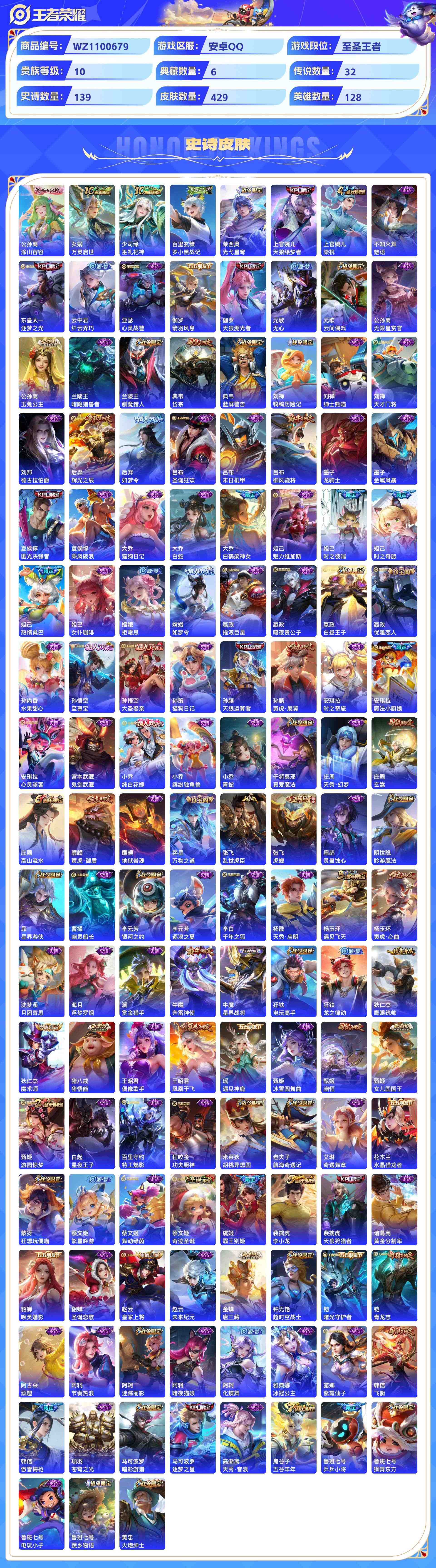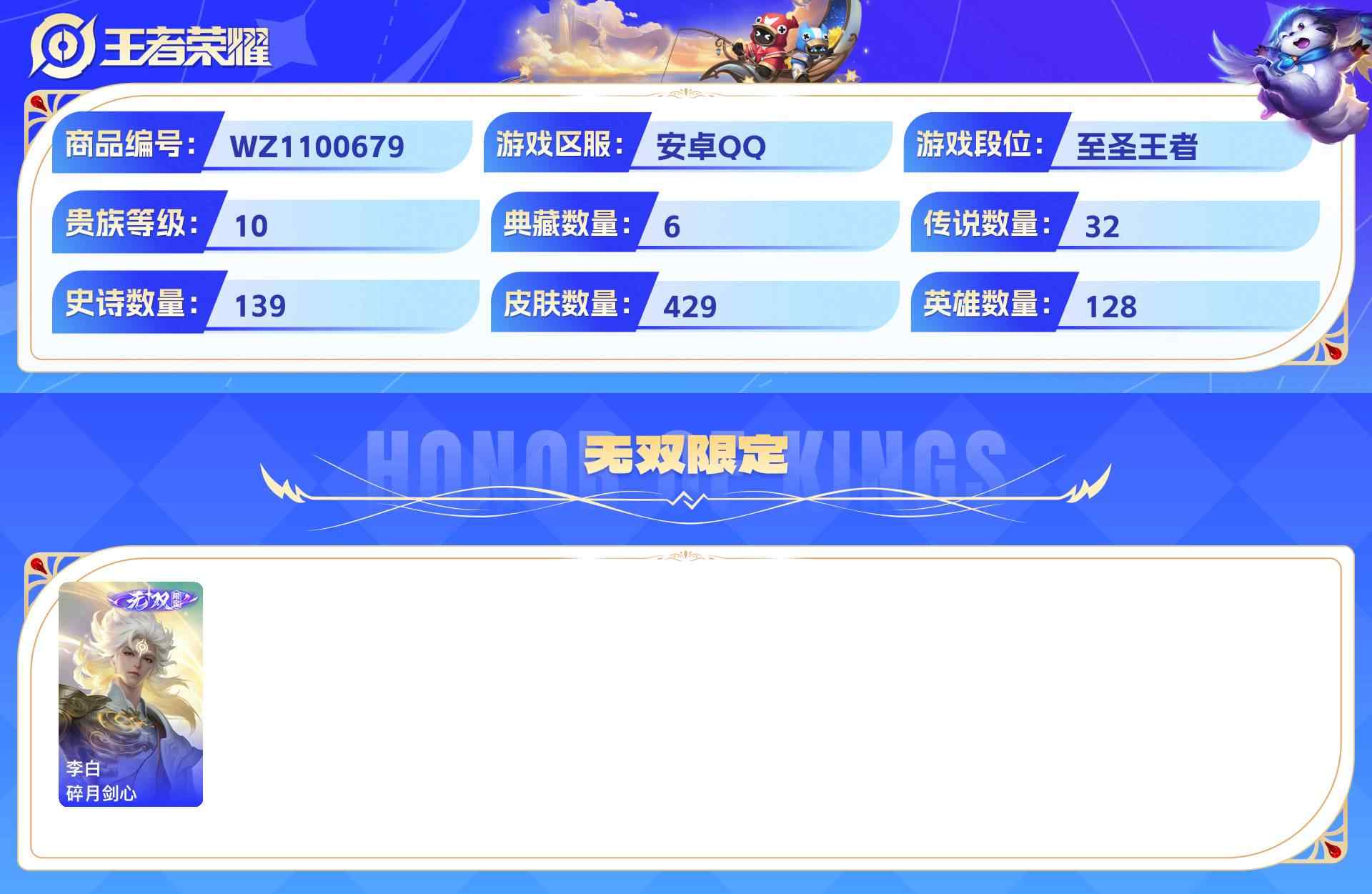 wz1100679|精品号安卓qq 贵族10级 429皮 6典藏(杀手不太冷天鹅之梦倪克斯神谕拾光映像大秦宣太后星空梦想) 1无双(碎月剑心) 32传说(神树通天太华时之恋人无尽星芒黄金射手座音你心动挚爱花嫁异界灵契地狱火挚爱之约末日机甲音你心动久胜战神黄金白羊座云鹰飞将心动手记一念神魔飞鸢探春鸣野蒿海洋之心) 139史诗2星传说9个性按键2天幕
