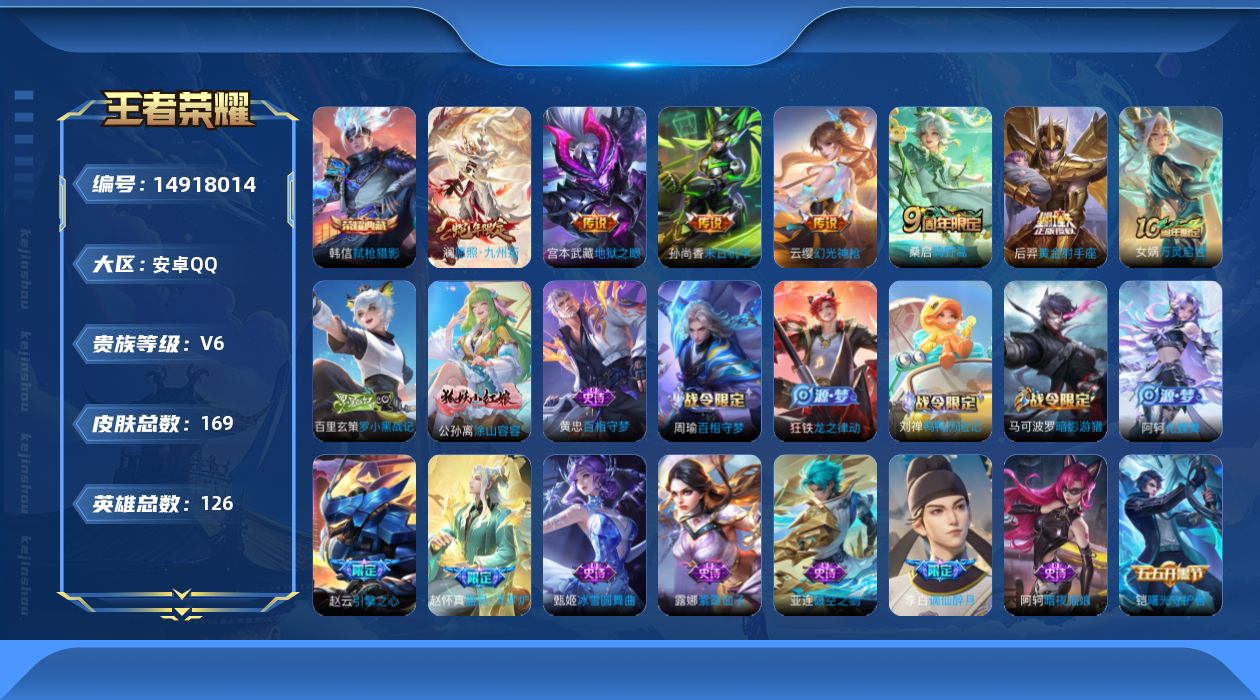 [14918014]安卓q-v6-永恒钻石iv段位-126英雄-169皮肤-1典藏皮肤-7传说-53史诗 【英雄全皮】:阿轲全皮,空空儿全皮,影全皮 【荣耀典藏】:韩信弑呛猎影 【传说皮肤】:后羿神树通天,澜愿照九州拓,云缨幻光神呛,桑启鸣野蒿,后羿黄金射手座,孙尚香末日机甲,宫本武藏地狱之眼 【限定皮肤】:姜子牙天穹之誓,李白谪仙醉月,狄仁杰阴阳师,赵云皇家上将,赵云引擎之心,高渐离玩趣恶龙,阿轲迷踪丽影,马可波罗暗影游猎,狄仁杰魔术师,项羽海滩派对,杨戬潮玩骑兵,云中君纤云弄巧,张良古海寻踪,鬼谷子天穹祈灯,沈梦溪龙舞盛年,鲁班七号蔬乡物语,李元芳蔬乡物语,刘邦剑破天穹,程咬金群星魔术团,镜青焰无极,项羽苍威无极,芈月浮光幕影,周瑜熔金海岸 【赛季限定】:张良古海寻踪,鬼谷子天穹祈灯,刘邦剑破天穹,姜子牙天穹之誓 【战令限定】:阿轲迷踪丽影,马可波罗暗影游猎,杨戬潮玩骑兵,鲁班七号蔬乡物语,李元芳蔬乡物语,镜青焰无极,项羽苍威无极 【史诗皮肤】:露娜紫霞仙子,阿轲暗夜猫娘,赵云皇家上将,赵云未来纪元,貂蝉圣诞恋歌,甄姬冰雪圆舞曲,狄仁杰魔术师,廉颇地狱岩魂,宫本武藏鬼剑武藏,孙尚香水果甜心,嬴政摇滚巨星,妲己魅力维加斯,妲己女仆咖啡,墨子金属风暴,吕布圣诞狂欢,吕布末日机甲,张飞乱世虎臣,赵云引擎之心,花木兰水晶猎龙者,夏侯惇乘风破浪,小乔缤纷独角兽,兰陵王暗隐猎兽者,百里守约特工魅影,铠曙光守护者,蔡文姬舞动绿茵,刘禅天才门将,李元芳逐浪之夏,白起星夜王子,阿轲节奏热浪,孙策猫狗日记,伽罗箭羽风息,狄仁杰鹰眼统帅,大乔白蛇,阿轲迷踪丽影,马可波罗暗影游猎,云中君纤云弄巧,鲁班七号蔬乡物语,镜青焰无极,芈月浮光幕影,亚连破空之剑,李白谪仙醉月,百里守约百相守梦,牛魔星界战将,孙膑茶境仙,赵怀真器灵浮梦炉,阿轲化蝶舞,刘禅鸭鸭历险记,狂铁龙之律动,周瑜百相守梦,黄忠百相守梦,公孙离涂山容容,百里玄策罗小黑战记,女娲万灵启世 【其他皮肤】:项羽海滩派对,露娜哥特玫瑰,阿轲致命风华,阿轲爱心护理,达摩大发明家,白起白色死神,宫本武藏未来纪元,妲己少女阿狸,典韦黄金武士,亚瑟死亡骑士,甄姬花好人间,刘备万事如意,后羿阿尔法小队,狄仁杰阴阳师,刘备纽约教父,关羽龙腾万里,孙尚香沉稳之力,李白敏锐之力,鬼谷子幻乐之宴,明世隐虹云星官,小乔丁香结,高渐离玩趣恶龙,哪吒次元突破,鲁班七号黑桃队长