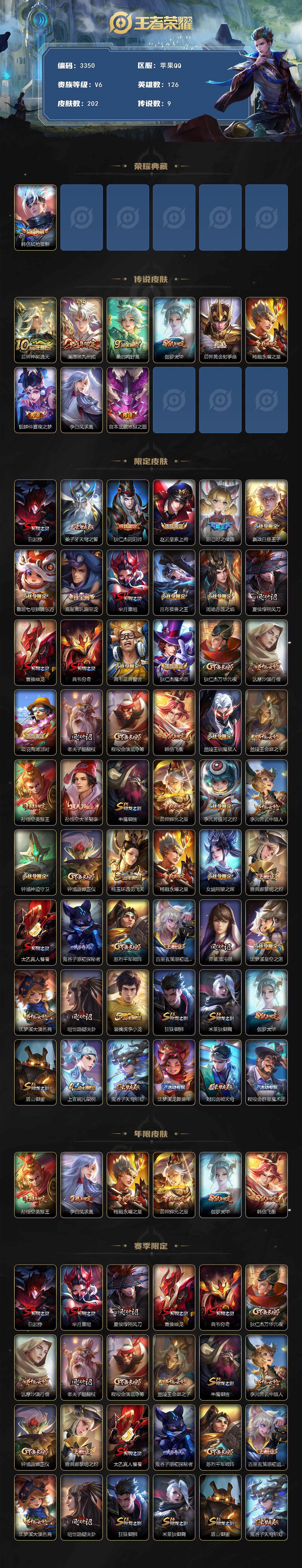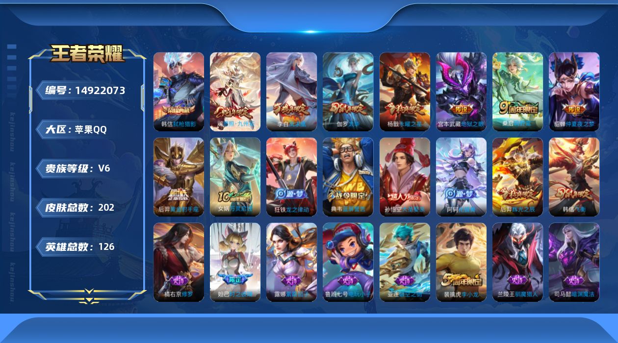 [14922073]苹果q-v6-最强王者段位-126英雄-202皮肤-1典藏皮肤-9传说-52史诗 【荣耀典藏】:韩信弑呛猎影 【传说皮肤】:后羿神树通天,澜愿照九州拓,桑启鸣野蒿,伽罗太华,后羿黄金射手座,杨戬永曜之星,貂蝉仲夏夜之梦,李白凤求凰,宫本武藏地狱之眼 【限定皮肤】:白起狰,姜子牙天穹之誓,狄仁杰阴阳师,赵云皇家上将,妲己时之彼端,嬴政白昼王子,鲁班七号狮舞东方,高渐离玩趣恶龙,芈月重明,吕布猎兽之王,周瑜赤莲之焰,夏侯惇朔风刀,曹操烛龙,典韦穷奇,典韦蓝屏警告,狄仁杰魔术师,狄仁杰万华元夜,达摩沙漠行僧,项羽海滩派对,老夫子醍醐杖,程咬金演武夺筹,韩信飞衡,兰陵王驯魔猎人,兰陵王金庭之子,孙悟空美猴王,孙悟空大圣娶亲,牛魔御旌,后羿辉光之辰,李元芳银河之约,李元芳云中旅人,钟馗神迹守卫,钟馗驱傩正仪,杨玉环遇见飞天,杨戬永曜之星,女娲朔望之晖,雅典娜黎明之约,太乙真人饕餮,鬼谷子原初探秘者,苏烈千军破阵,百里玄策原初追逐者,弈星混沌棋,沈梦溪星空之诺,沈梦溪大漠名商,明世隐疑决卦,裴擒虎李小龙,狂铁御狮,米莱狄御霄,伽罗太华,盾山御銮,上官婉儿梁祝,鬼谷子天穹祈灯,沈梦溪龙舞盛年,刘邦剑破天穹,程咬金群星魔术团 【年限皮肤】:孙悟空美猴王,李白凤求凰,杨戬永曜之星,后羿辉光之辰,伽罗太华,韩信飞衡 【赛季限定】:白起狰,芈月重明,夏侯惇朔风刀,曹操烛龙,典韦穷奇,狄仁杰万华元夜,达摩沙漠行僧,老夫子醍醐杖,程咬金演武夺筹,兰陵王金庭之子,牛魔御旌,李元芳云中旅人,钟馗驱傩正仪,雅典娜黎明之约,太乙真人饕餮,鬼谷子原初探秘者,苏烈千军破阵,百里玄策原初追逐者,弈星混沌棋,沈梦溪大漠名商,明世隐疑决卦,狂铁御狮,米莱狄御霄,盾山御銮,鬼谷子天穹祈灯,刘邦剑破天穹,姜子牙天穹之誓 【战令限定】:嬴政白昼王子,鲁班七号狮舞东方,吕布猎兽之王,周瑜赤莲之焰,典韦蓝屏警告,兰陵王驯魔猎人,李元芳银河之约,钟馗神迹守卫,女娲朔望之晖,沈梦溪星空之诺 【史诗皮肤】:鲁班七号电玩小子,露娜紫霞仙子,赵云皇家上将,貂蝉圣诞恋歌,狄仁杰魔术师,宫本武藏鬼剑武藏,孙尚香水果甜心,嬴政摇滚巨星,妲己魅力维加斯,妲己女仆咖啡,墨子金属风暴,曹操幽灵船长,李白千年之狐,张飞乱世虎臣,韩信白龙吟,花木兰水晶猎龙者,刘邦德古拉伯爵,夏侯惇乘风破浪,小乔缤纷独角兽,兰陵王暗隐猎兽者,诸葛亮黄金分割率,