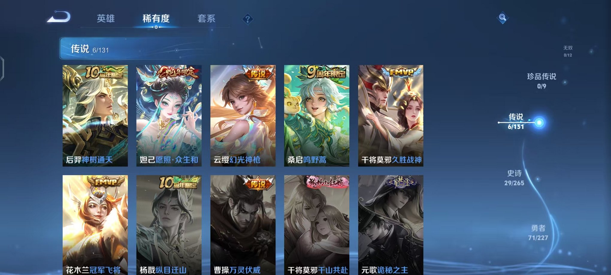 【6传说众生和久胜战神 安全保护中 】安卓v区-116英雄-117皮肤【传说皮肤】神树通天 鸣野蒿 幻光神呛 愿照·众生和 久胜战神 冠军飞将【史诗皮肤】万灵启世 巫礼祀神 龙之律动 石田雨龙 百相守梦 涂山容容 舞动绿茵 幽灵船长 功夫厨神 魅力维加斯 鹰眼统帅 箭羽风息 鬼剑武藏 水晶猎龙者 暗隐猎兽者 逐浪之夏 德古拉伯爵 天才门将 末日机甲 金属风暴 水果甜心 偶像歌手 心灵战警 摇滚巨