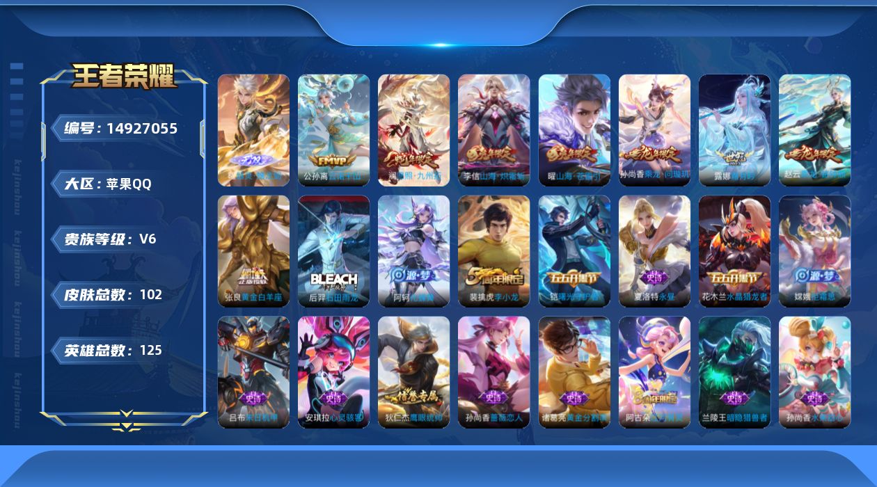 [14927055]高质量皮 v6-125英雄-102皮肤-1无双-8传说-22史诗 星币3000 cc8419 【无双皮肤】:曜器灵螭龙剑 【传说皮肤】:公孙离云诺千山,澜愿照九州拓,孙尚香乘龙问璇玑,赵云乘龙铭钟鼎,露娜霜月吟,曜山海苍雷引,李信山海炽霜斩,张良黄金白羊座 【限定皮肤】:姜子牙天穹之誓,狄仁杰阴阳师,赵云皇家上将,孙尚香蔷薇恋人,狄仁杰魔术师,达摩沙漠行僧,项羽海滩派对,兰陵王金庭之子,李元芳云中旅人,苏烈千军破阵,沈梦溪大漠名商,裴擒虎李小龙,裴擒虎擒涛扼浪,李信山海炽霜斩,嫦娥拒霜思,曜山海苍雷引,鲁班大师探海日志,桑启海盐诗旅,阿古朵江河有灵,张良古海寻踪,鬼谷子天穹祈灯,孙尚香乘龙问璇玑,赵云乘龙铭钟鼎,沈梦溪龙舞盛年,刘邦剑破天穹 【年限皮肤】:李信山海炽霜斩,曜山海苍雷引,孙尚香乘龙问璇玑,赵云乘龙铭钟鼎 【赛季限定】:达摩沙漠行僧,兰陵王金庭之子,张良古海寻踪,李元芳云中旅人,苏烈千军破阵,沈梦溪大漠名商,裴擒虎擒涛扼浪,鲁班大师探海日志,桑启海盐诗旅,鬼谷子天穹祈灯,刘邦剑破天穹,姜子牙天穹之誓 【史诗皮肤】:赵云皇家上将,貂蝉圣诞恋歌,王昭君偶像歌手,狄仁杰魔术师,孙尚香蔷薇恋人,孙尚香水果甜心,嬴政摇滚巨星,墨子金属风暴,吕布末日机甲,花木兰水晶猎龙者,兰陵王暗隐猎兽者,诸葛亮黄金分割率,安琪拉心灵骇客,铠曙光守护者,狄仁杰鹰眼统帅,裴擒虎李小龙,嫦娥拒霜思,夏洛特永昼,阿古朵江河有灵,牛魔星界战将,阿轲化蝶舞,后羿石田雨龙 【其他皮肤】:项羽海滩派对,韩信街头霸王,赵云忍炎影,芈月红桃皇后,程咬金爱与正义,白起白色死神,扁鹊救世之瞳,宫本武藏未来纪元,妲己少女阿狸,典韦黄金武士,花木兰兔女郎,张飞五福同心,甄姬花好人间,刘备万事如意,宫本武藏万象初新,狄仁杰阴阳师,刘备汉昭烈帝,关羽龙腾万里,钟无艳海滩丽影,狂铁命运角斗场,老夫子功夫老勺,李白敏锐之力,苏烈坚韧之力,明世隐虹云星官,盾山圆桌骑士,狂铁特工战影,鲁班大师乓乓大师,苏烈千军破阵,达摩沙漠行僧,刘邦虎啸剑宗,兰陵王金庭之子,刘禅唤灵魔甲,沈梦溪大漠名商,蒙恬蔚蓝守将,李元芳云中旅人,桑启海盐诗旅,猪八戒潮玩探月行,牛魔牛运亨通,赵怀真太极少年,裴擒虎擒涛扼浪,鲁班大师探海日志,李元芳妄想特派,张良古海寻踪,后羿完美运算,鬼谷子天穹祈灯,沈梦溪龙舞盛年,刘邦剑破天穹,姜子牙天穹之誓