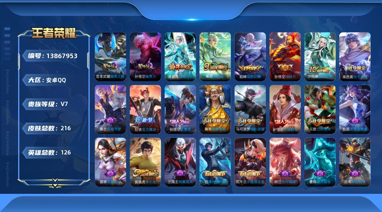 [13867953]安卓q-v7-216皮肤-5传说-50史诗 【传说皮肤】:后羿神树通天,桑启鸣野蒿,诸葛亮时雨天司,貂蝉猫影幻舞,孙悟空地狱火 【限定皮肤】:白起狰,蔡文姬夏日便利店,姜子牙天穹之誓,狄仁杰阴阳师,赵云皇家上将,孙尚香蔷薇恋人,鲁班七号狮舞东方,庄周高山流水,阿轲迷踪丽影,钟无艳王者之锤,芈月重明,周瑜赤莲之焰,元歌云间偶戏,夏侯惇朔风刀,曹操烛龙,典韦穷奇,典韦蓝屏警告,马可波罗暗影游猎,狄仁杰魔术师,狄仁杰万华元夜,达摩沙漠行僧,项羽海滩派对,老夫子醍醐杖,程咬金演武夺筹,刘邦夺宝奇兵,兰陵王驯魔猎人,兰陵王金庭之子,亚瑟潮玩骑士王,孙悟空至尊宝,孙悟空大圣娶亲,牛魔御旌,李元芳云中旅人,钟馗神迹守卫,钟馗驱傩正仪,杨玉环遇见飞天,女娲朔望之晖,蔡文姬繁星吟游,太乙真人饕餮,鬼谷子原初探秘者,诸葛亮时雨天司,弈星混沌棋,沈梦溪大漠名商,明世隐疑决卦,裴擒虎李小龙,裴擒虎擒涛扼浪,狂铁御狮,米莱狄御霄,盾山御銮,猪八戒西部大镖客,上官婉儿梁祝,鲁班大师探海日志,阿古朵江河有灵,张良古海寻踪,鬼谷子天穹祈灯,刘邦剑破天穹 【年限皮肤】:诸葛亮时雨天司 【赛季限定】:白起狰,芈月重明,夏侯惇朔风刀,曹操烛龙,典韦穷奇,狄仁杰万华元夜,达摩沙漠行僧,老夫子醍醐杖,程咬金演武夺筹,兰陵王金庭之子,张良古海寻踪,牛魔御旌,李元芳云中旅人,钟馗驱傩正仪,太乙真人饕餮,鬼谷子原初探秘者,弈星混沌棋,沈梦溪大漠名商,明世隐疑决卦,裴擒虎擒涛扼浪,狂铁御狮,米莱狄御霄,盾山御銮,鲁班大师探海日志,鬼谷子天穹祈灯,刘邦剑破天穹,姜子牙天穹之誓 【战令限定】:蔡文姬夏日便利店,鲁班七号狮舞东方,阿轲迷踪丽影,周瑜赤莲之焰,元歌云间偶戏,典韦蓝屏警告,马可波罗暗影游猎,刘邦夺宝奇兵,兰陵王驯魔猎人,亚瑟潮玩骑士王,钟馗神迹守卫,女娲朔望之晖,猪八戒西部大镖客 【史诗皮肤】:露娜紫霞仙子,钟无艳王者之锤,赵云皇家上将,甄姬冰雪圆舞曲,狄仁杰魔术师,宫本武藏鬼剑武藏,孙尚香蔷薇恋人,孙尚香水果甜心,嬴政摇滚巨星,妲己魅力维加斯,妲己女仆咖啡,墨子龙骑士,墨子金属风暴,吕布圣诞狂欢,曹操幽灵船长,李白千年之狐,吕布末日机甲,张飞乱世虎臣,孙悟空至尊宝,花木兰水晶猎龙者,刘邦德古拉伯爵,夏侯惇乘风破浪,雅典娜冰冠公主,安琪拉心灵骇客,百里守约特工魅影,铠曙光守护者,李元芳逐浪之夏,程咬金功夫厨