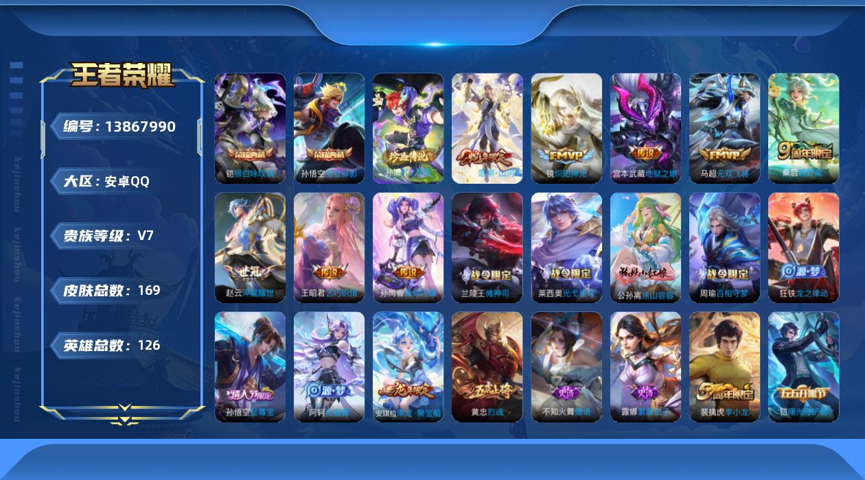 [13867990]安卓q-v7-169皮肤-2典藏-1珍品传说-10传说-46史诗 【荣耀典藏】:孙悟空全息碎影,铠银白咏叹调 【珍品传说】:孙策时之奇旅 【传说皮肤】:后羿神树通天,干将莫邪千山共赴,司空震愿照山河定,桑启鸣野蒿,孙尚香音你闪耀,马超无双飞将,赵云淬星耀世,王昭君乞巧织情,镜炽阳神光,宫本武藏地狱之眼 【限定皮肤】:姜子牙天穹之誓,狄仁杰阴阳师,赵云皇家上将,夏侯惇朔风刀,狄仁杰魔术师,狄仁杰万华元夜,达摩沙漠行僧,项羽海滩派对,老夫子醍醐杖,程咬金演武夺筹,兰陵王金庭之子,孙悟空至尊宝,牛魔御旌,李元芳云中旅人,钟馗驱傩正仪,鬼谷子原初探秘者,黄忠烈魂,百里玄策原初追逐者,弈星混沌棋,明世隐疑决卦,裴擒虎李小龙,裴擒虎擒涛扼浪,米莱狄御霄,桑启海盐诗旅,艾琳女武神,张良古海寻踪,高渐离燃音魔法,妲己灵卜魔法,鬼谷子天穹祈灯,安琪拉乘龙聚宝船,沈梦溪龙舞盛年 【年限皮肤】:黄忠烈魂,安琪拉乘龙聚宝船 【赛季限定】:夏侯惇朔风刀,狄仁杰万华元夜,达摩沙漠行僧,老夫子醍醐杖,程咬金演武夺筹,兰陵王金庭之子,张良古海寻踪,牛魔御旌,李元芳云中旅人,钟馗驱傩正仪,鬼谷子原初探秘者,百里玄策原初追逐者,弈星混沌棋,明世隐疑决卦,裴擒虎擒涛扼浪,米莱狄御霄,桑启海盐诗旅,鬼谷子天穹祈灯,姜子牙天穹之誓 【战令限定】:高渐离燃音魔法,妲己灵卜魔法 【史诗皮肤】:项羽苍穹之光,露娜紫霞仙子,赵云皇家上将,貂蝉圣诞恋歌,狄仁杰魔术师,廉颇地狱岩魂,宫本武藏鬼剑武藏,孙尚香水果甜心,嬴政摇滚巨星,妲己魅力维加斯,吕布圣诞狂欢,刘禅绅士熊喵,李白千年之狐,孙悟空至尊宝,刘邦德古拉伯爵,夏侯惇乘风破浪,兰陵王暗隐猎兽者,诸葛亮黄金分割率,亚瑟心灵战警,铠曙光守护者,蔡文姬舞动绿茵,李元芳逐浪之夏,程咬金功夫厨神,阿轲节奏热浪,孙策猫狗日记,狄仁杰鹰眼统帅,不知火舞魅语,黄忠烈魂,百里玄策原初追逐者,裴擒虎李小龙,蒙犽龙鼓争鸣,杨戬天秀启明,沈梦溪月团寄思,钟馗乐园奇幻夜,夏洛特永昼,刘禅电玩爆裂旋风,妲己灵卜魔法,高渐离燃音魔法,安琪拉乘龙聚宝船,百里守约百相守梦,孙膑茶境仙,阿轲化蝶舞,狂铁龙之律动,周瑜百相守梦,公孙离涂山容容,莱西奥光弋星穹,兰陵王傩神司 【其他皮肤】:项羽海滩派对,韩信教廷特使,韩信街头霸王,阿轲爱心护理,赵云忍炎影,芈月红桃皇后,艾琳女武神,程咬金爱与正义,白起