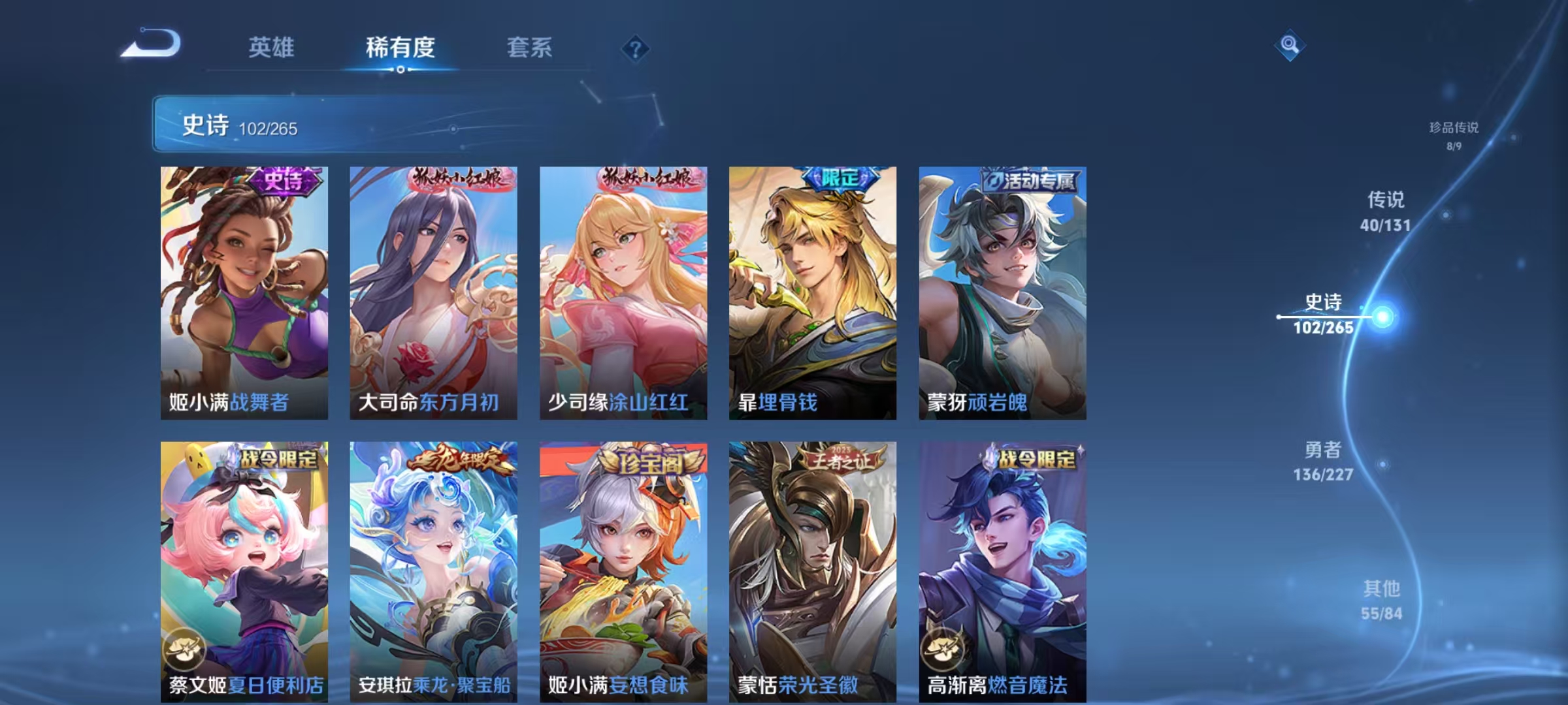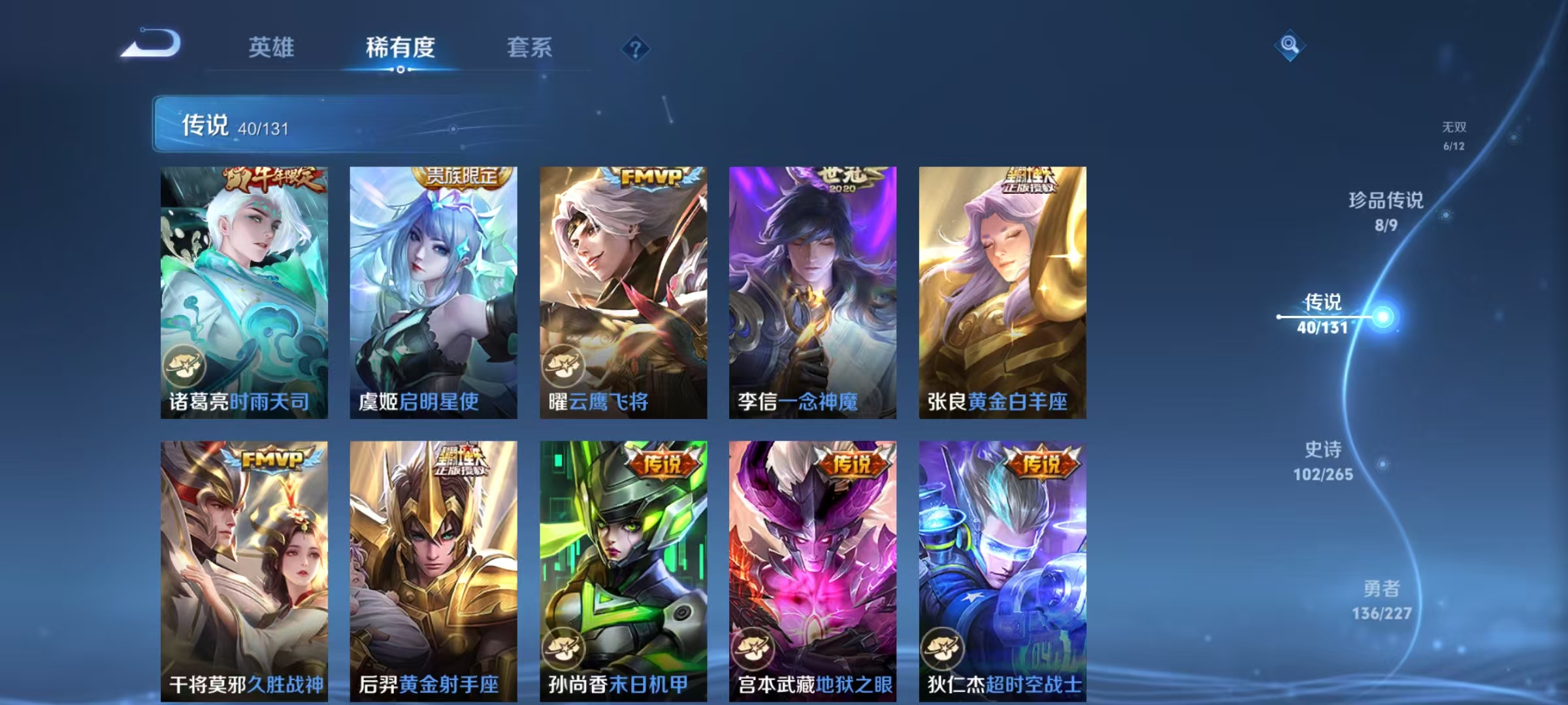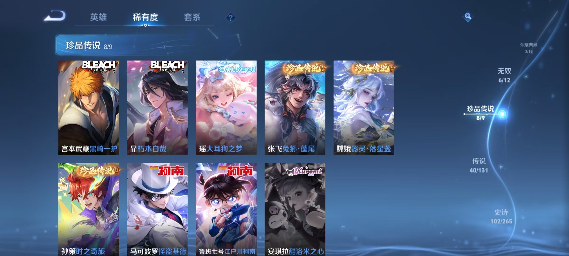 v9 精氪号 背包亲密度道具多多 350皮 3典藏(弑呛猎影 鸣剑·曳影 无限飓风号)6无双(时之魔女 群星魔术团 神罪 雪境奇遇 天机白泽 器灵·螭龙剑)8珍品(器灵·落星盏 黑崎一护 怪盗基德 时之奇旅 兔狲·蓬尾 江户川柯南 朽木白哉 大耳狗之梦)40传说(久胜战神 超时空战士 牧神诗旅 千山共赴 时雨天司 鸣野蒿 遇见神鼓 霜月吟 时之奇旅 鹤羽星尊 百相守梦 冥王哈迪斯 怒海麟威 浮生妄 淬星耀世 画中仙 记忆之芯 霜北刀 李 纵目迁山 云诺千山 碎云 黄金天蝎座 祈雪灵祝 末日机甲 愿照·山河定 神树通天 黄金射手座 音你心动 启明星使 万灵伏威 愿照·千秋盛 地狱之眼 琥珀纪元 愿照·岁时盈 一念神魔 妄想实况 云鹰飞将 黄金白羊座 诗剑行)102史诗(飞衡 青春决赛季 傲雪梅呛 至尊宝 御风骁将 山海·玄木吟 大圣娶亲 谪仙醉月 东方月初 埋骨钱)棉花糖聚会天幕 怪盗基德天幕