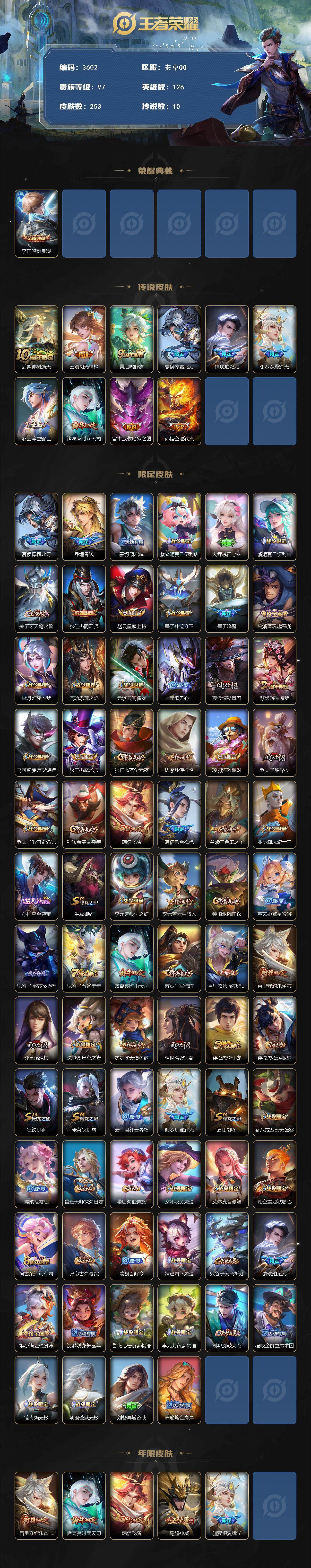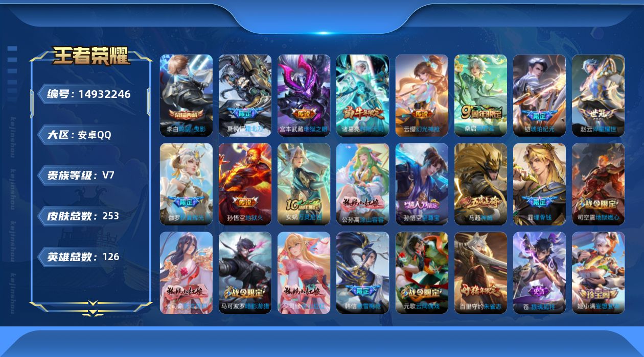 [14932246]安卓q-v6-最强王者段位-126英雄-253皮肤-1典藏皮肤-10传说-70史诗 【英雄全皮】:孙权全皮,苍全皮,空空儿全皮,影全皮 【荣耀典藏】:李白鸣剑曳影 【传说皮肤】:后羿神树通天,云缨幻光神呛,桑启鸣野蒿,夏侯惇霜北刀,铠琥珀纪元,伽罗炽翼辉光,赵云淬星耀世,诸葛亮时雨天司,宫本武藏地狱之眼,孙悟空地狱火 【限定皮肤】:夏侯惇霜北刀,暃埋骨钱,蒙犽顽岩魄,蔡文姬夏日便利店,大乔绒语心约,虞姬夏日便利店,姜子牙天穹之誓,狄仁杰阴阳师,赵云皇家上将,墨子神迹守卫,墨子降魔,高渐离玩趣恶龙,芈月幻夜卜梦,周瑜赤莲之焰,元歌云间偶戏,元歌无心,夏侯惇朔风刀,甄姬游园惊梦,马可波罗暗影游猎,狄仁杰魔术师,狄仁杰万华元夜,达摩沙漠行僧,项羽海滩派对,老夫子醍醐杖,老夫子航海奇遇记,程咬金演武夺筹,韩信飞衡,韩信傲雪梅呛,兰陵王金庭之子,亚瑟潮玩骑士王,孙悟空至尊宝,牛魔御旌,李元芳银河之约,李元芳云中旅人,钟馗驱傩正仪,蔡文姬繁星吟游,鬼谷子原初探秘者,鬼谷子五谷丰年,诸葛亮时雨天司,苏烈千军破阵,百里玄策原初追逐者,百里守约朱雀志,弈星混沌棋,沈梦溪星空之诺,沈梦溪大漠名商,明世隐疑决卦,裴擒虎李小龙,裴擒虎擒涛扼浪,狂铁御狮,米莱狄御霄,云中君纤云弄巧,伽罗炽翼辉光,盾山御銮,猪八戒西部大镖客,嫦娥拒霜思,鲁班大师探海日志,桑启海盐诗旅,戈娅驭风魔法,艾琳流音漫舞,司空震地狱燃心,阿古朵江河有灵,张良古海寻踪,蒙犽百解令,妲己灵卜魔法,鬼谷子天穹祈灯,铠琥珀纪元,姬小满妄想食味,沈梦溪龙舞盛年,鲁班七号蔬乡物语,李元芳蔬乡物语,刘邦剑破天穹,程咬金群星魔术团,镜青焰无极,项羽苍威无极,刘备异域游侠,周瑜熔金海岸 【年限皮肤】:百里守约朱雀志,诸葛亮时雨天司,韩信飞衡,马超神威,伽罗炽翼辉光 【赛季限定】:夏侯惇朔风刀,狄仁杰万华元夜,达摩沙漠行僧,老夫子醍醐杖,程咬金演武夺筹,兰陵王金庭之子,张良古海寻踪,牛魔御旌,李元芳云中旅人,钟馗驱傩正仪,鬼谷子原初探秘者,苏烈千军破阵,百里玄策原初追逐者,弈星混沌棋,沈梦溪大漠名商,明世隐疑决卦,裴擒虎擒涛扼浪,狂铁御狮,米莱狄御霄,盾山御銮,鲁班大师探海日志,桑启海盐诗旅,鬼谷子天穹祈灯,刘邦剑破天穹,姜子牙天穹之誓 【战令限定】:墨子神迹守卫,蔡文姬夏日便利店,虞姬夏日便利店,芈月幻夜卜梦,周瑜赤莲之焰,元歌云间偶