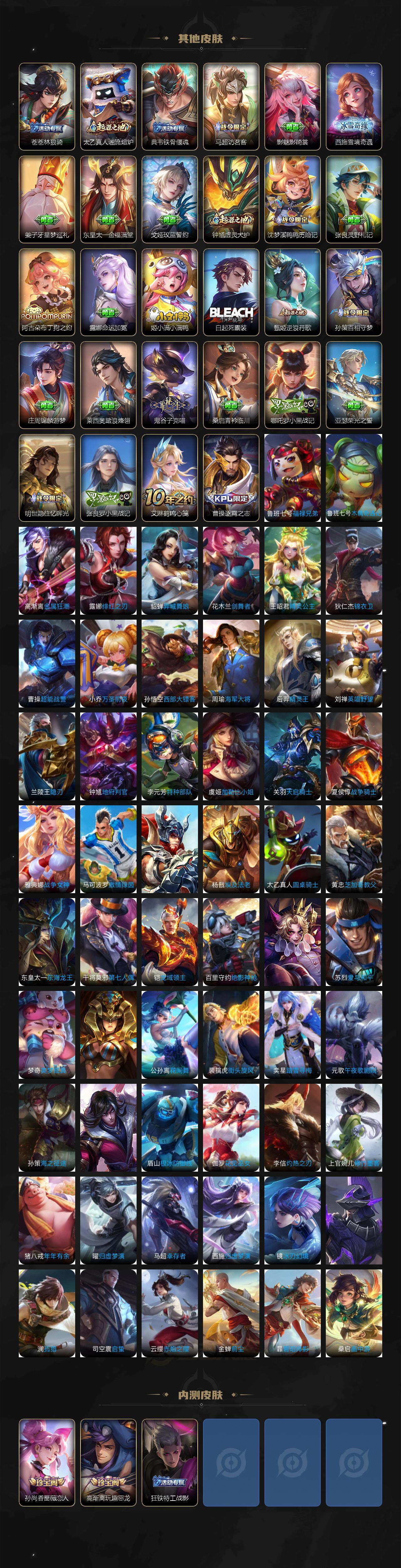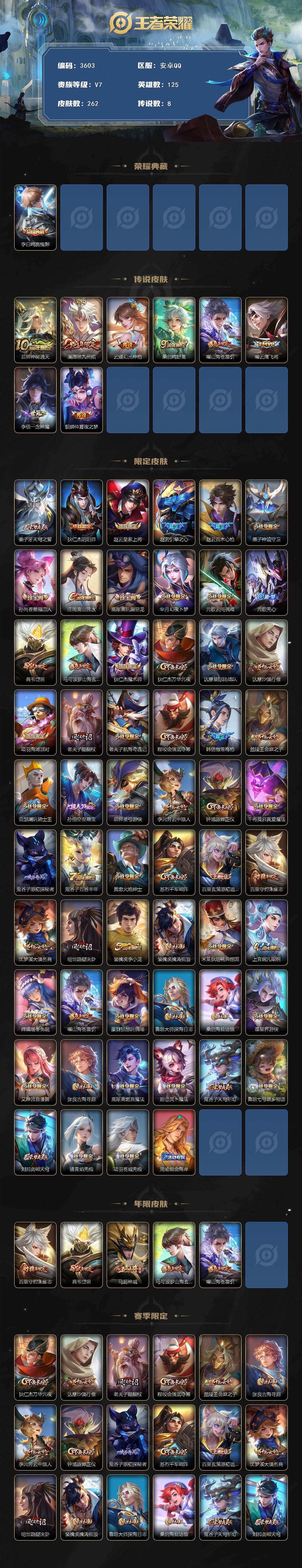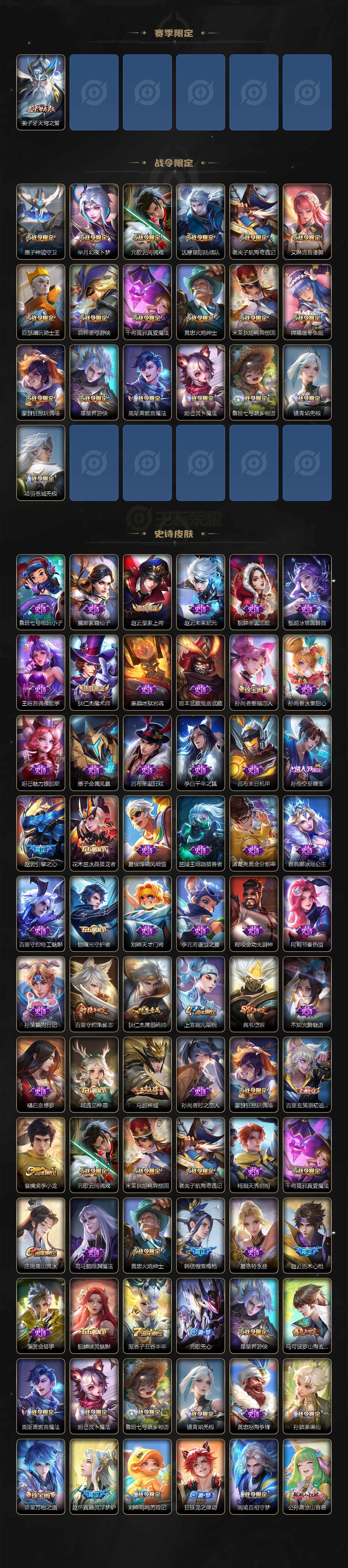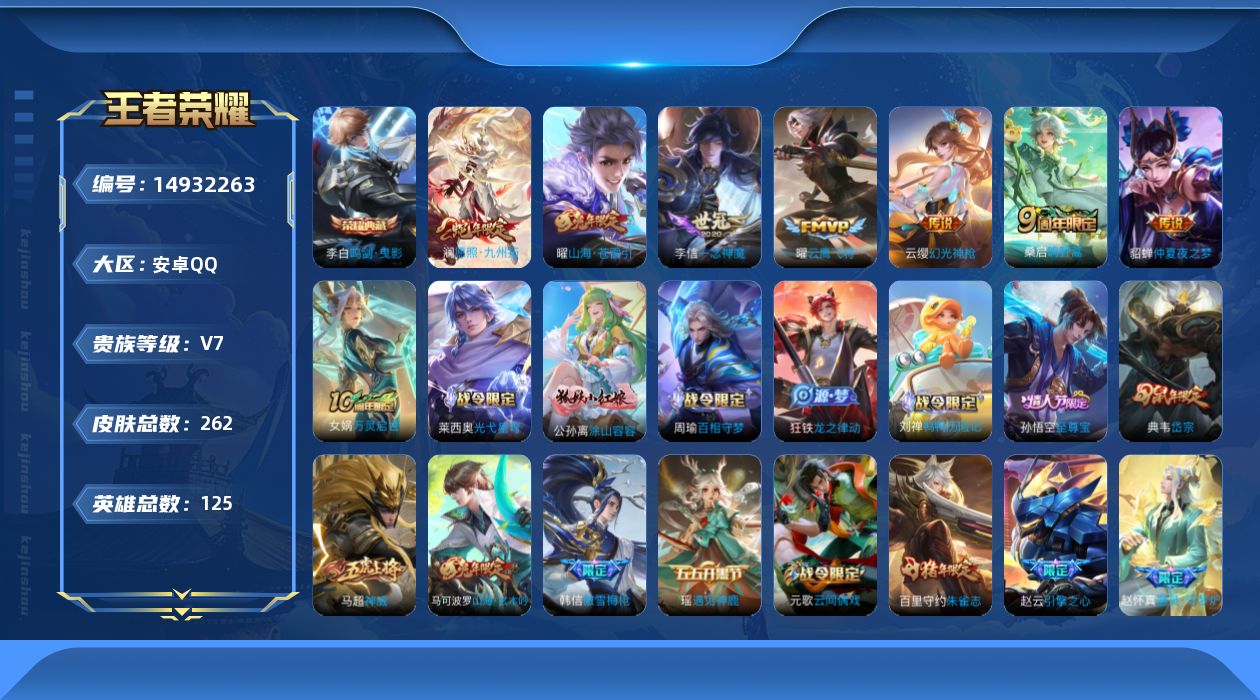 [14932263]安卓q-v7-最强王者段位-125英雄-262皮肤-1典藏皮肤-8传说-73史诗 【英雄全皮】:影全皮 【荣耀典藏】:李白鸣剑曳影 【传说皮肤】:后羿神树通天,澜愿照九州拓,云缨幻光神呛,桑启鸣野蒿,曜山海苍雷引,曜云鹰飞将,李信一念神魔,貂蝉仲夏夜之梦 【限定皮肤】:姜子牙天穹之誓,狄仁杰阴阳师,赵云皇家上将,赵云引擎之心,赵云百木心呛,墨子神迹守卫,孙尚香蔷薇恋人,庄周高山流水,高渐离玩趣恶龙,芈月幻夜卜梦,元歌云间偶戏,元歌无心,典韦岱宗,马可波罗山海玄木吟,狄仁杰魔术师,狄仁杰万华元夜,达摩星际陆战队,达摩沙漠行僧,项羽海滩派对,老夫子醍醐杖,老夫子航海奇遇记,程咬金演武夺筹,韩信傲雪梅呛,兰陵王金庭之子,亚瑟潮玩骑士王,孙悟空至尊宝,后羿圣弓游侠,李元芳云中旅人,钟馗驱傩正仪,干将莫邪真爱魔法,鬼谷子原初探秘者,鬼谷子五谷丰年,黄忠火炮绅士,苏烈千军破阵,百里玄策原初追逐者,百里守约朱雀志,沈梦溪大漠名商,明世隐疑决卦,裴擒虎李小龙,裴擒虎擒涛扼浪,米莱狄胡桃异想国,上官婉儿梁祝,嫦娥暖冬兔眠,曜山海苍雷引,蒙犽狂想玩偶喵,鲁班大师探海日志,桑启海盐诗旅,暃星界游侠,艾琳流音漫舞,张良古海寻踪,高渐离燃音魔法,妲己灵卜魔法,鬼谷子天穹祈灯,鲁班七号蔬乡物语,刘邦剑破天穹,镜青焰无极,项羽苍威无极,周瑜熔金海岸 【年限皮肤】:百里守约朱雀志,典韦岱宗,马超神威,马可波罗山海玄木吟,曜山海苍雷引 【赛季限定】:狄仁杰万华元夜,达摩沙漠行僧,老夫子醍醐杖,程咬金演武夺筹,兰陵王金庭之子,张良古海寻踪,李元芳云中旅人,钟馗驱傩正仪,鬼谷子原初探秘者,苏烈千军破阵,百里玄策原初追逐者,沈梦溪大漠名商,明世隐疑决卦,裴擒虎擒涛扼浪,鲁班大师探海日志,桑启海盐诗旅,鬼谷子天穹祈灯,刘邦剑破天穹,姜子牙天穹之誓 【战令限定】:墨子神迹守卫,芈月幻夜卜梦,元歌云间偶戏,达摩星际陆战队,老夫子航海奇遇记,艾琳流音漫舞,亚瑟潮玩骑士王,后羿圣弓游侠,干将莫邪真爱魔法,黄忠火炮绅士,米莱狄胡桃异想国,嫦娥暖冬兔眠,蒙犽狂想玩偶喵,暃星界游侠,高渐离燃音魔法,妲己灵卜魔法,鲁班七号蔬乡物语,镜青焰无极,项羽苍威无极 【史诗皮肤】:鲁班七号电玩小子,露娜紫霞仙子,赵云皇家上将,赵云未来纪元,貂蝉圣诞恋歌,甄姬冰雪圆舞曲,王昭君偶像歌手,狄仁杰魔术师,廉颇地狱岩魂,宫本武藏鬼剑武藏,