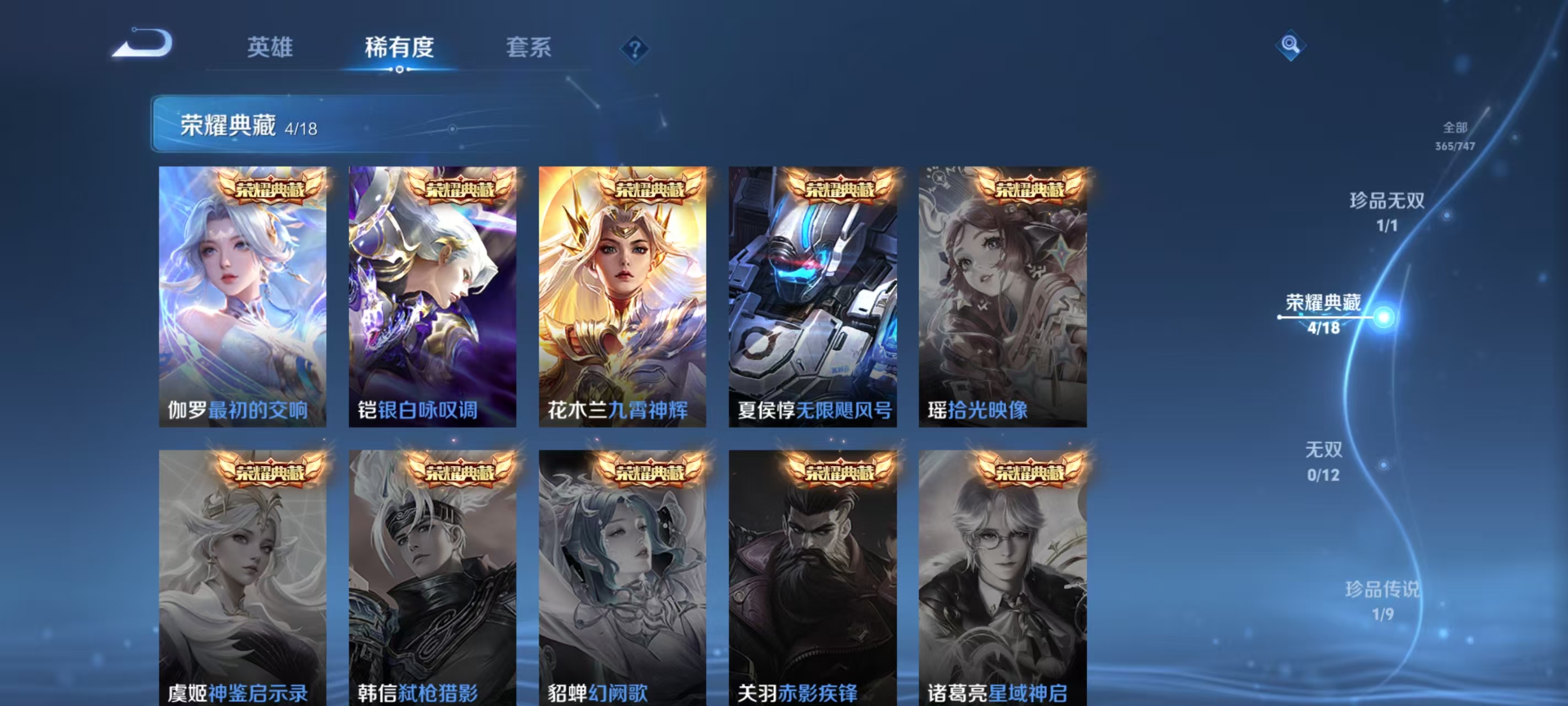 v9 365皮肤4典藏1珍品无双貂蝉1珍品 馥梦繁花 最初的交响,银白咏叹调,无限飓风号,九霄神辉 黑崎一护 霜北刀,琥珀纪元,神树通天,愿照·岁时盈,愿照·千秋盛,幻光神呛,时之恋人,愿照·山河定,愿照·九州拓,画中仙,战鼓燎原,黄金射手座,末日机甲,无限倾心,山海·苍雷引,怒海麟威,诗剑行,碎云,枫霜尽,启明星使,李 ,无双飞将,淬星耀世,时雨天司,超时空战士,零号·赤焰,黄金狮子座,一念神魔,白虎志,猫影幻舞,久胜战神,音你心动,鸣野蒿,云鹰飞将,祥瑞亨通