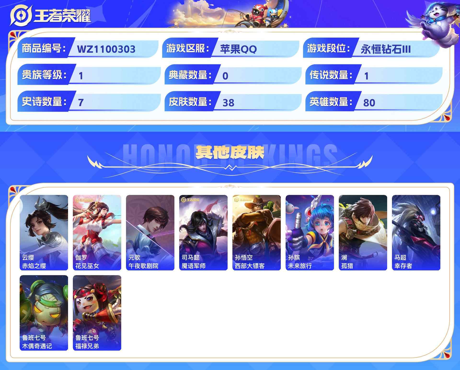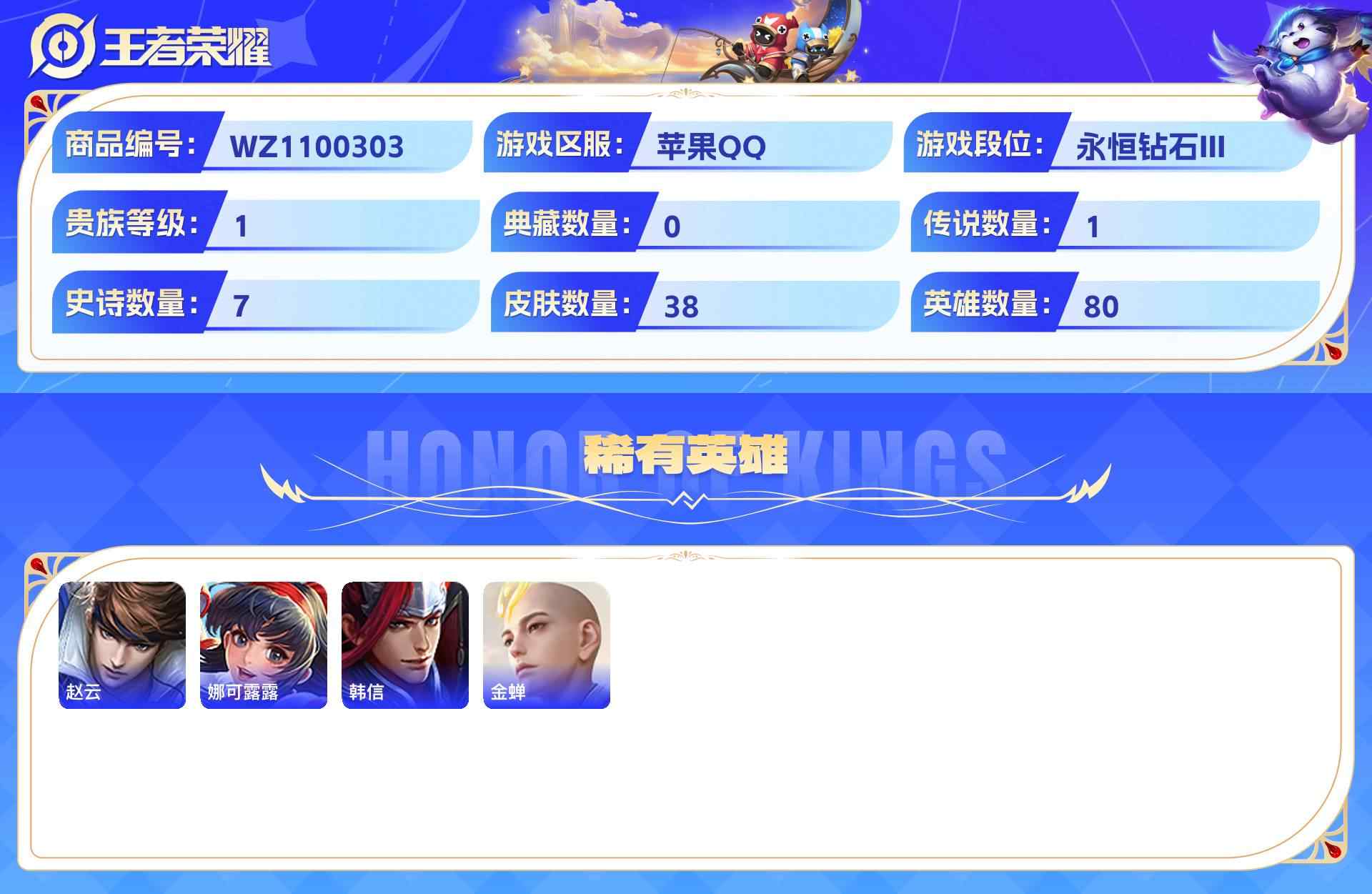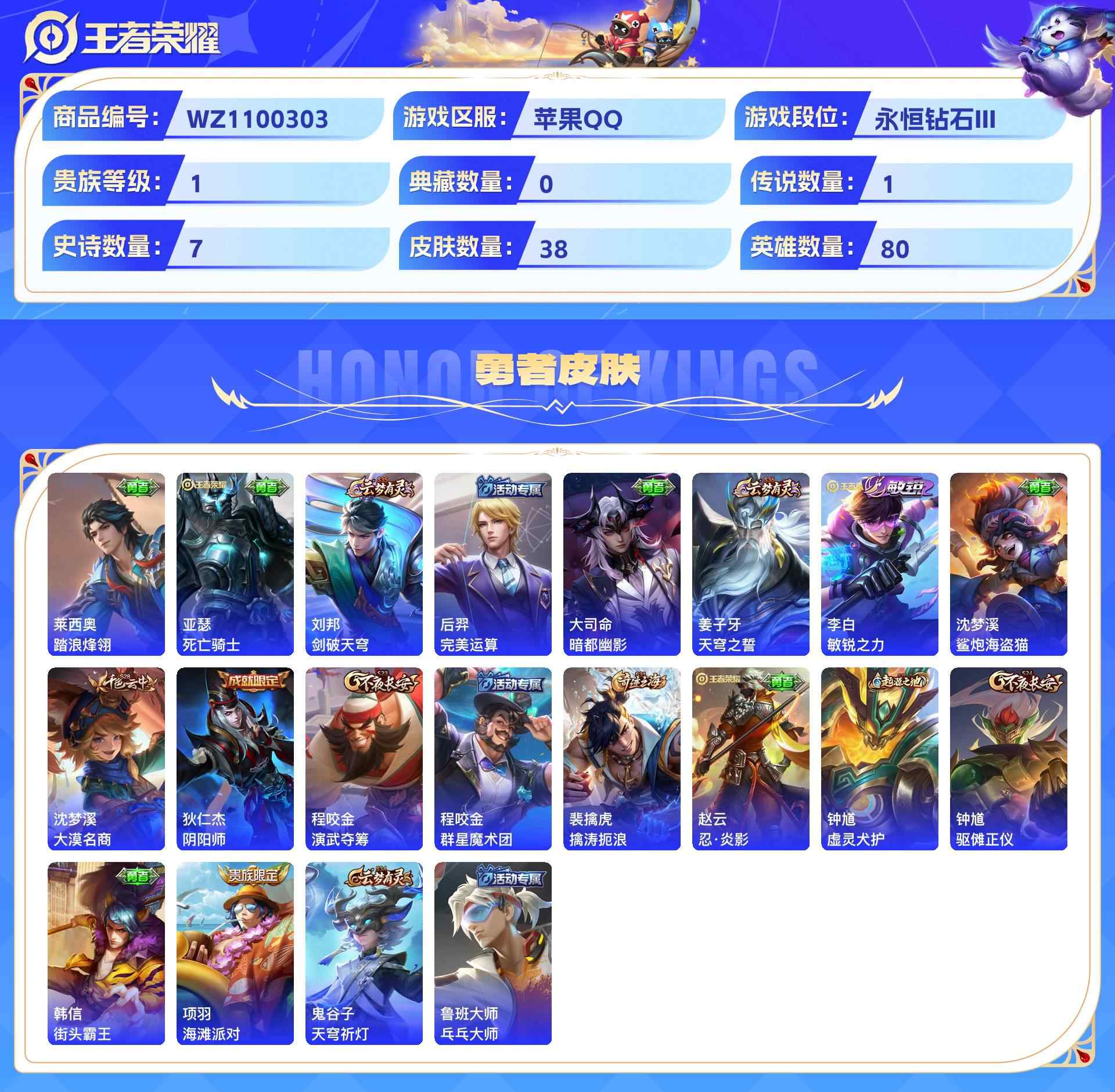 wz1100303|精品入坑号可二次苹果qq 贵族4级 38皮 贵族4级 1传说李 7史诗(百相守梦暗隐猎兽者东方月初魅力维加斯龙之律动鹰眼统帅冰冠公主)