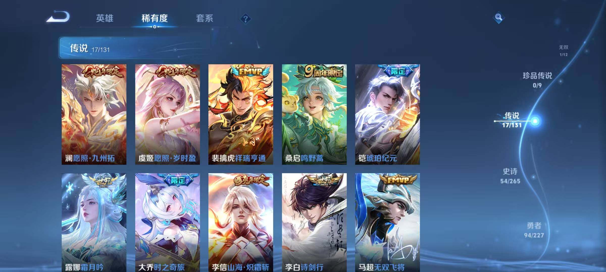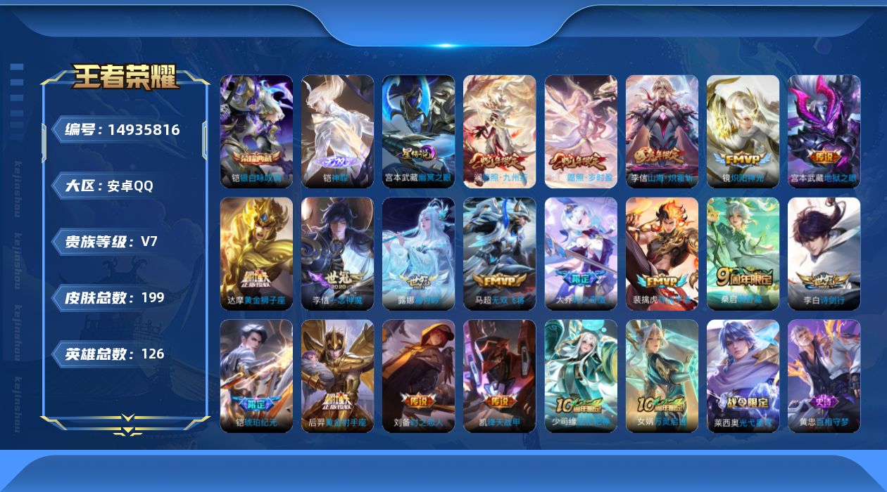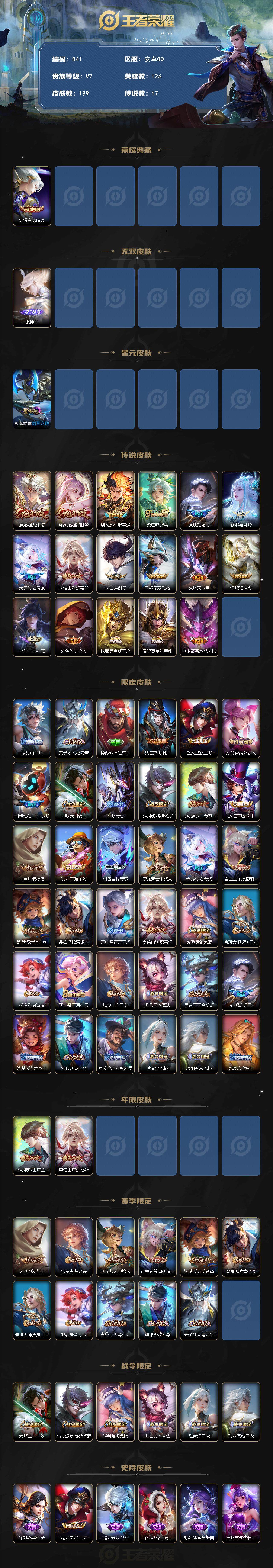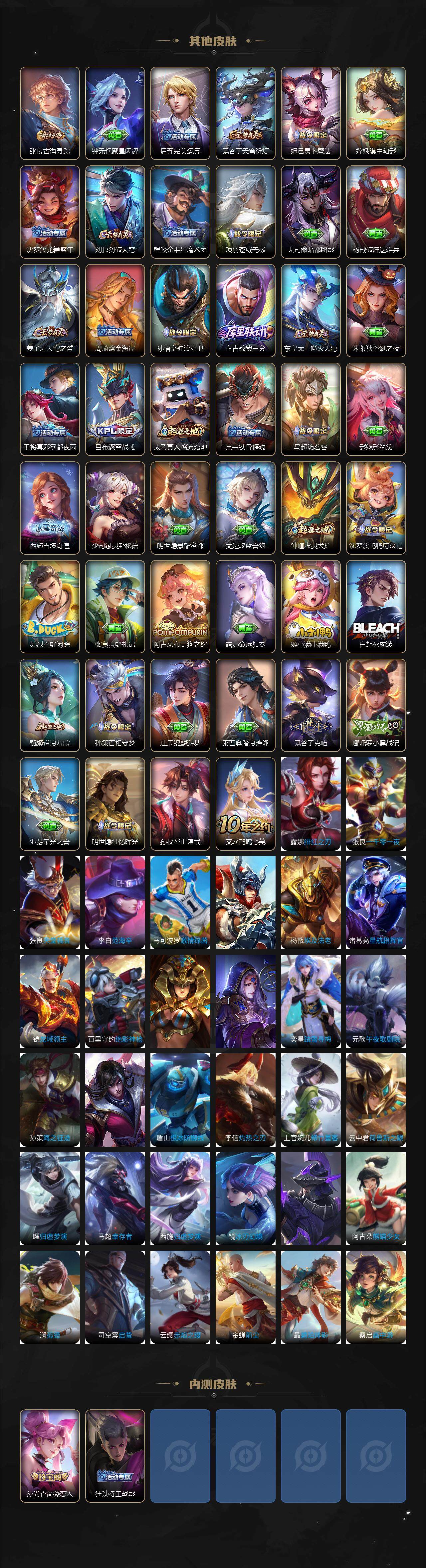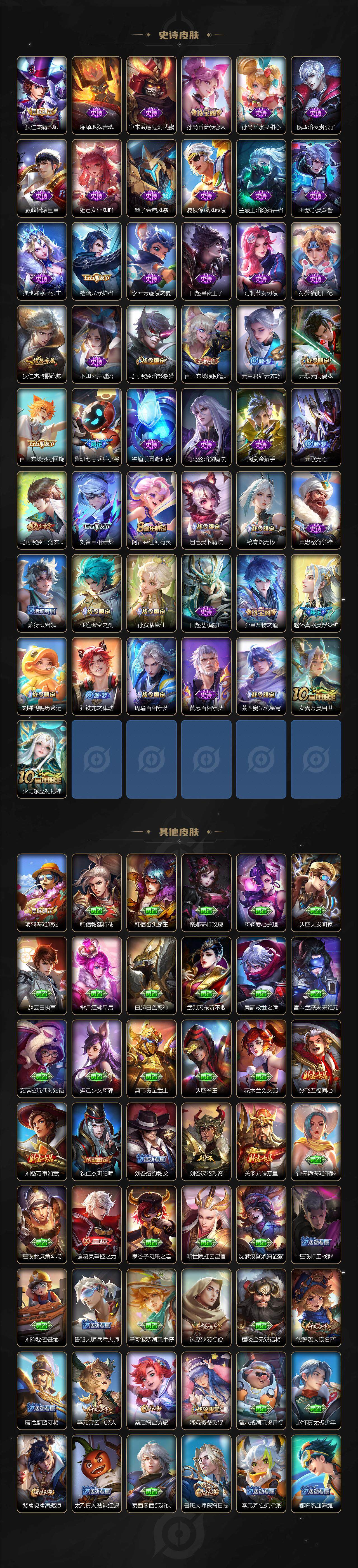 [14935816]v7-126英雄-199皮肤-1典藏皮肤-1无双-17传说-54史诗,ff5266 【英雄全皮】:孙权全皮,李信全皮,影全皮 【荣耀典藏】:铠银白咏叹调 【无双皮肤】:铠神罪 【传说皮肤】:澜愿照九州拓,虞姬愿照岁时盈,裴擒虎祥瑞亨通,桑启鸣野蒿,铠琥珀纪元,露娜霜月吟,大乔时之奇旅,李信山海炽霜斩,李白诗剑行,马超无双飞将,铠绛天战甲,镜炽阳神光,李信一念神魔,刘备时之恋人,达摩黄金狮子座,后羿黄金射手座,宫本武藏地狱之眼 【限定皮肤】:蒙犽顽岩魄,姜子牙天穹之誓,杨戬破阵退雄兵,狄仁杰阴阳师,赵云皇家上将,孙尚香蔷薇恋人,鲁班七号乒乒小将,元歌云间偶戏,元歌无心,马可波罗暗影游猎,马可波罗山海玄木吟,狄仁杰魔术师,达摩沙漠行僧,项羽海滩派对,刘备百相守梦,李元芳云中旅人,大乔时之奇旅,百里玄策原初追逐者,沈梦溪大漠名商,裴擒虎擒涛扼浪,云中君纤云弄巧,李信山海炽霜斩,嫦娥暖冬兔眠,鲁班大师探海日志,桑启海盐诗旅,阿古朵江河有灵,张良古海寻踪,妲己灵卜魔法,鬼谷子天穹祈灯,铠琥珀纪元,沈梦溪龙舞盛年,刘邦剑破天穹,程咬金群星魔术团,镜青焰无极,项羽苍威无极,周瑜熔金海岸 【年限皮肤】:马可波罗山海玄木吟,李信山海炽霜斩 【赛季限定】:达摩沙漠行僧,张良古海寻踪,李元芳云中旅人,百里玄策原初追逐者,沈梦溪大漠名商,裴擒虎擒涛扼浪,鲁班大师探海日志,桑启海盐诗旅,鬼谷子天穹祈灯,刘邦剑破天穹,姜子牙天穹之誓 【战令限定】:元歌云间偶戏,马可波罗暗影游猎,嫦娥暖冬兔眠,妲己灵卜魔法,镜青焰无极,项羽苍威无极 【史诗皮肤】:露娜紫霞仙子,赵云皇家上将,赵云未来纪元,貂蝉圣诞恋歌,甄姬冰雪圆舞曲,王昭君偶像歌手,狄仁杰魔术师,廉颇地狱岩魂,宫本武藏鬼剑武藏,孙尚香蔷薇恋人,孙尚香水果甜心,嬴政暗夜贵公子,嬴政摇滚巨星,妲己女仆咖啡,墨子金属风暴,夏侯惇乘风破浪,兰陵王暗隐猎兽者,亚瑟心灵战警,雅典娜冰冠公主,铠曙光守护者,李元芳逐浪之夏,白起星夜王子,阿轲节奏热浪,孙策猫狗日记,狄仁杰鹰眼统帅,不知火舞魅语,马可波罗暗影游猎,百里玄策原初追逐者,云中君纤云弄巧,元歌云间偶戏,百里玄策热力回旋,鲁班七号乒乒小将,钟馗乐园奇幻夜,司马懿暗渊魔法,澜赏金猎手,元歌无心,马可波罗山海玄木吟,刘备百相守梦,阿古朵江河有灵,妲己灵卜魔法,镜青焰无极,黄忠怒海争锋,蒙犽顽岩魄,亚连破空