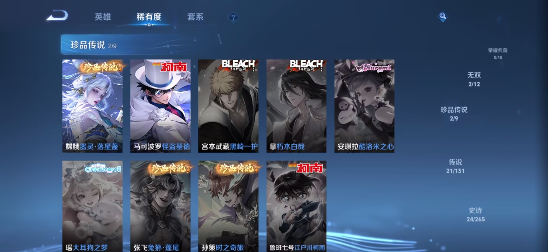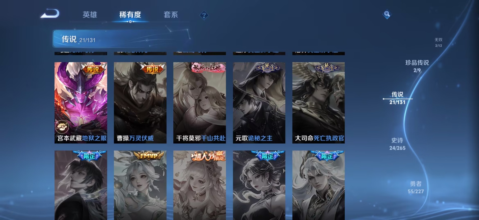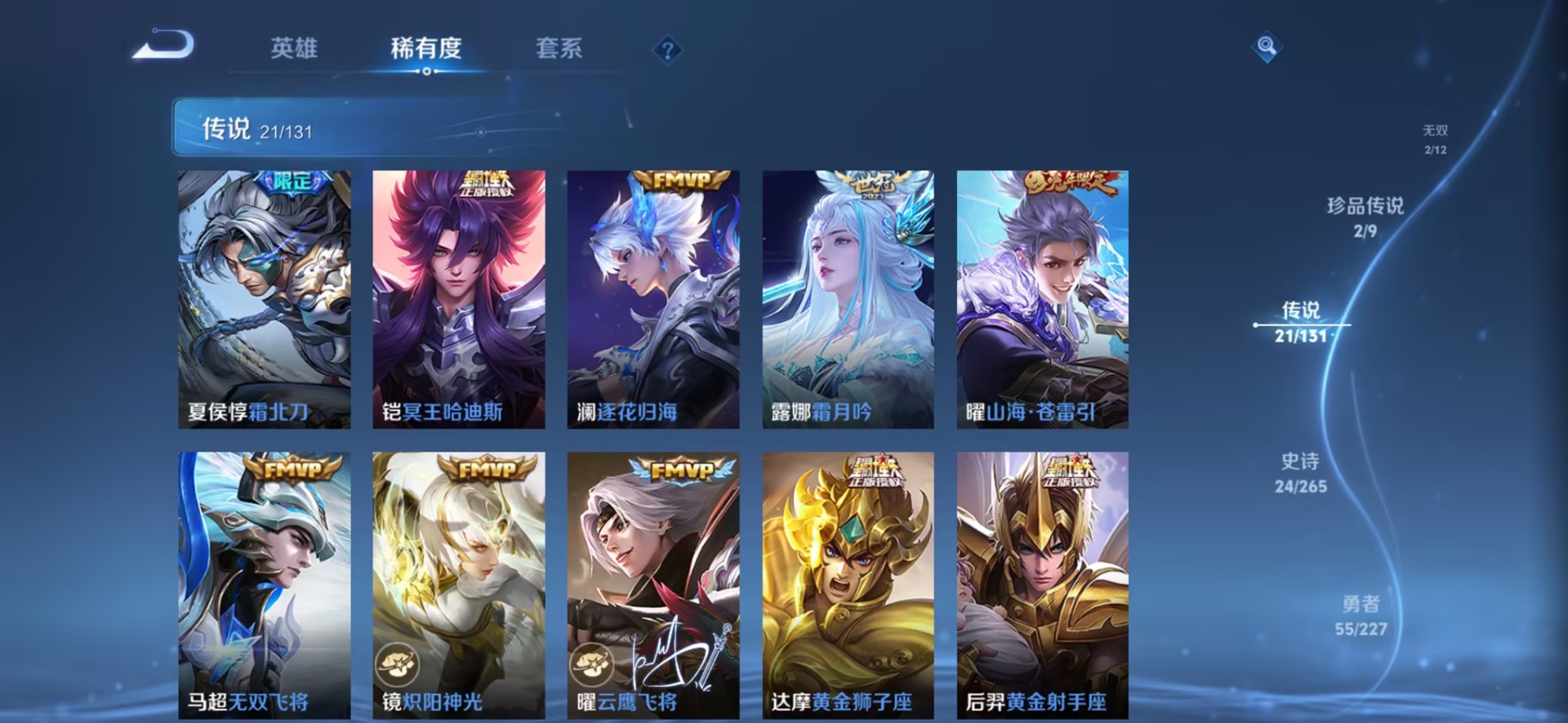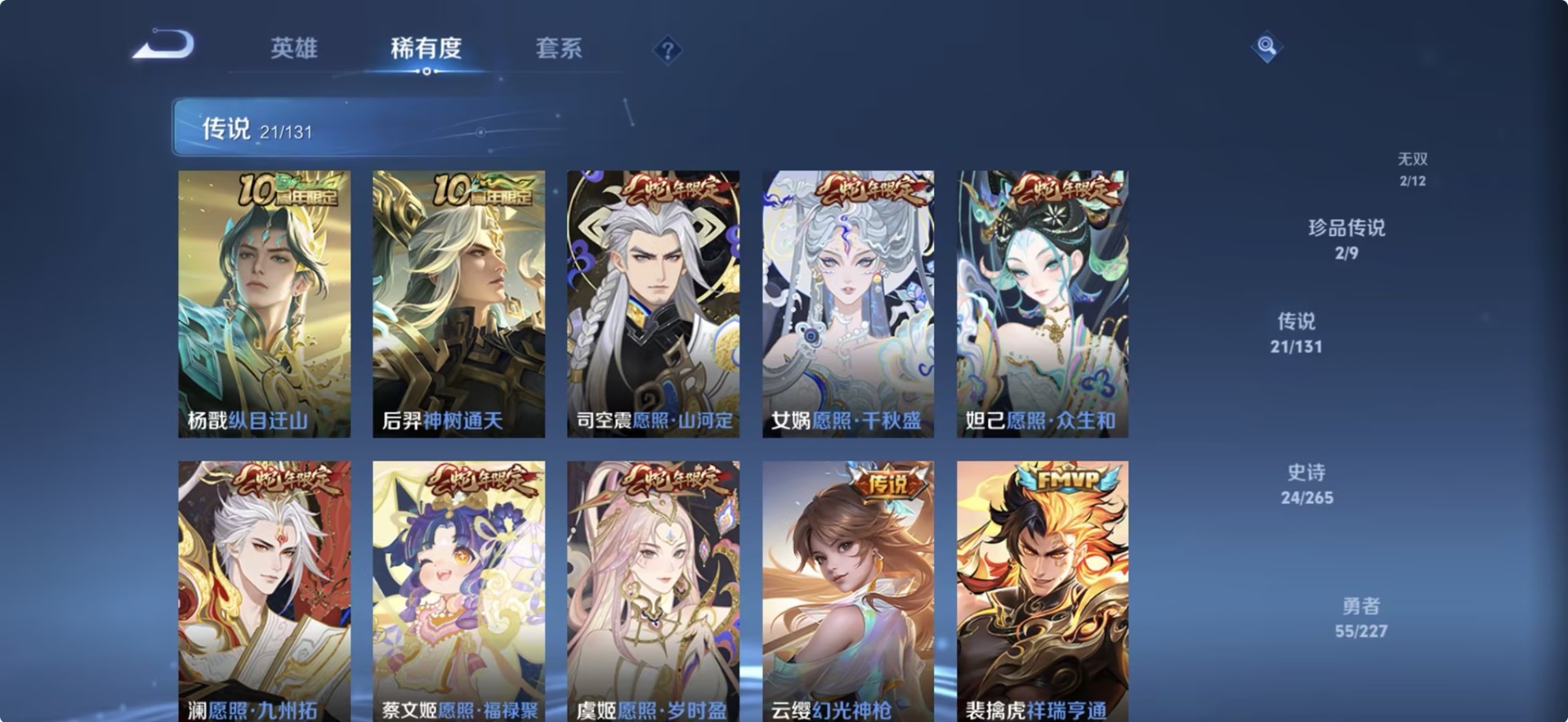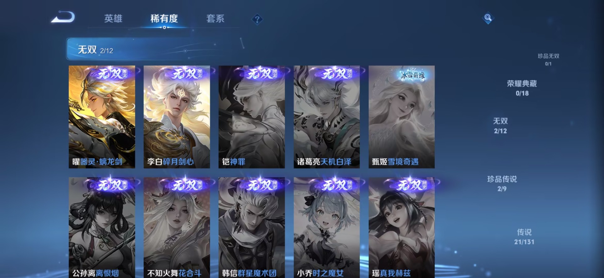 126英雄-132皮肤-[]v7 2无双 2珍品传说 21传说 126英雄 132皮肤 可修改实名 【英雄全皮】:敖隐全皮蚩奼全皮 【稀有英雄】:敖隐小龙人大司命韩信韩跳跳夏洛特夏师傅艾琳橘右京橘子娜可露露鸟人不知火舞赵云金蝉唐僧戈娅 【无双皮】:器灵·螭龙剑