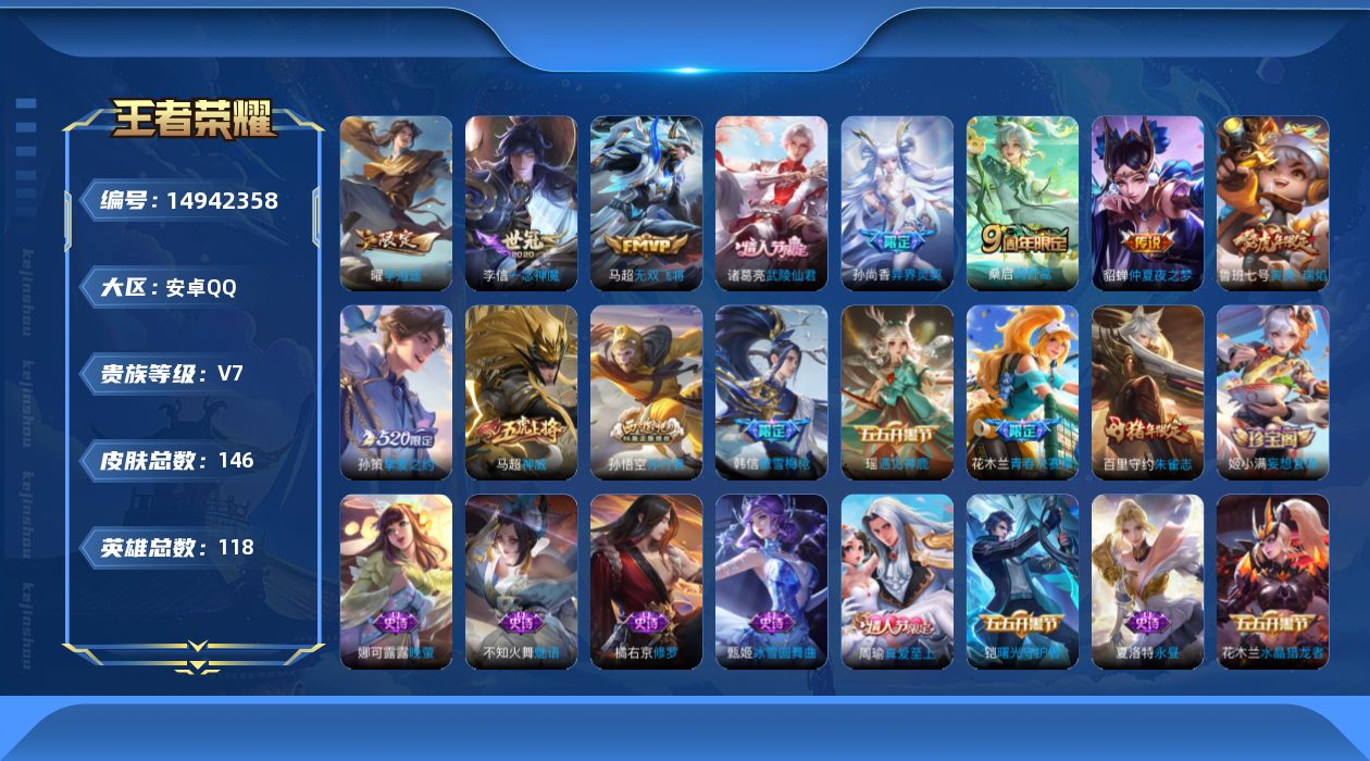 [14942358]v7 10传说 118英雄 146皮肤 可修改实名 【稀有英雄】:大司命韩信韩跳跳夏洛特夏师傅艾琳橘右京橘子娜可露露鸟人不知火舞赵云金蝉唐僧戈娅 【传说皮】:神树通天李仲夏夜之梦大飞蛾一念神魔无双飞将挚爱之约 【珍宝阁皮】:妄想食味蔷薇恋人玩趣恶龙 【赛季/战令皮】:噬灭天穹s37古海寻踪s33擒涛扼浪s31探海日志s32剑破天穹s35天穹祈灯s34演武夺筹s23驱傩正仪s24千军破阵s25神迹守卫-墨子航海奇遇记圣弓游侠真爱魔法火炮绅士沙漠行僧s26幻夜卜梦吟游魔法夜都怪侠金庭之子s27大漠名商s28云中旅人s29 【史诗皮】:遇见神鹿黄金分割率千年之狐永昼江河有灵百解令蒙犽冰冠公主偶像歌手晚萤魅语猫狗日记-孙策乱世虎臣节奏热浪修罗女仆咖啡水果甜心天才门将星夜王子心灵骇客德古拉伯爵暗隐猎兽者幽灵船长鬼剑武藏舞动绿茵地狱岩魂纤云弄巧拒霜思乘风破浪逐浪之夏水晶猎龙者曙光守护者金属风暴圣诞恋歌鹰眼统帅魅力维加斯寅虎·御盾未来纪元-赵云 【限定皮】:鸣野蒿武陵仙君小桃花异界灵契白毛香傲雪梅呛寅虎·展翼孙膑年限神威电光马子高山流水梁祝逐梦之影朱雀志守约年限真爱至上纯白花嫁孙行者青春决赛季寅虎·御盾廉颇年限寅虎·瑞焰虎皮蛋子神器·万象笔 【普通皮】:神迹守卫刘邦虎啸剑宗暗都幽影程咬金群星魔术团春野之旅龙舞盛年鹤鸣心笺灵卦秘语聚星闪耀零食大作战妄想特派热血海滩王牌新星破局者完美运算鬼谷子天穹祈灯s34胡桃狂想曲蔚蓝守将五福同心龙腾万里归虚梦演-曜归虚梦演-西施海滩派对皇家上将魔术师沉稳之力掌控之力化身博士特工战影圆桌骑士(盾山)乓乓大师大发明家红桃皇后阴阳师兔女郎死亡骑士丁香结秘密基地白色死神野性能量冰雪圆舞曲未来纪元-宫本武藏拳王圣弓游侠玩偶对对碰制霸全明星虹云星官孤猎灼热之刃幸存者剑舞者踏雪寻梅龙域领主维京掠夺者异域舞娘激情绿茵启蛰森午夜歌剧院花间舞绝影神呛特种部队