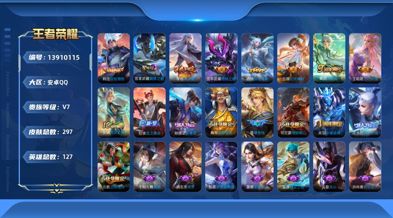[13910115]【店主推荐捡漏号!可直接换绑1天幕】安卓q-v7-永恒钻石i段位-127英雄-297皮肤-1典藏-7传说-86史诗 【英雄全皮】:刘邦全皮,蒙恬全皮 【荣耀典藏】:韩信弑呛猎影 【传说皮肤】:后羿神树通天,云缨幻光神呛,桑启鸣野蒿,王昭君乞巧织情,西施游龙清影,李白凤求凰,宫本武藏地狱之眼 【限定皮肤】:白起狰,暃埋骨钱,蒙犽顽岩魄,蔡文姬夏日便利店,虞姬夏日便利店,姜子牙天穹之誓,狄仁杰阴阳师,虞姬凯尔特女王,赵云皇家上将,嬴政白昼王子,孙尚香蔷薇恋人,庄周蜃楼王,高渐离死亡摇滚,钟无艳超时空战士,孙膑妖精王,扁鹊炼金王,扁鹊奇幻香踪,芈月重明,吕布猎兽之王,元歌云间偶戏,元歌无心,夏侯惇朔风刀,甄姬游园惊梦,甄姬落雪兰心,曹操烛龙,典韦穷奇,典韦蓝屏警告,狄仁杰魔术师,狄仁杰万华元夜,达摩沙漠行僧,项羽海滩派对,老夫子航海奇遇记,关羽冰锋战神,关羽百相守梦,程咬金演武夺筹,刘邦夺宝奇兵,花木兰默契交锋,亚瑟狮心王,亚瑟潮玩骑士王,孙悟空至尊宝,牛魔御旌,后羿圣弓游侠,李元芳云中旅人,钟馗驱傩正仪,杨玉环遇见飞天,杨戬潮玩骑兵,女娲朔望之晖,太乙真人饕餮,鬼谷子原初探秘者,鬼谷子五谷丰年,苏烈千军破阵,弈星混沌棋,沈梦溪星空之诺,沈梦溪大漠名商,明世隐疑决卦,裴擒虎擒涛扼浪,狂铁御狮,米莱狄御霄,盾山御銮,嫦娥暖冬兔眠,西施玲珑珍味,鲁班大师探海日志,桑启海盐诗旅,暃星界游侠,戈娅驭风魔法,艾琳流音漫舞,司空震地狱燃心,阿古朵江河有灵,张良古海寻踪,蒙恬荣光圣徽,高渐离燃音魔法,妲己灵卜魔法,鬼谷子天穹祈灯,伽罗琥珀纪元,沈梦溪龙舞盛年,鲁班七号蔬乡物语,李元芳蔬乡物语,刘邦剑破天穹,程咬金群星魔术团,镜青焰无极,项羽苍威无极 【年限皮肤】:李白凤求凰 【赛季限定】:庄周蜃楼王,孙膑妖精王,扁鹊炼金王,白起狰,芈月重明,夏侯惇朔风刀,曹操烛龙,典韦穷奇,狄仁杰万华元夜,达摩沙漠行僧,程咬金演武夺筹,张良古海寻踪,亚瑟狮心王,牛魔御旌,李元芳云中旅人,虞姬凯尔特女王,钟馗驱傩正仪,太乙真人饕餮,鬼谷子原初探秘者,苏烈千军破阵,弈星混沌棋,沈梦溪大漠名商,明世隐疑决卦,裴擒虎擒涛扼浪,狂铁御狮,米莱狄御霄,盾山御銮,鲁班大师探海日志,桑启海盐诗旅,鬼谷子天穹祈灯,蒙恬荣光圣徽,刘邦剑破天穹,姜子牙天穹之誓 【战令限定】:蔡文姬夏日便利店,虞姬夏日便利店,嬴政白昼王子