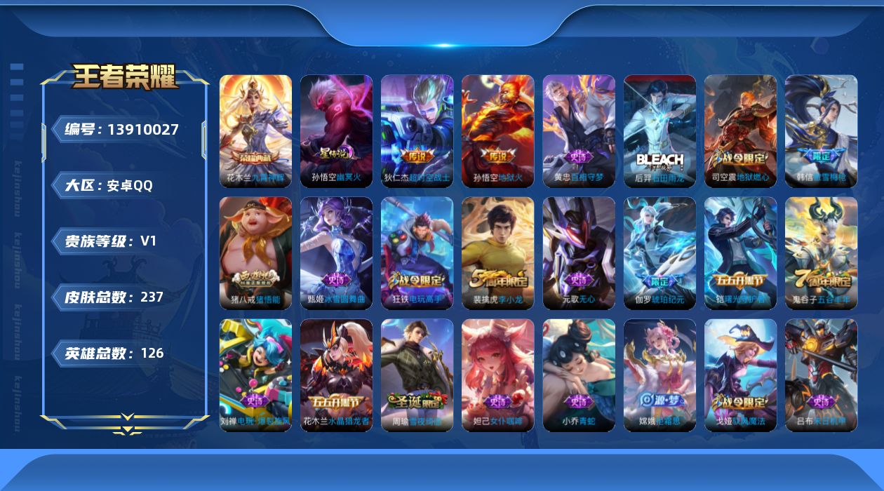 [13910027]可二次【店主推荐捡漏号!可直接换绑】安卓q-v6-至尊星耀i段位-126英雄-237皮肤-1典藏-2传说-59史诗 【英雄全皮】:戈娅全皮 【荣耀典藏】:花木兰九霄神辉 【传说皮肤】:孙悟空地狱火,狄仁杰超时空战士 【限定皮肤】:大乔绒语心约,姜子牙天穹之誓,狄仁杰阴阳师,赵云皇家上将,墨子神迹守卫,孙尚香蔷薇恋人,庄周高山流水,高渐离玩趣恶龙,白起夜都怪侠,芈月幻夜卜梦,元歌无心,曹操烛龙,狄仁杰魔术师,狄仁杰万华元夜,达摩沙漠行僧,项羽海滩派对,老夫子醍醐杖,程咬金演武夺筹,韩信傲雪梅呛,王昭君午后时光,兰陵王金庭之子,后羿圣弓游侠,李元芳匿光侦查者,李元芳云中旅人,钟馗驱傩正仪,太乙真人饕餮,鬼谷子原初探秘者,鬼谷子五谷丰年,黄忠火炮绅士,苏烈千军破阵,弈星混沌棋,沈梦溪大漠名商,明世隐疑决卦,明世隐吟游魔法,裴擒虎李小龙,裴擒虎擒涛扼浪,狂铁电玩高手,云中君纤云弄巧,盾山御銮,猪八戒猪悟能,嫦娥拒霜思,西施玲珑珍味,鲁班大师探海日志,桑启海盐诗旅,戈娅驭风魔法,艾琳流音漫舞,司空震地狱燃心,阿古朵江河有灵,张良古海寻踪,蒙犽百解令,高渐离燃音魔法,妲己灵卜魔法,鬼谷子天穹祈灯,伽罗琥珀纪元,沈梦溪龙舞盛年,鲁班七号蔬乡物语,李元芳蔬乡物语,刘邦剑破天穹,周瑜熔金海岸 【赛季限定】:曹操烛龙,狄仁杰万华元夜,达摩沙漠行僧,老夫子醍醐杖,程咬金演武夺筹,兰陵王金庭之子,张良古海寻踪,李元芳云中旅人,钟馗驱傩正仪,太乙真人饕餮,鬼谷子原初探秘者,苏烈千军破阵,弈星混沌棋,沈梦溪大漠名商,明世隐疑决卦,裴擒虎擒涛扼浪,盾山御銮,鲁班大师探海日志,桑启海盐诗旅,鬼谷子天穹祈灯,刘邦剑破天穹,姜子牙天穹之誓 【战令限定】:墨子神迹守卫,白起夜都怪侠,芈月幻夜卜梦,王昭君午后时光,艾琳流音漫舞,后羿圣弓游侠,黄忠火炮绅士,明世隐吟游魔法,狂铁电玩高手,西施玲珑珍味,司空震地狱燃心,戈娅驭风魔法,高渐离燃音魔法,妲己灵卜魔法,鲁班七号蔬乡物语,李元芳蔬乡物语 【史诗皮肤】:赵云皇家上将,赵云未来纪元,貂蝉圣诞恋歌,甄姬冰雪圆舞曲,王昭君偶像歌手,狄仁杰魔术师,廉颇地狱岩魂,宫本武藏鬼剑武藏,孙尚香蔷薇恋人,孙尚香水果甜心,嬴政摇滚巨星,妲己女仆咖啡,墨子金属风暴,吕布圣诞狂欢,刘禅绅士熊喵,吕布末日机甲,张飞乱世虎臣,花木兰水晶猎龙者,刘邦德古拉伯爵,夏侯惇乘风破浪,小乔