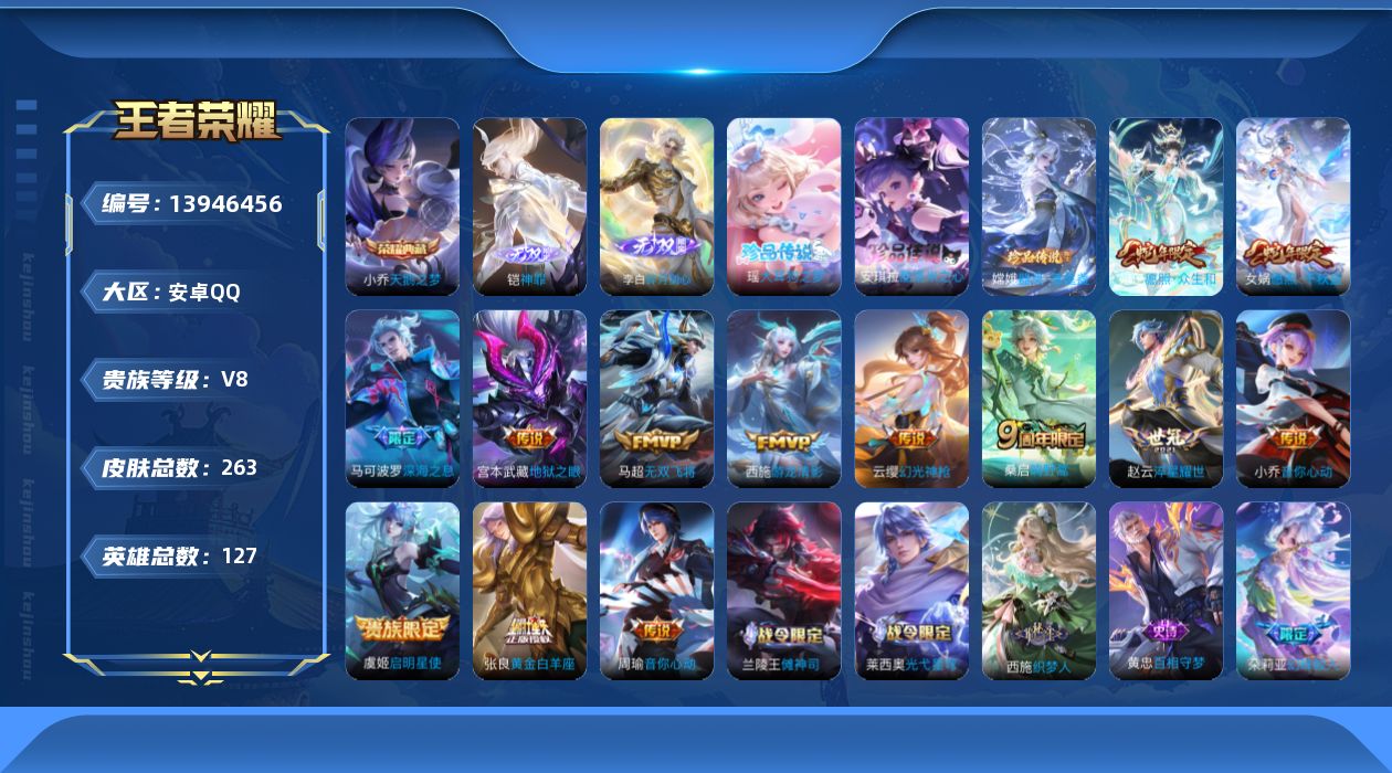[13946456]可二次【店主推荐捡漏号!可直接换绑】:安卓q-v8-最强王者段位-127英雄-263皮肤-1典藏-2无双-3珍品传说-13传说-68史诗 【英雄全皮】:孙权全皮,空空儿全皮 【荣耀典藏】:小乔天鹅之梦 【无双皮肤】:李白碎月剑心,铠神罪 【珍品传说】:嫦娥器灵落星盏,瑶大耳狗之梦,安琪拉酷洛米之心 【传说皮肤】:女娲愿照千秋盛,妲己愿照众生和,云缨幻光神呛,桑启鸣野蒿,马可波罗深海之息,马超无双飞将,赵云淬星耀世,西施游龙清影,周瑜音你心动,小乔音你心动,虞姬启明星使,张良黄金白羊座,宫本武藏地狱之眼 【限定皮肤】:蒙犽顽岩魄,蔡文姬夏日便利店,大乔绒语心约,虞姬夏日便利店,姜子牙天穹之誓,狄仁杰阴阳师,赵云皇家上将,墨子神迹守卫,嬴政优雅恋人,鲁班七号狮舞东方,白起夜都怪侠,芈月幻夜卜梦,典韦岱宗,马可波罗暗影游猎,马可波罗深海之息,狄仁杰魔术师,狄仁杰万华元夜,达摩星际陆战队,达摩沙漠行僧,项羽海滩派对,老夫子醍醐杖,老夫子航海奇遇记,安琪拉魔法小厨娘,程咬金演武夺筹,兰陵王金庭之子,亚瑟潮玩骑士王,李元芳云中旅人,虞姬启明星使,钟馗驱傩正仪,干将莫邪冰霜恋舞曲,雅典娜单词大作战,蔡文姬奇迹圣诞,蔡文姬繁星吟游,鬼谷子原初探秘者,苏烈千军破阵,百里玄策原初追逐者,沈梦溪大漠名商,明世隐疑决卦,明世隐吟游魔法,裴擒虎擒涛扼浪,云中君纤云弄巧,猪八戒西部大镖客,西施玲珑珍味,蒙犽狂想玩偶喵,鲁班大师探海日志,艾琳女武神,艾琳流音漫舞,张良古海寻踪,妲己灵卜魔法,李白碎月剑心,李元芳蔬乡物语,刘邦剑破天穹,程咬金群星魔术团,镜青焰无极,项羽苍威无极,周瑜熔金海岸 【年限皮肤】:典韦岱宗 【赛季限定】:狄仁杰万华元夜,达摩沙漠行僧,老夫子醍醐杖,程咬金演武夺筹,兰陵王金庭之子,张良古海寻踪,李元芳云中旅人,钟馗驱傩正仪,鬼谷子原初探秘者,苏烈千军破阵,百里玄策原初追逐者,沈梦溪大漠名商,明世隐疑决卦,裴擒虎擒涛扼浪,鲁班大师探海日志,刘邦剑破天穹,姜子牙天穹之誓 【战令限定】:墨子神迹守卫,蔡文姬夏日便利店,虞姬夏日便利店,鲁班七号狮舞东方,白起夜都怪侠,芈月幻夜卜梦,马可波罗暗影游猎,达摩星际陆战队,老夫子航海奇遇记,艾琳流音漫舞,亚瑟潮玩骑士王,雅典娜单词大作战,明世隐吟游魔法,猪八戒西部大镖客,西施玲珑珍味,蒙犽狂想玩偶喵,妲己灵卜魔法,李元芳蔬乡物语,镜青焰无