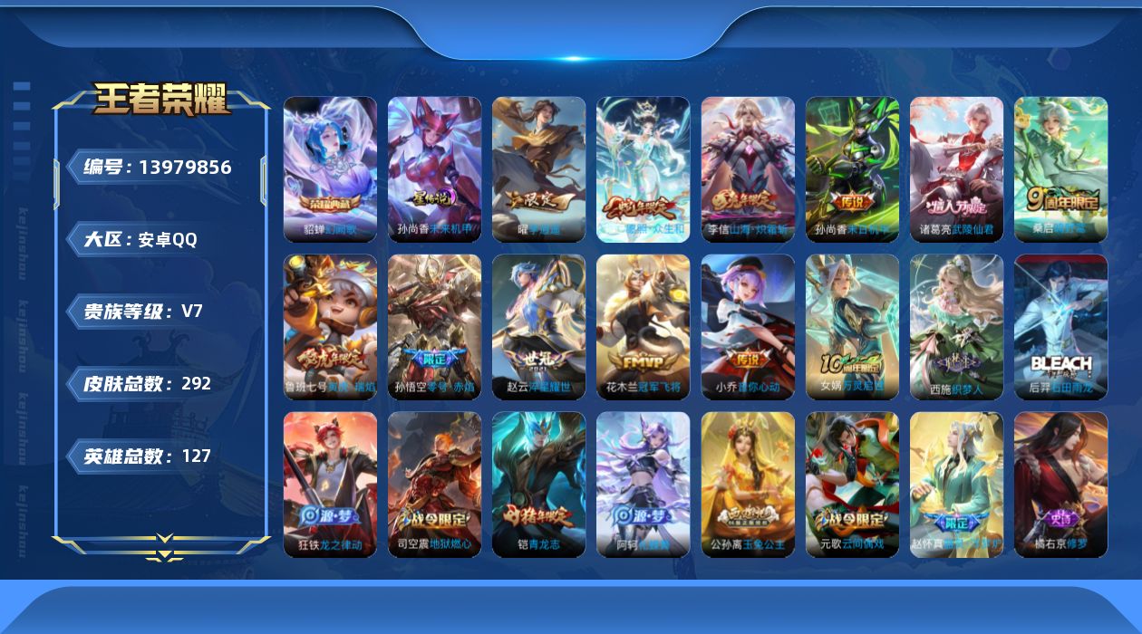 [13979856]【店主推荐捡漏号!可直接换绑】安卓q-v7-至尊星耀iii段位-127英雄-292皮肤-1典藏-12传说-73史诗 【英雄全皮】:鬼谷子全皮,蒙恬全皮,戈娅全皮 【荣耀典藏】:貂蝉幻阙歌 【传说皮肤】:后羿神树通天,妲己愿照众生和,桑启鸣野蒿,李信山海炽霜斩,鲁班七号寅虎瑞焰,赵云淬星耀世,曜李 ,小乔音你心动,孙悟空零号赤焰,花木兰冠军飞将,诸葛亮武陵仙君,孙尚香末日机甲 【限定皮肤】:姜子牙天穹之誓,狄仁杰阴阳师,赵云皇家上将,墨子神迹守卫,嬴政优雅恋人,鲁班七号乒乒小将,鲁班七号寅虎瑞焰,庄周高山流水,高渐离死亡摇滚,高渐离玩趣恶龙,钟无艳超时空战士,扁鹊奇幻香踪,白起夜都怪侠,芈月幻夜卜梦,元歌云间偶戏,甄姬游园惊梦,甄姬落雪兰心,狄仁杰魔术师,狄仁杰万华元夜,达摩星际陆战队,达摩沙漠行僧,项羽海滩派对,老夫子航海奇遇记,程咬金演武夺筹,王昭君午后时光,兰陵王金庭之子,亚瑟潮玩骑士王,孙悟空零号赤焰,后羿圣弓游侠,李元芳云中旅人,钟馗神迹守卫,钟馗驱傩正仪,杨戬潮玩骑兵,干将莫邪真爱魔法,雅典娜黎明之约,太乙真人华丽摇滚,鬼谷子原初探秘者,鬼谷子五谷丰年,诸葛亮武陵仙君,黄忠火炮绅士,铠青龙志,苏烈千军破阵,百里玄策原初追逐者,梦奇顽趣,公孙离玉兔公主,沈梦溪大漠名商,明世隐吟游魔法,裴擒虎擒涛扼浪,狂铁电玩高手,米莱狄胡桃异想国,云中君纤云弄巧,李信山海炽霜斩,上官婉儿梁祝,嫦娥拒霜思,嫦娥暖冬兔眠,曜李 ,西施玲珑珍味,鲁班大师探海日志,桑启海盐诗旅,暃星界游侠,戈娅驭风魔法,艾琳流音漫舞,司空震地狱燃心,阿古朵江河有灵,张良古海寻踪,蒙犽百解令,蒙恬荣光圣徽,高渐离燃音魔法,妲己灵卜魔法,鬼谷子天穹祈灯,沈梦溪龙舞盛年,刘邦剑破天穹,程咬金群星魔术团,周瑜熔金海岸 【年限皮肤】:铠青龙志,鲁班七号寅虎瑞焰,李信山海炽霜斩 【赛季限定】:狄仁杰万华元夜,达摩沙漠行僧,程咬金演武夺筹,兰陵王金庭之子,张良古海寻踪,李元芳云中旅人,钟馗驱傩正仪,雅典娜黎明之约,鬼谷子原初探秘者,苏烈千军破阵,百里玄策原初追逐者,梦奇顽趣,沈梦溪大漠名商,裴擒虎擒涛扼浪,鲁班大师探海日志,桑启海盐诗旅,鬼谷子天穹祈灯,蒙恬荣光圣徽,刘邦剑破天穹,姜子牙天穹之誓 【战令限定】:墨子神迹守卫,钟无艳超时空战士,扁鹊奇幻香踪,白起夜都怪侠,芈月幻夜卜梦,元歌云间偶戏,甄姬