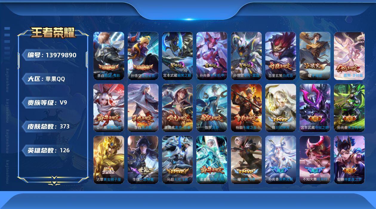 [13979890]【店主推荐捡漏号!可直接换绑】苹果q-v9-至尊星耀i段位-126英雄-373皮肤-2典藏-30传说-118史诗 【英雄全皮】:盾山全皮,猪八戒全皮 【荣耀典藏】:孙悟空全息碎影,李白鸣剑曳影 【传说皮肤】:虞姬愿照岁时盈,不知火舞绯月行,王昭君星穹之声,百里守约碎云,马超无双飞将,裴擒虎寅虎赤拳,鲁班七号寅虎瑞焰,孙尚香异界灵契,曜李 ,公孙离祈雪灵祝,诸葛亮时雨天司,镜炽阳神光,虞姬启明星使,孙悟空零号赤焰,曜云鹰飞将,李信一念神魔,伽罗太华,貂蝉猫影幻舞,张良黄金白羊座,干将莫邪久胜战神,虞姬云霓雀翎,达摩黄金狮子座,百里玄策白虎志,后羿黄金射手座,杨戬永曜之星,貂蝉仲夏夜之梦,李白凤求凰,孙尚香末日机甲,宫本武藏地狱之眼,孙悟空地狱火 【限定皮肤】:白起狰,狄仁杰阴阳师,赵云皇家上将,墨子神迹守卫,妲己时之彼端,嬴政优雅恋人,嬴政白昼王子,孙尚香蔷薇恋人,孙尚香异界灵契,鲁班七号狮舞东方,鲁班七号寅虎瑞焰,庄周玄嵩,庄周高山流水,高渐离死亡摇滚,高渐离玩趣恶龙,阿轲迷踪丽影,钟无艳超时空战士,孙膑天狼运算者,芈月重明,芈月白晶晶,芈月幻夜卜梦,吕布猎兽之王,周瑜赤莲之焰,元歌云间偶戏,元歌无心,夏侯惇朔风刀,甄姬幽恒,甄姬女儿国国王,甄姬游园惊梦,甄姬落雪兰心,曹操烛龙,曹操天狼征服者,典韦穷奇,典韦蓝屏警告,典韦岱宗,马可波罗逐梦之星,马可波罗暗影游猎,狄仁杰魔术师,狄仁杰万华元夜,达摩星际陆战队,达摩沙漠行僧,项羽海滩派对,老夫子圣诞老人,老夫子醍醐杖,老夫子航海奇遇记,关羽冰锋战神,程咬金演武夺筹,露娜一生所爱,刘邦夺宝奇兵,韩信逐梦之影,韩信飞衡,韩信傲雪梅呛,王昭君凤凰于飞,王昭君星穹之声,兰陵王驯魔猎人,兰陵王金庭之子,花木兰瑞麟志,花木兰默契交锋,不知火舞绯月行,亚瑟潮玩骑士王,孙悟空大圣娶亲,孙悟空零号赤焰,孙悟空孙行者,牛魔御旌,后羿辉光之辰,后羿如梦令,后羿圣弓游侠,李元芳银河之约,李元芳云中旅人,虞姬霸王别姬,虞姬启明星使,钟馗神迹守卫,钟馗驱傩正仪,杨玉环遇见飞天,杨戬永曜之星,女娲朔望之晖,干将莫邪冰霜恋舞曲,干将莫邪真爱魔法,雅典娜单词大作战,雅典娜黎明之约,蔡文姬奇迹圣诞,蔡文姬繁星吟游,太乙真人饕餮,太乙真人华丽摇滚,鬼谷子原初探秘者,鬼谷子五谷丰年,诸葛亮时雨天司,黄忠火炮绅士,铠青龙志,苏烈千军破阵,百里玄策白虎志,