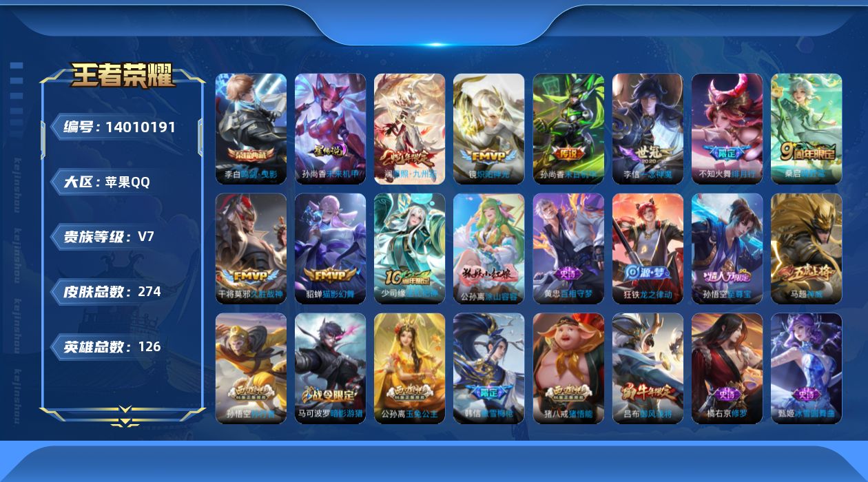 [14010191]【店主推荐捡漏号!可直接换绑】苹果q-v7-尊贵铂金iii段位-126英雄-274皮肤-1典藏-9传说-69史诗 【英雄全皮】:猪八戒全皮,蒙恬全皮,影全皮 【荣耀典藏】:李白鸣剑曳影 【传说皮肤】:后羿神树通天,澜愿照九州拓,桑启鸣野蒿,不知火舞绯月行,镜炽阳神光,李信一念神魔,貂蝉猫影幻舞,干将莫邪久胜战神,孙尚香末日机甲 【限定皮肤】:白起狰,姜子牙天穹之誓,狄仁杰阴阳师,虞姬凯尔特女王,赵云皇家上将,嬴政白昼王子,孙尚香蔷薇恋人,庄周蜃楼王,庄周高山流水,高渐离玩趣恶龙,钟无艳超时空战士,孙膑妖精王,扁鹊炼金王,芈月重明,芈月幻夜卜梦,吕布猎兽之王,吕布御风骁将,夏侯惇朔风刀,甄姬游园惊梦,甄姬落雪兰心,曹操烛龙,典韦穷奇,马可波罗暗影游猎,狄仁杰魔术师,狄仁杰万华元夜,达摩星际陆战队,达摩沙漠行僧,项羽海滩派对,老夫子醍醐杖,貂蝉逐梦之音,程咬金演武夺筹,韩信傲雪梅呛,兰陵王金庭之子,不知火舞绯月行,孙悟空至尊宝,孙悟空孙行者,牛魔御旌,后羿圣弓游侠,李元芳云中旅人,钟馗神迹守卫,钟馗驱傩正仪,杨玉环遇见飞天,女娲朔望之晖,干将莫邪真爱魔法,雅典娜黎明之约,蔡文姬繁星吟游,太乙真人饕餮,鬼谷子原初探秘者,鬼谷子五谷丰年,黄忠火炮绅士,苏烈千军破阵,百里玄策原初追逐者,弈星混沌棋,梦奇顽趣,公孙离玉兔公主,沈梦溪大漠名商,明世隐疑决卦,裴擒虎李小龙,裴擒虎擒涛扼浪,狂铁御狮,米莱狄御霄,米莱狄胡桃异想国,云中君纤云弄巧,猪八戒西部大镖客,猪八戒猪悟能,上官婉儿梁祝,蒙犽狂想玩偶喵,鲁班大师探海日志,桑启海盐诗旅,艾琳女武神,阿古朵江河有灵,张良古海寻踪,蒙恬荣光圣徽,鬼谷子天穹祈灯,沈梦溪龙舞盛年 【年限皮肤】:吕布御风骁将,马超神威 【赛季限定】:庄周蜃楼王,孙膑妖精王,扁鹊炼金王,白起狰,芈月重明,夏侯惇朔风刀,曹操烛龙,典韦穷奇,狄仁杰万华元夜,达摩沙漠行僧,老夫子醍醐杖,程咬金演武夺筹,兰陵王金庭之子,张良古海寻踪,牛魔御旌,李元芳云中旅人,虞姬凯尔特女王,钟馗驱傩正仪,雅典娜黎明之约,太乙真人饕餮,鬼谷子原初探秘者,苏烈千军破阵,百里玄策原初追逐者,弈星混沌棋,梦奇顽趣,沈梦溪大漠名商,明世隐疑决卦,裴擒虎擒涛扼浪,狂铁御狮,米莱狄御霄,鲁班大师探海日志,桑启海盐诗旅,鬼谷子天穹祈灯,蒙恬荣光圣徽,姜子牙天穹之誓 【战令限定】:嬴政白昼王子,钟无